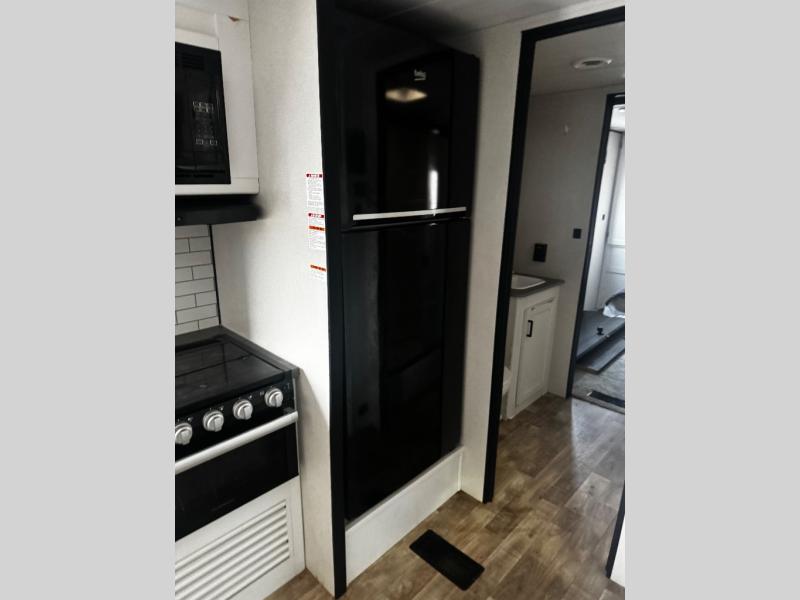 You will enjoy the front living area on this Hideout destination trailer because it has an L-shaped tri-fold sleeper sofa with an end table and an entertainment center with a fireplace, so you will be super cozy as you spend time relaxing or reading a book. The patio door is right next to this area, so you can look out at the beautiful scenery while you're lounging, and you can also add an optional tri-fold sleeper sofa to create even more lounge space. The residential refrigerator will help you stock up on food for the trip, and the 38" walk-in shower in the walk-through bathroom will allow you to get cleaned up after an early morning run.
