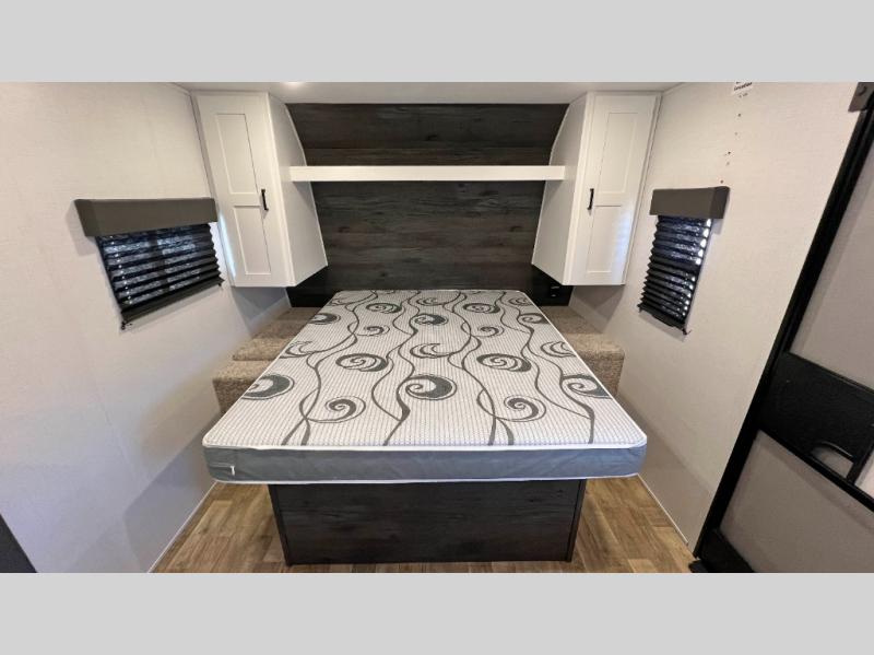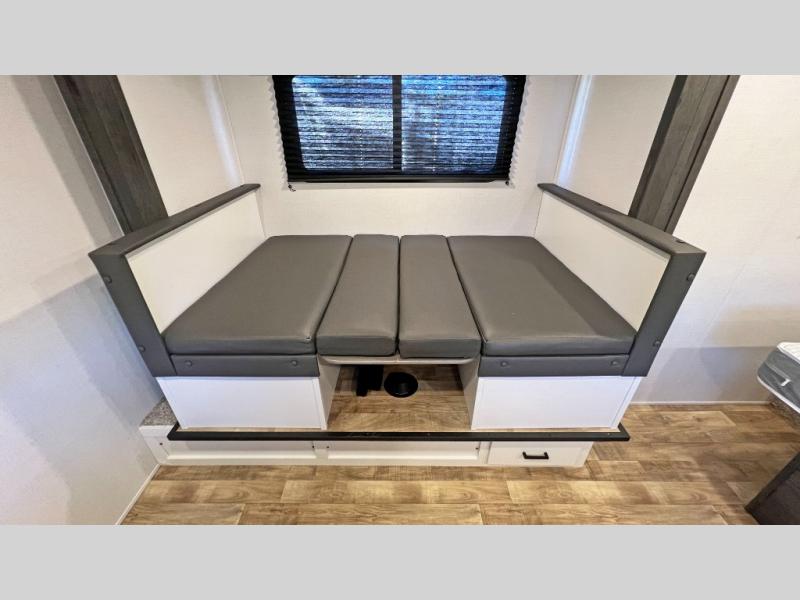 With any Keystone Hideout Single Axle travel trailer, there is an aluminum exterior allowing each to be lightweight for easy towing, the SolarFlex 200 so you can camp off-grid, tinted safety glass windows, and LCI SolidStep entry steps for stability when entering and exiting. The interior is light and airy, and includes a furnace, bedside outlets, blackout night shades, and more. You will also appreciate the Keystone exclusives such as the color-coded unified wiring, the 4G LTE and Wi-Fi prep, the Tuf-Lok thermoplastic duct joiners, the in-floor heating ducts, and the Tru-Fit slide construction.