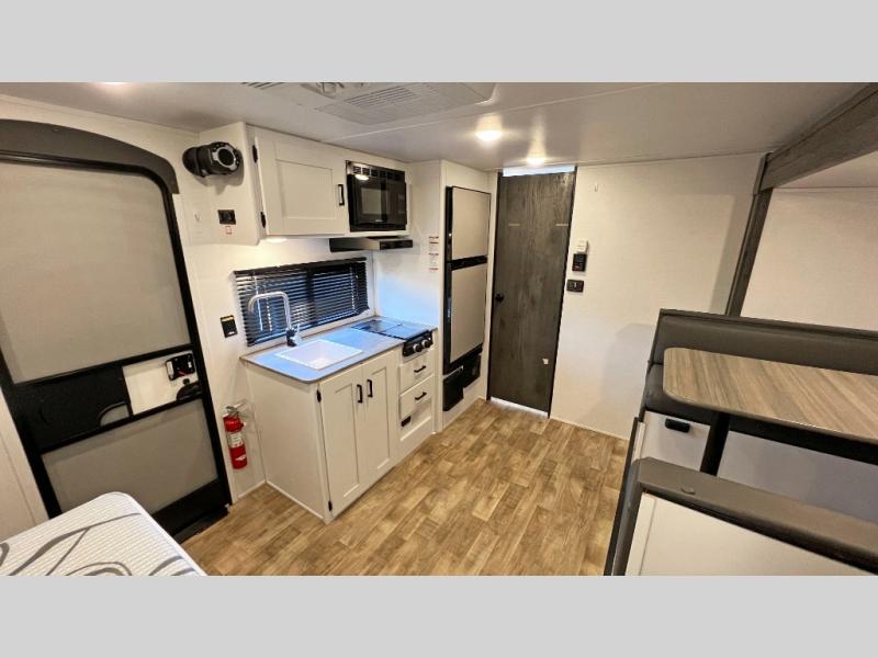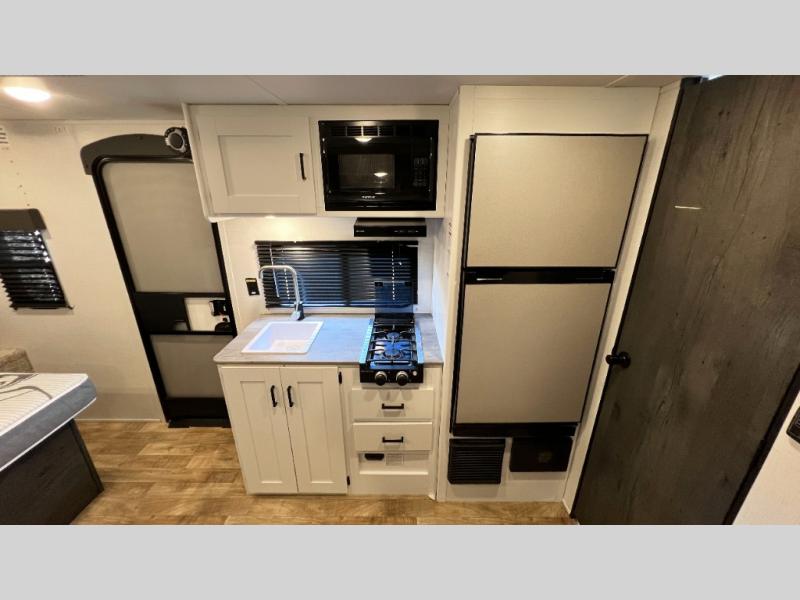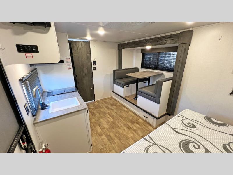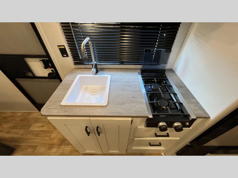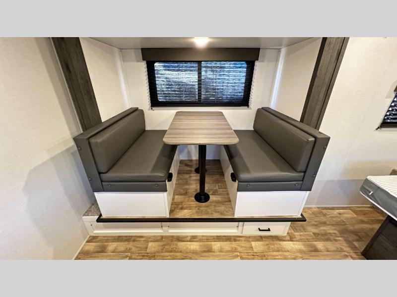 It's time to enjoy the great outdoors with family and friends at the campgrounds you like to meet everyone at! This trailer will allow three to four to camp comfortability with amenities such as a two burner gas range, a microwave, a 7.7 cu. ft. refrigerator and a spacious rear full bathroom. The booth dinette slide offers a place to dine, read a book and even provides sleeping space and drawers for storage. The slide gives the interior more floor space as well. And the walk-around queen-size bed has two nightstands and closets for storage.