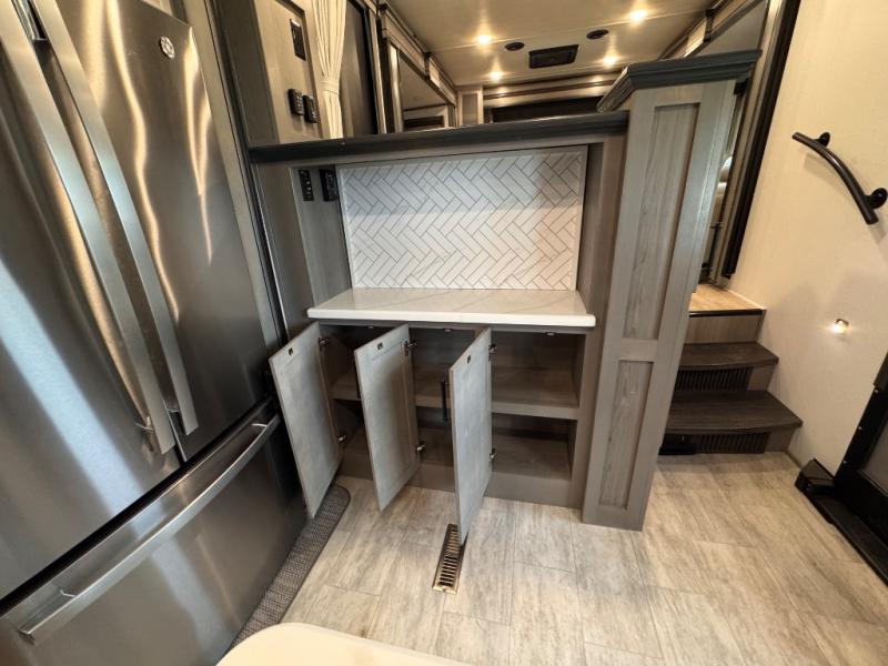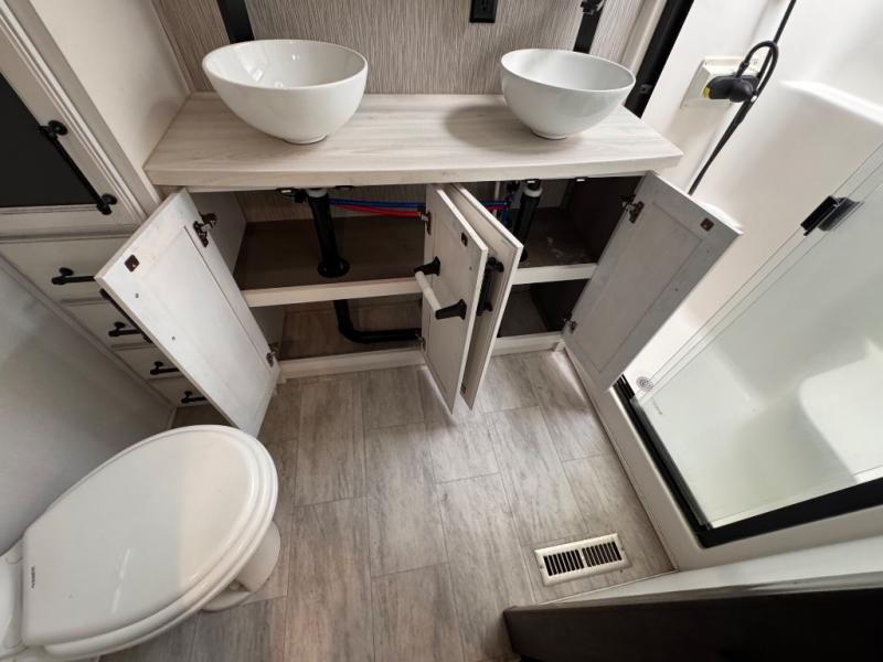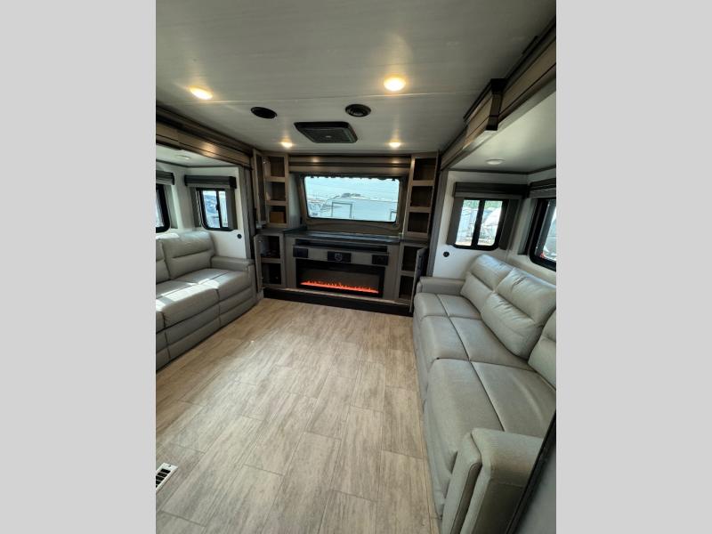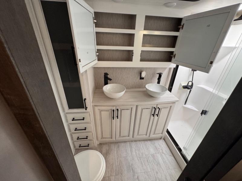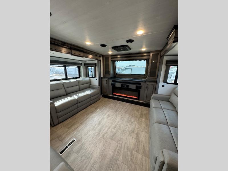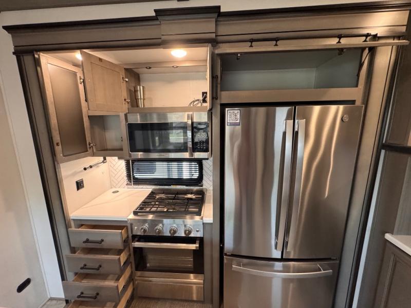 Life will be easier at the campground in this fifth wheel with a bath and a half! The full rear bathroom has a 48" x 30" fiberglass shower with a seat and skylight above, a linen closet to keep your towels close, a dual sink vanity for two to get ready at once, and a barn door to close off the master suite. The bedroom also has a king bed slide with storage underneath across from a dresser with a 32" Smart TV and wardrobe, as well as a large closet that is prepped to add an optional washer and dryer. The chef can prepare their best meals with the kitchen island, the glass top range with convection microwave and range hood with a pull-down spice rack, plus there is a pantry/buffet and a free standing legless dinette to enjoy your meals at. The front living area will have you feeling right at home with the front entertainment center that has a telescoping 50" Smart TV, a 5,000 BTU decorative fireplace heater, and storage on either side. There is also opposing hide-a-bed sofa slides for extra sleeping spaces and power Thomas Payne theater seating for even more comfort!