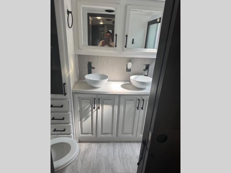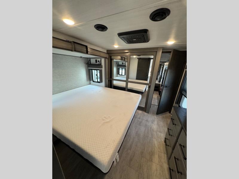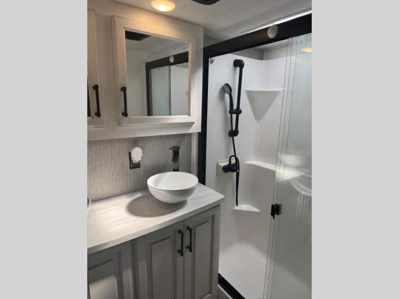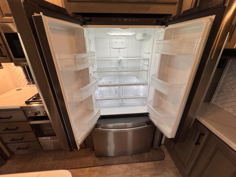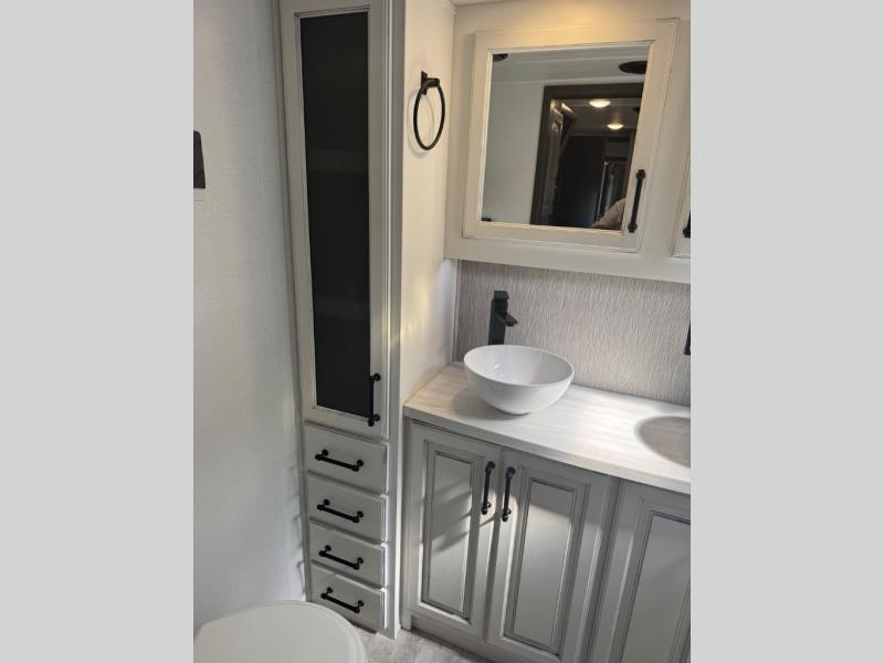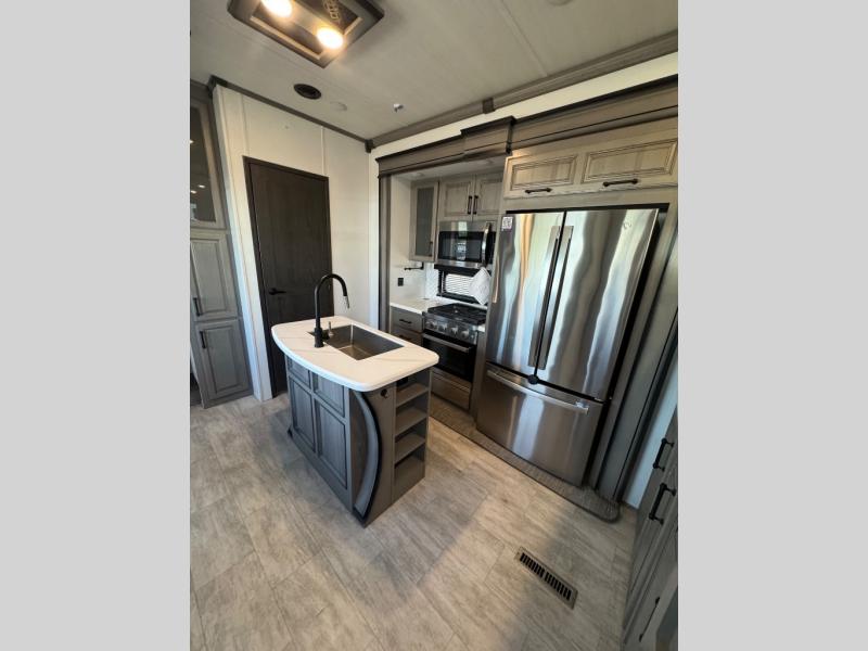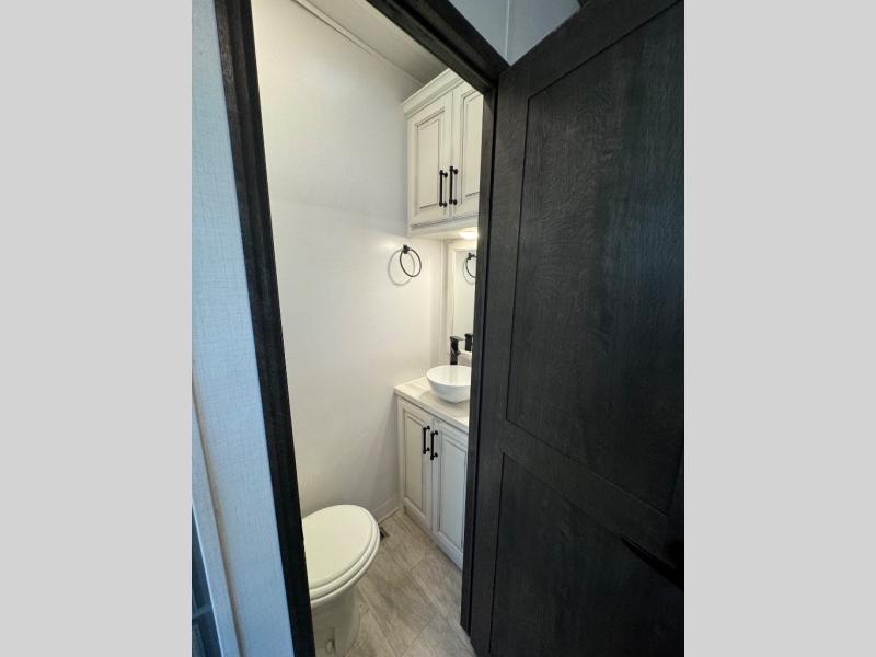 Life will be easier at the campground in this fifth wheel with a bath and a half! The full rear bathroom has a 48" x 30" fiberglass shower with a seat and skylight above, a linen closet to keep your towels close, a dual sink vanity for two to get ready at once, and a barn door to close off the master suite. The bedroom also has a king bed slide with storage underneath across from a dresser with a 32" Smart TV and wardrobe, as well as a large closet that is prepped to add an optional washer and dryer. The chef can prepare their best meals with the kitchen island, the glass top range with convection microwave and range hood with a pull-down spice rack, plus there is a pantry/buffet and a free standing legless dinette to enjoy your meals at. The front living area will have you feeling right at home with the front entertainment center that has a telescoping 50" Smart TV, a 5,000 BTU decorative fireplace heater, and storage on either side. There is also opposing hide-a-bed sofa slides for extra sleeping spaces and power Thomas Payne theater seating for even more comfort!