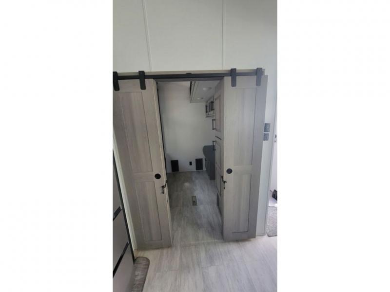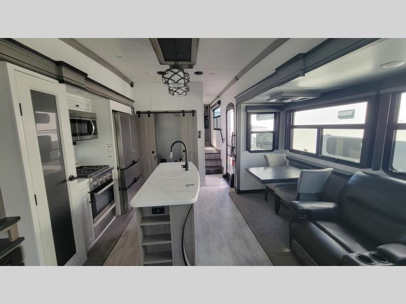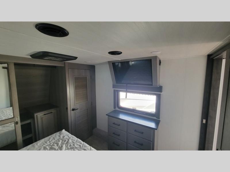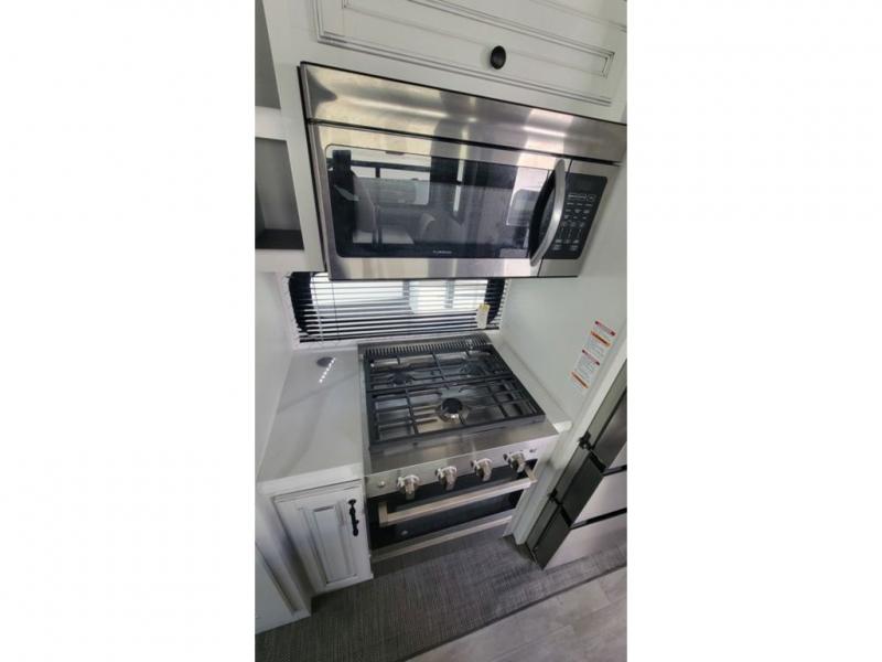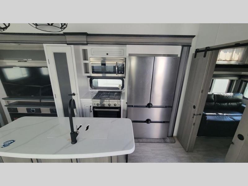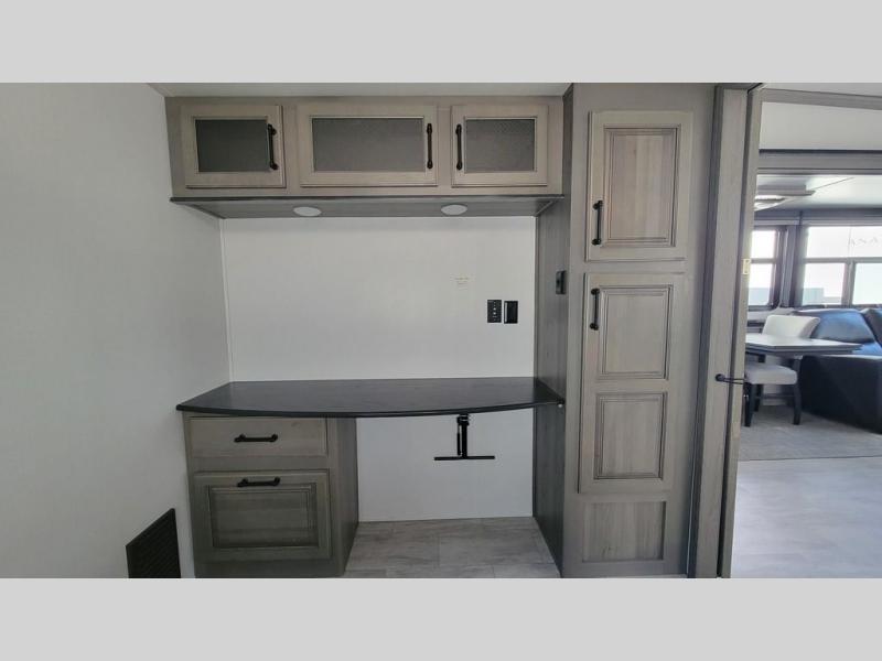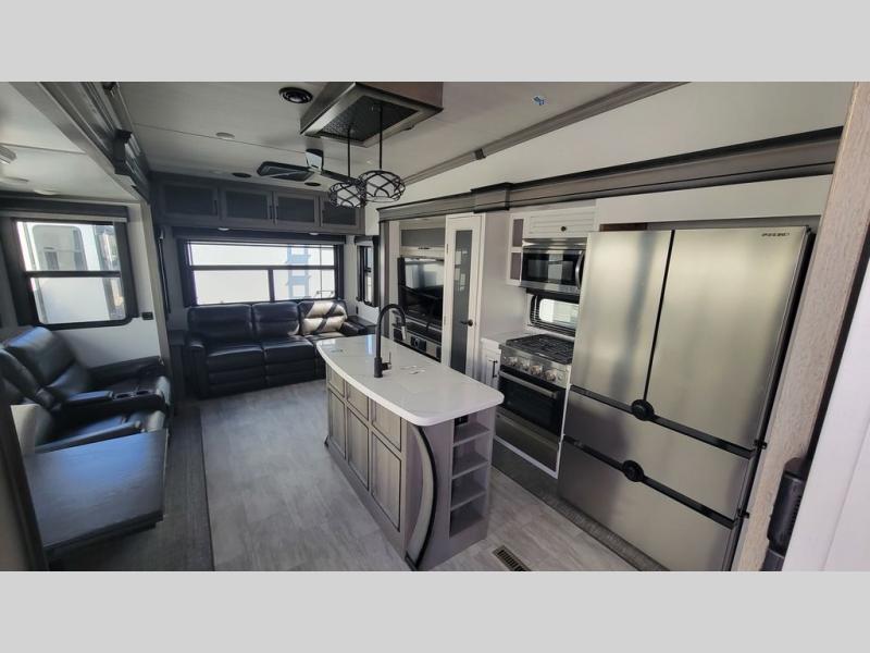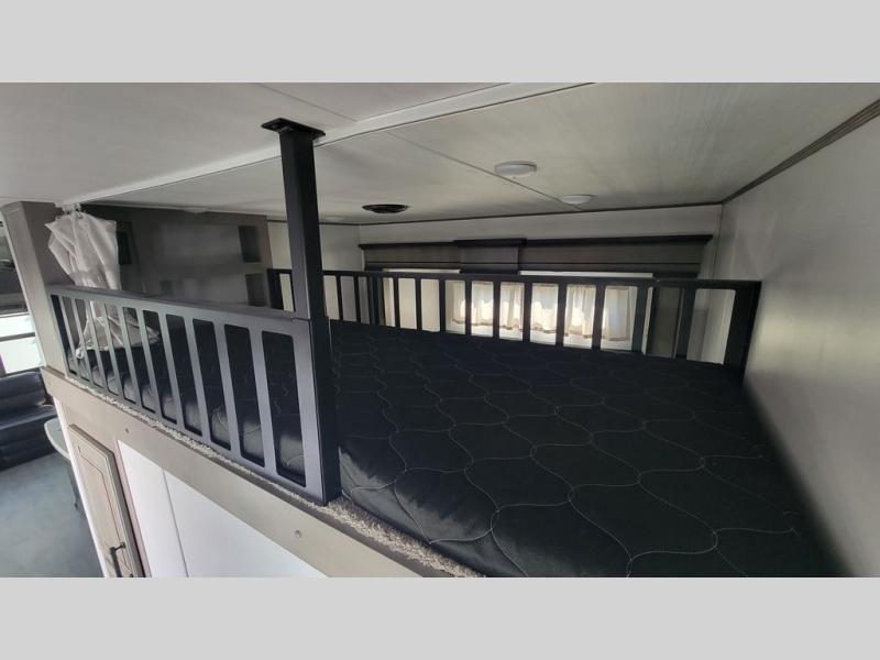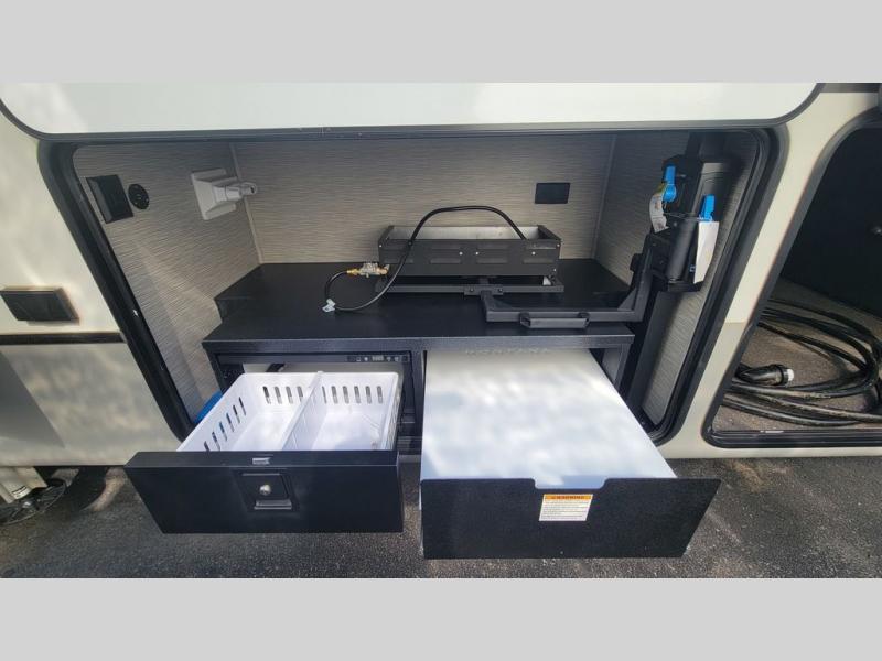 Everyone will have a comfortable place to sleep with two bedrooms in this fifth wheel! The front private bedroom has a king bed slide with storage underneath, a dresser with a 32" Smart TV, a large front closet with a clothing hamper and an area prepped to add the optional stackable washer and dryer. The mid-bunk room/bonus room has a hide-a-bed sofa with flip-up bunk above across from a desk so you can get some work done while you're away, plus a loft area/attic space above it all with a ladder to access it. The full bathroom has a 48" x 30" fiberglass shower with a seat and skylight above, and a linen closet to keep your towels close. The chef can prepare delicious home cooked meals for everyone either indoors with the 24" range and convection microwave oven, or at the outdoor kitchen with a two burner cooktop and refrigerator to keep your drink nice and cold!