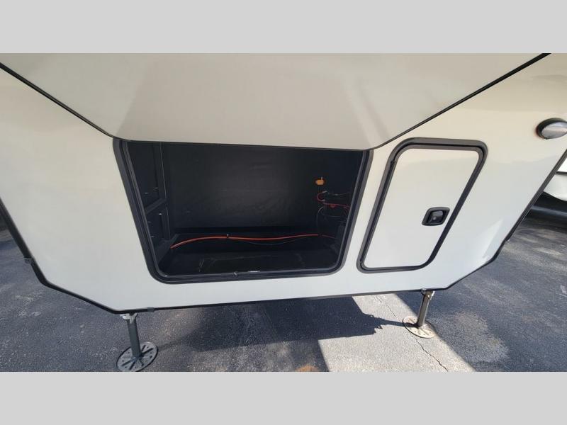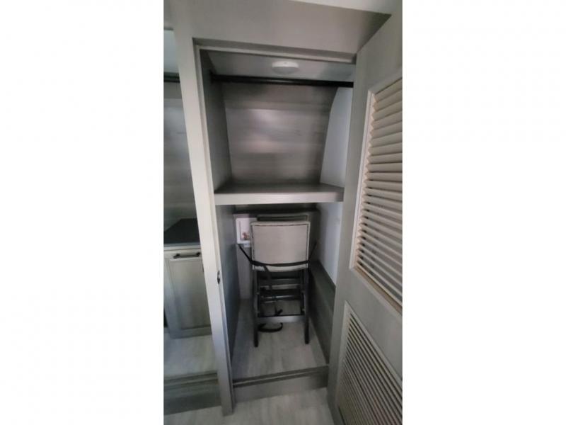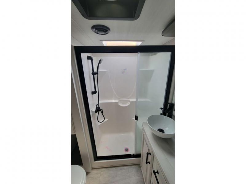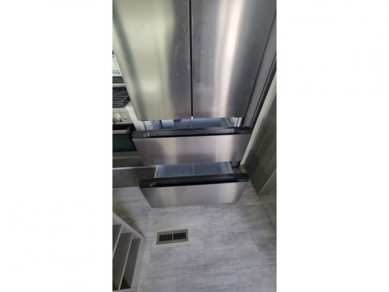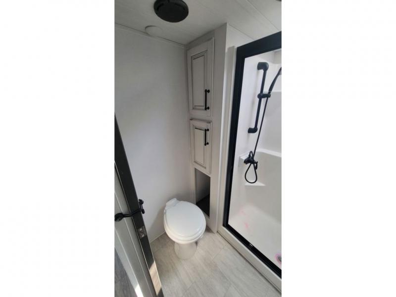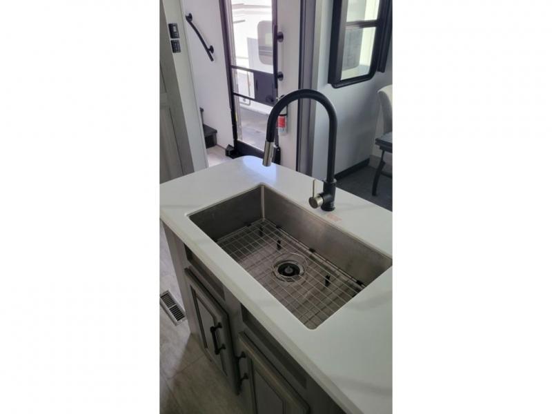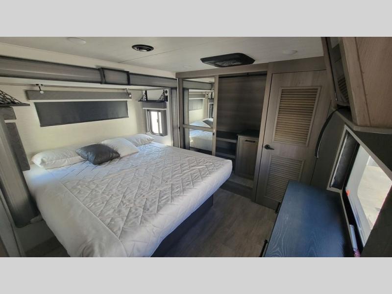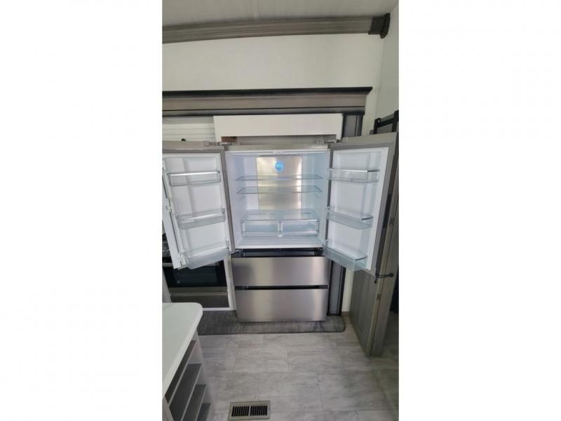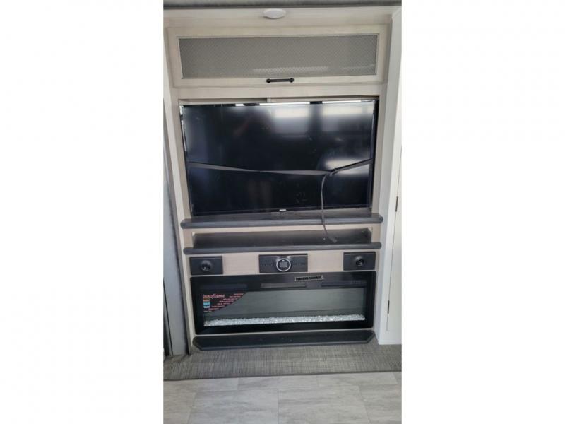 Everyone will have a comfortable place to sleep with two bedrooms in this fifth wheel! The front private bedroom has a king bed slide with storage underneath, a dresser with a 32" Smart TV, a large front closet with a clothing hamper and an area prepped to add the optional stackable washer and dryer. The mid-bunk room/bonus room has a hide-a-bed sofa with flip-up bunk above across from a desk so you can get some work done while you're away, plus a loft area/attic space above it all with a ladder to access it. The full bathroom has a 48" x 30" fiberglass shower with a seat and skylight above, and a linen closet to keep your towels close. The chef can prepare delicious home cooked meals for everyone either indoors with the 24" range and convection microwave oven, or at the outdoor kitchen with a two burner cooktop and refrigerator to keep your drink nice and cold!