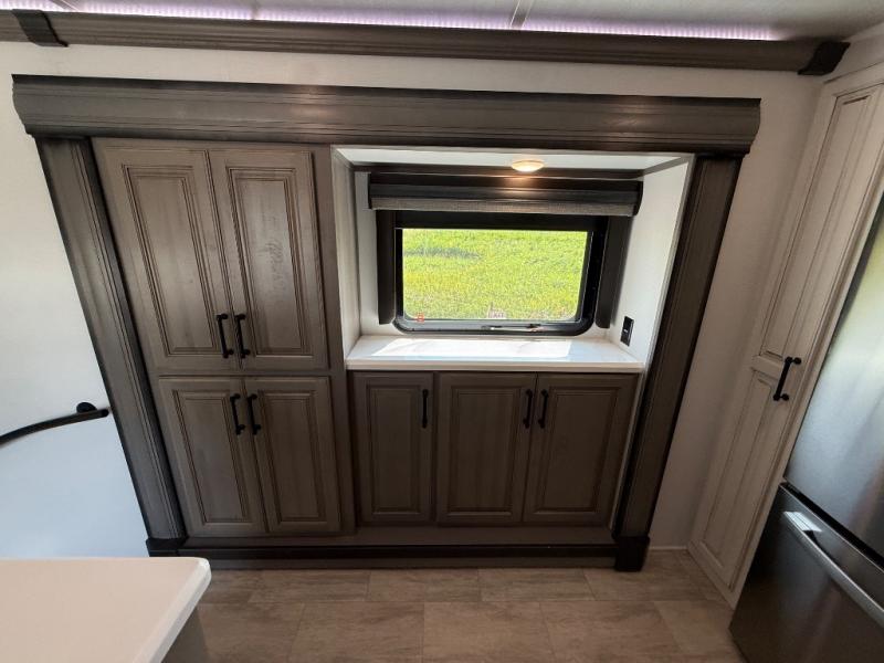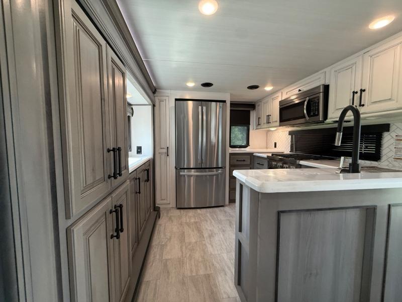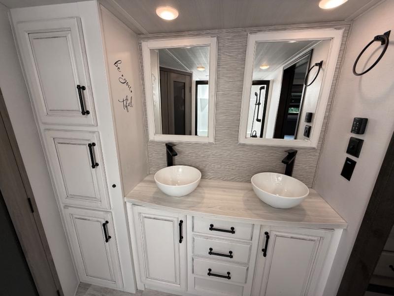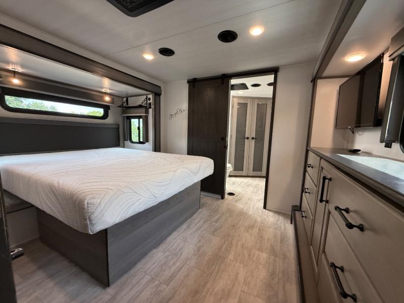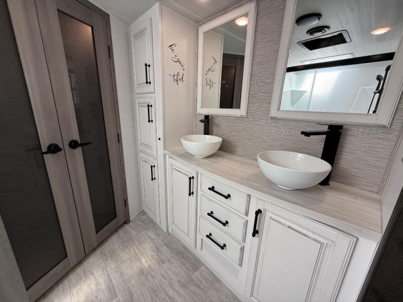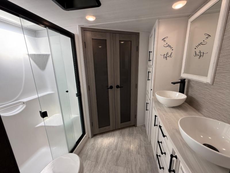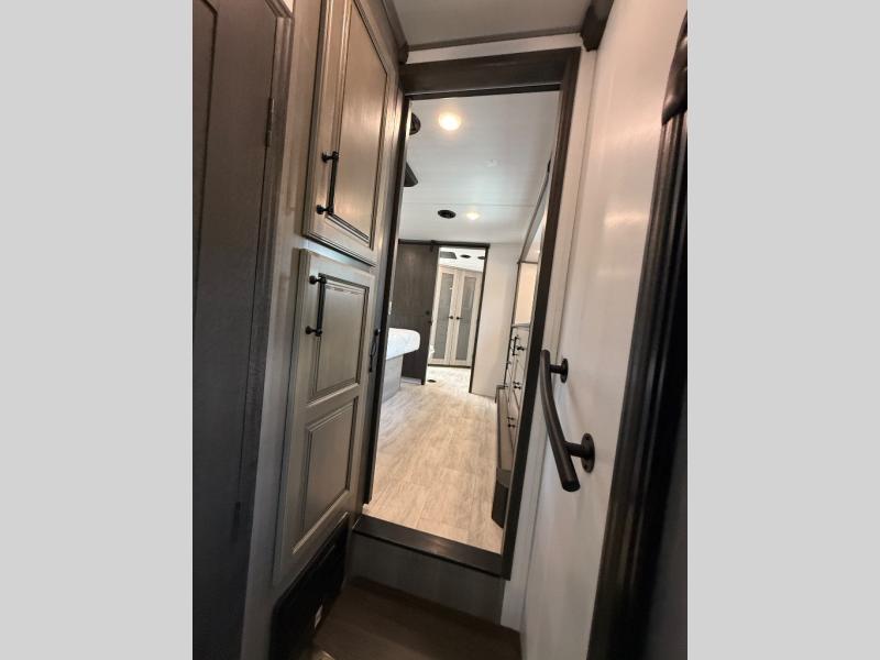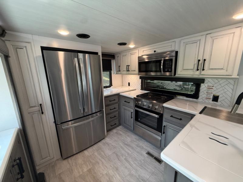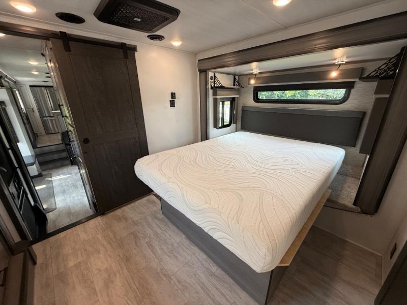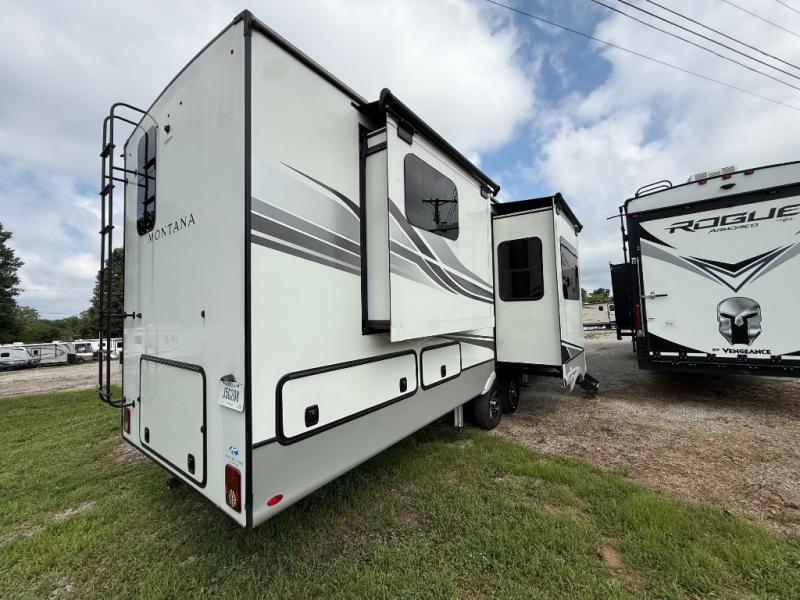 The perfect RV when you like to take "home"' with you when you travel! This Montana fifth wheel gives you the space you want and it feels like home with plenty of features to love and keep you comfortable when you are out enjoying your adventures. Five slides in total give each space plenty of room, the raised rear kitchen has everything you need to cook up meals and snacks just like at home. An 18 cu. ft. residential refrigerator with ice maker, convection microwave oven, and large sink, plus pantry space will make any chef happy. The mid-coach space just inside the door features a living room and half bath for convenience. There is also a dining table and four chairs within the roadside slide. Step up in front through a sliding barn door to a double slide space with a king bed and dresser. The bed has a CPAP shelf on either side, and there is storage beneath the bed for extra blankets and pillows, plus more. A second sliding barn door leads into the front spacious master bath featuring dual sinks, a 48" x 30" shower, and a large walk-in wardrobe area that has been prepped for a washer and dryer if you choose to add.