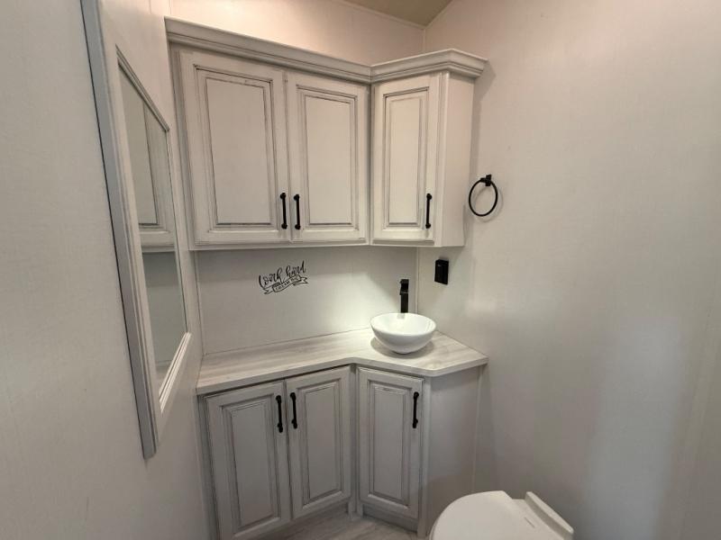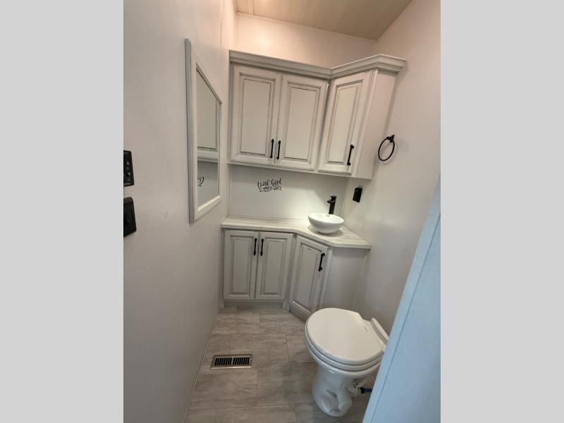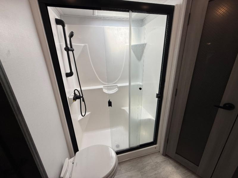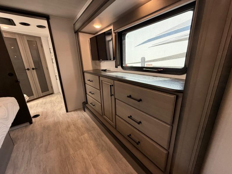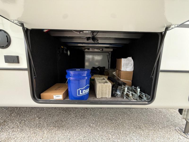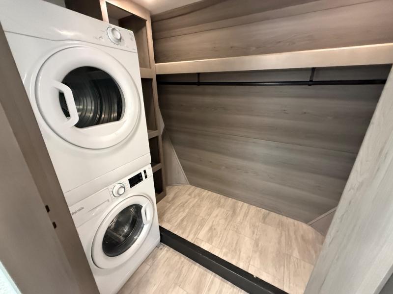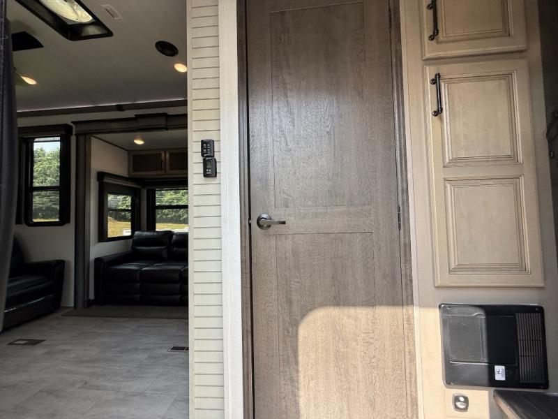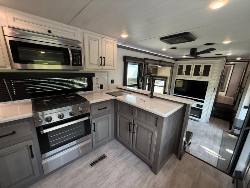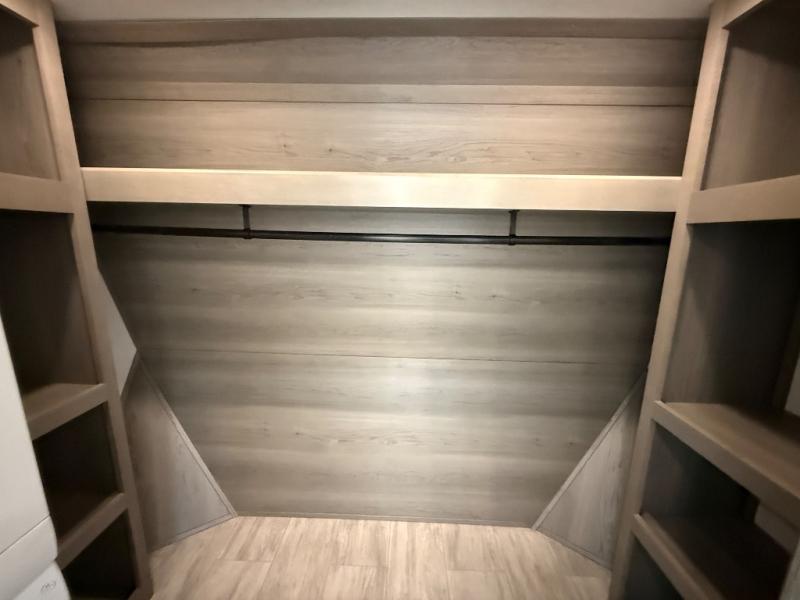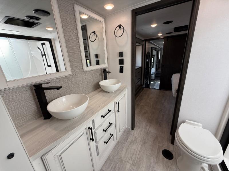The perfect RV when you like to take "home"' with you when you travel! This Montana fifth wheel gives you the space you want and it feels like home with plenty of features to love and keep you comfortable when you are out enjoying your adventures. Five slides in total give each space plenty of room, the raised rear kitchen has everything you need to cook up meals and snacks just like at home. An 18 cu. ft. residential refrigerator with ice maker, convection microwave oven, and large sink, plus pantry space will make any chef happy. The mid-coach space just inside the door features a living room and half bath for convenience. There is also a dining table and four chairs within the roadside slide. Step up in front through a sliding barn door to a double slide space with a king bed and dresser. The bed has a CPAP shelf on either side, and there is storage beneath the bed for extra blankets and pillows, plus more. A second sliding barn door leads into the front spacious master bath featuring dual sinks, a 48" x 30" shower, and a large walk-in wardrobe area that has been prepped for a washer and dryer if you choose to add.