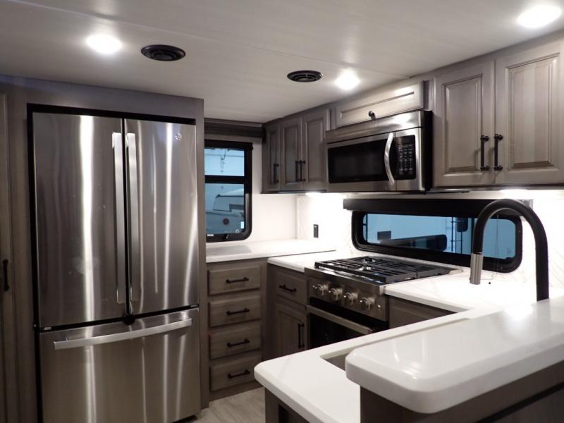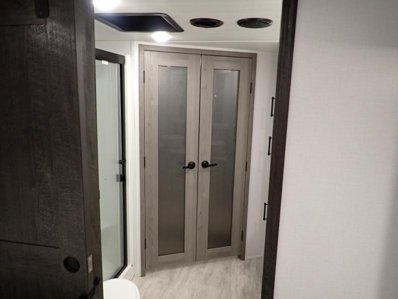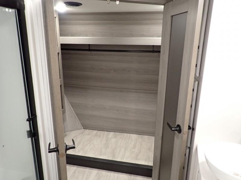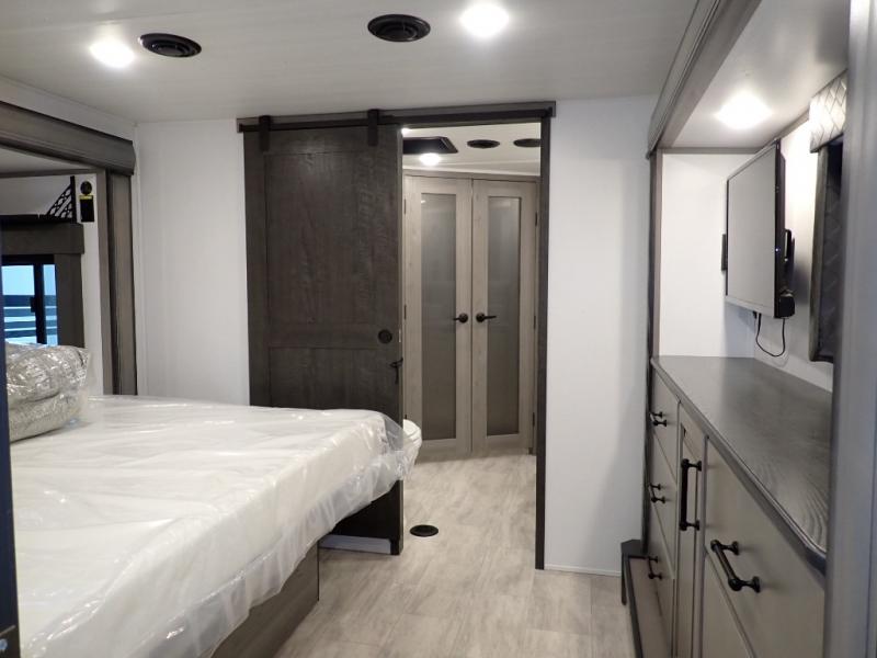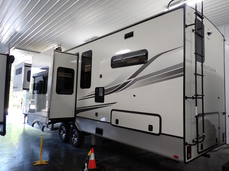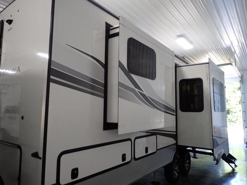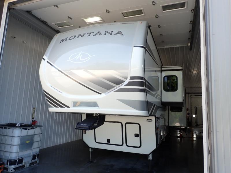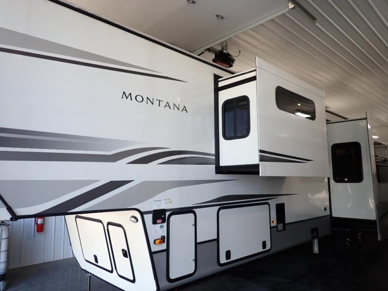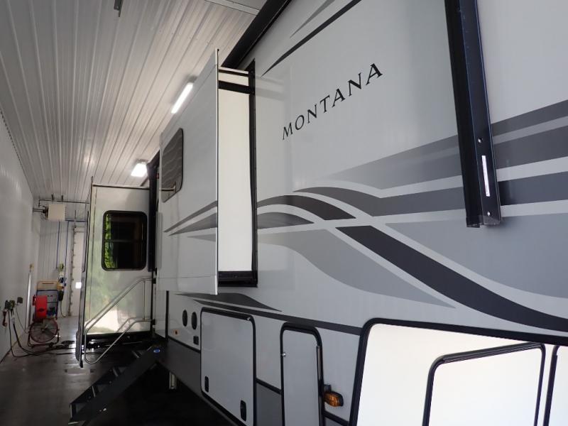 The perfect RV when you like to take "home"' with you when you travel! This Montana fifth wheel gives you the space you want and it feels like home with plenty of features to love and keep you comfortable when you are out enjoying your adventures. Five slides in total give each space plenty of room, the raised rear kitchen has everything you need to cook up meals and snacks just like at home. An 18 cu. ft. residential refrigerator with ice maker, convection microwave oven, and large sink, plus pantry space will make any chef happy. The mid-coach space just inside the door features a living room and half bath for convenience. There is also a dining table and four chairs within the roadside slide. Step up in front through a sliding barn door to a double slide space with a king bed and dresser. The bed has a CPAP shelf on either side, and there is storage beneath the bed for extra blankets and pillows, plus more. A second sliding barn door leads into the front spacious master bath featuring dual sinks, a 48" x 30" shower, and a large walk-in wardrobe area that has been prepped for a washer and dryer if you choose to add.