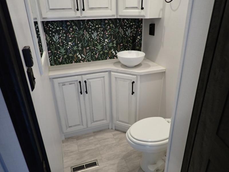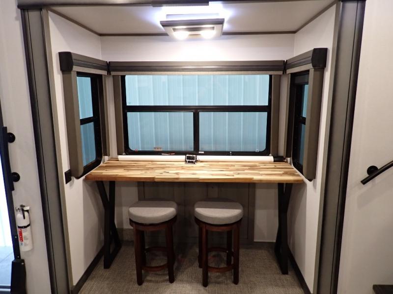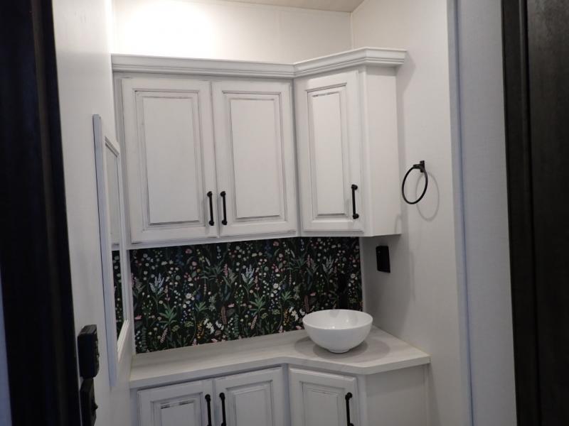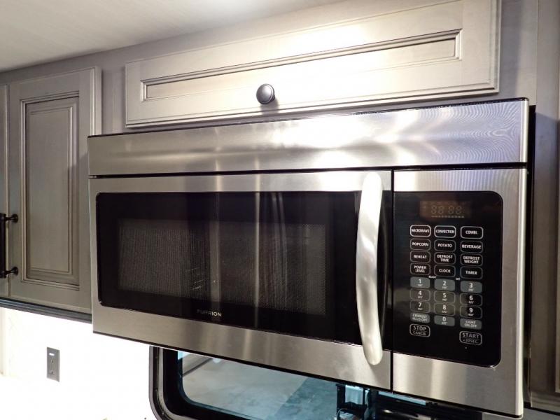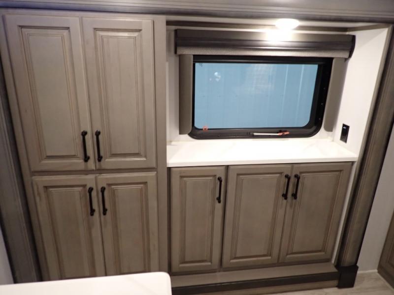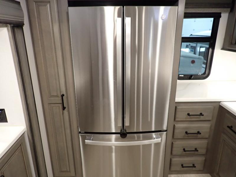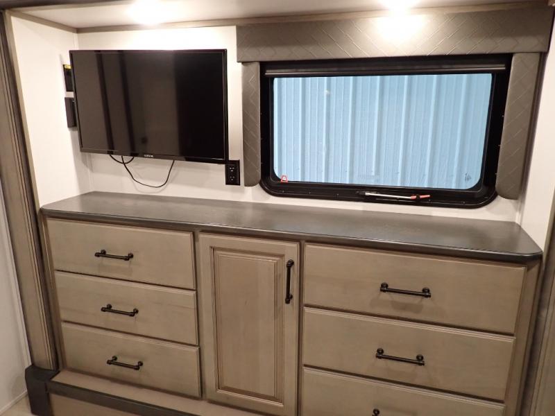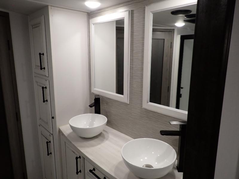 The perfect RV when you like to take "home"' with you when you travel! This Montana fifth wheel gives you the space you want and it feels like home with plenty of features to love and keep you comfortable when you are out enjoying your adventures. Five slides in total give each space plenty of room, the raised rear kitchen has everything you need to cook up meals and snacks just like at home. An 18 cu. ft. residential refrigerator with ice maker, convection microwave oven, and large sink, plus pantry space will make any chef happy. The mid-coach space just inside the door features a living room and half bath for convenience. There is also a dining table and four chairs within the roadside slide. Step up in front through a sliding barn door to a double slide space with a king bed and dresser. The bed has a CPAP shelf on either side, and there is storage beneath the bed for extra blankets and pillows, plus more. A second sliding barn door leads into the front spacious master bath featuring dual sinks, a 48" x 30" shower, and a large walk-in wardrobe area that has been prepped for a washer and dryer if you choose to add.