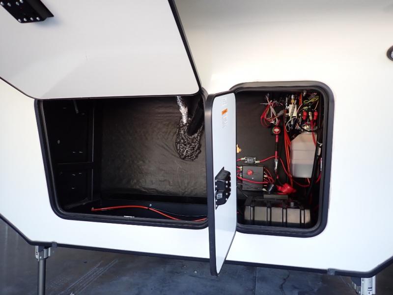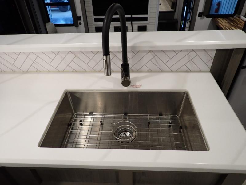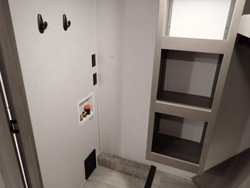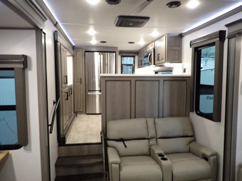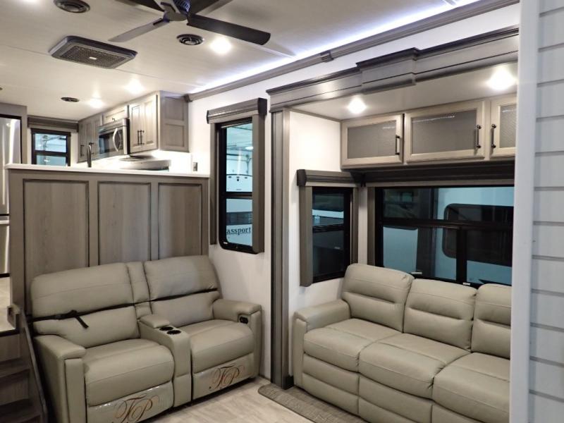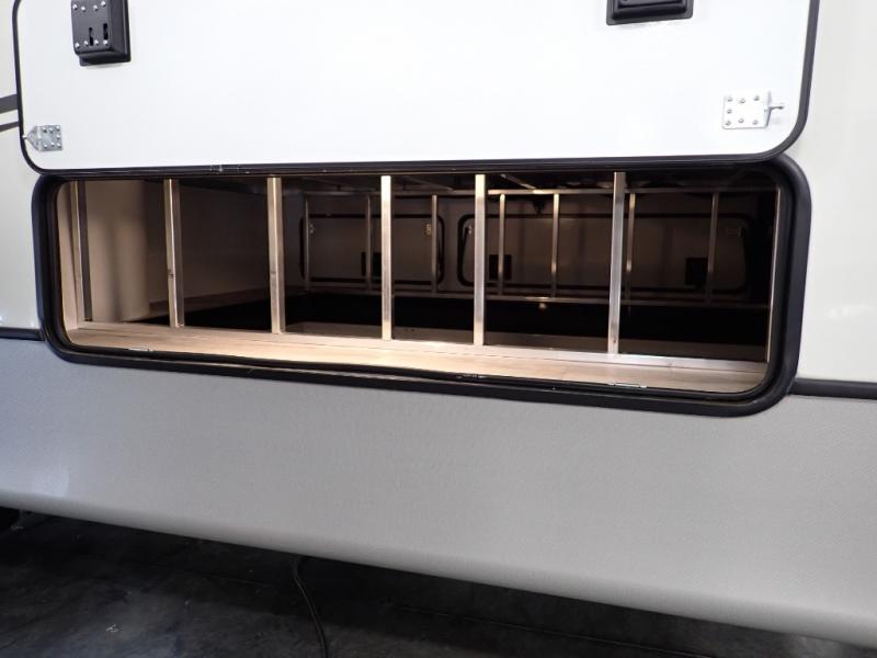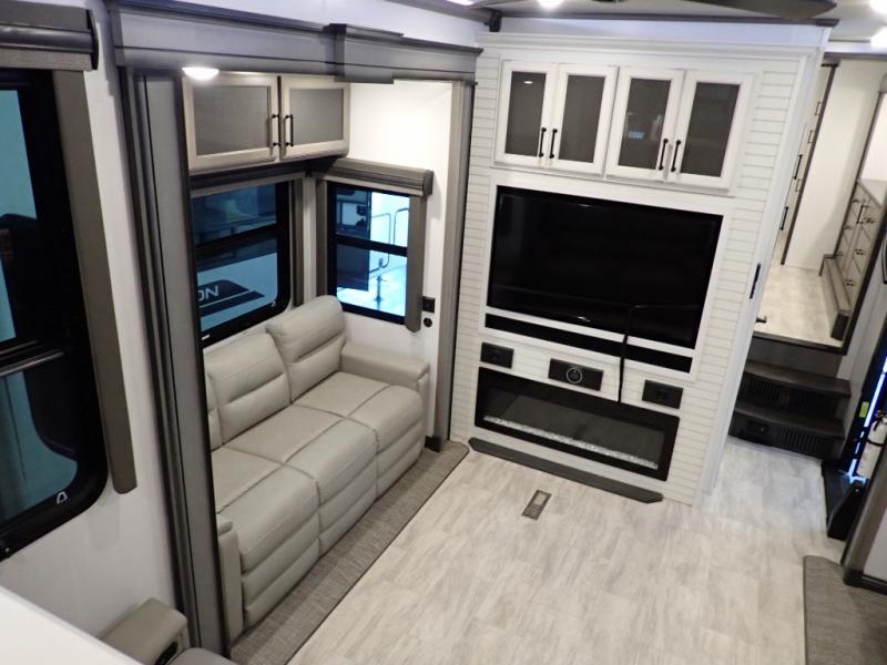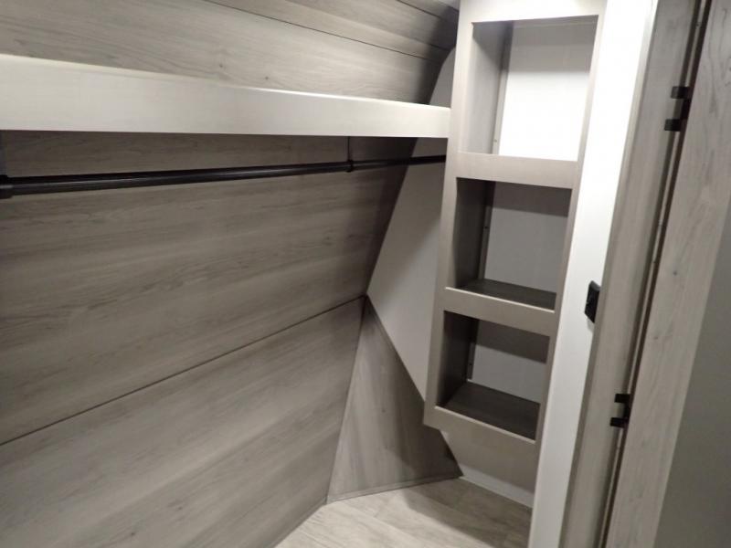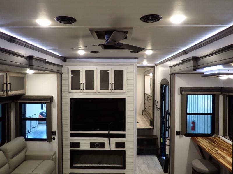 The perfect RV when you like to take "home"' with you when you travel! This Montana fifth wheel gives you the space you want and it feels like home with plenty of features to love and keep you comfortable when you are out enjoying your adventures. Five slides in total give each space plenty of room, the raised rear kitchen has everything you need to cook up meals and snacks just like at home. An 18 cu. ft. residential refrigerator with ice maker, convection microwave oven, and large sink, plus pantry space will make any chef happy. The mid-coach space just inside the door features a living room and half bath for convenience. There is also a dining table and four chairs within the roadside slide. Step up in front through a sliding barn door to a double slide space with a king bed and dresser. The bed has a CPAP shelf on either side, and there is storage beneath the bed for extra blankets and pillows, plus more. A second sliding barn door leads into the front spacious master bath featuring dual sinks, a 48" x 30" shower, and a large walk-in wardrobe area that has been prepped for a washer and dryer if you choose to add.