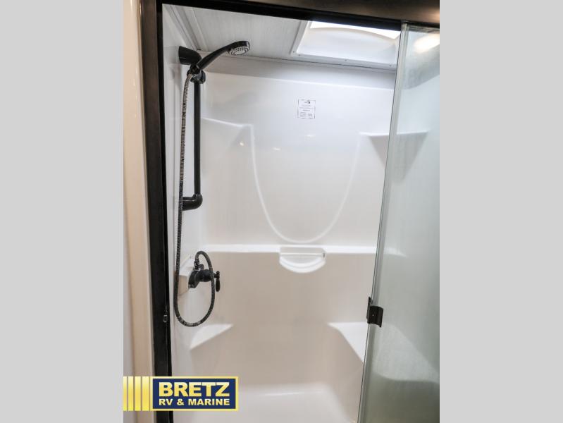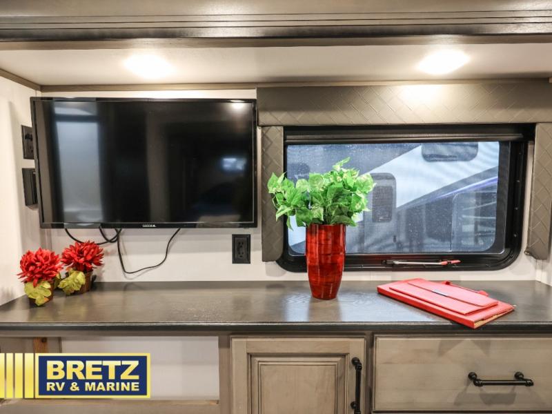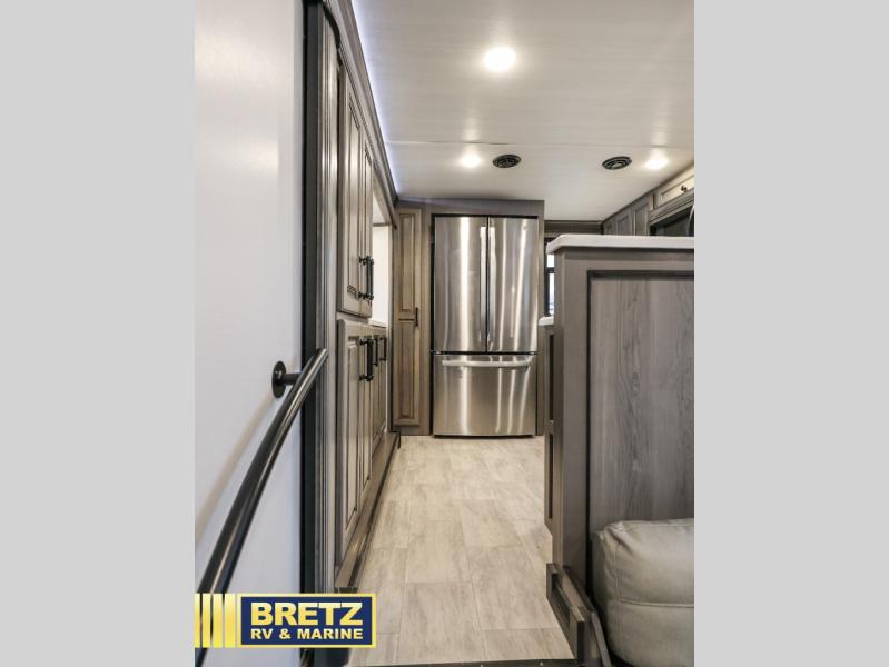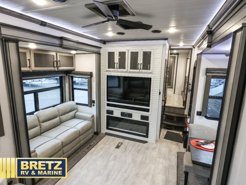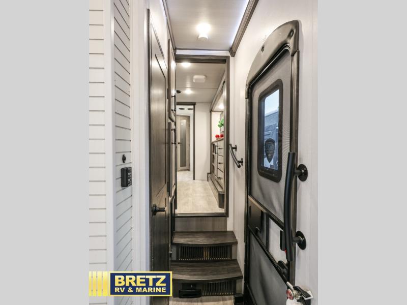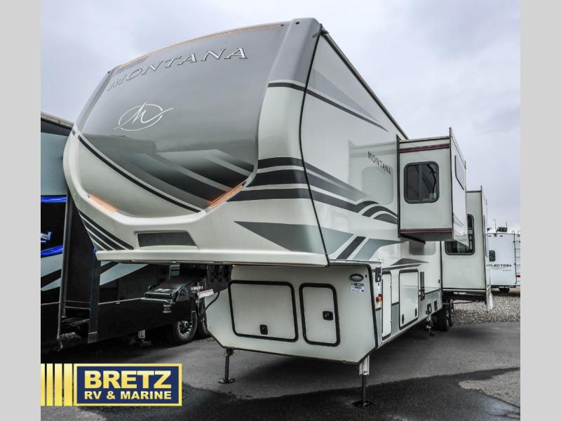 The perfect RV when you like to take "home"' with you when you travel! This Montana fifth wheel gives you the space you want and it feels like home with plenty of features to love and keep you comfortable when you are out enjoying your adventures. Five slides in total give each space plenty of room, the raised rear kitchen has everything you need to cook up meals and snacks just like at home. An 18 cu. ft. residential refrigerator with ice maker, convection microwave oven, and large sink, plus pantry space will make any chef happy. The mid-coach space just inside the door features a living room and half bath for convenience. There is also a dining table and four chairs within the roadside slide. Step up in front through a sliding barn door to a double slide space with a king bed and dresser. The bed has a CPAP shelf on either side, and there is storage beneath the bed for extra blankets and pillows, plus more. A second sliding barn door leads into the front spacious master bath featuring dual sinks, a 48" x 30" shower, and a large walk-in wardrobe area that has been prepped for a washer and dryer if you choose to add.