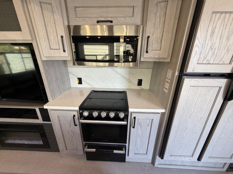You can take this Montana High Country fifth wheel to the campsite of your choice! You'll have plenty of comfort with the king-size bed in the front master suite, and you can also let some friends or kids sleep on the hide-a-bed sofa in the rear living area. While you watch the 50" LCD TV, you can sit back in the power theater seating, and you can switch on the fireplace for some added heat if it's cool outside. The opposing slides in the main living area are what give you extra space to work freely around the kitchen island, and the coffee station allows you to prepare your afternoon pick-me-up with all of your coffee essentials sitting in one place just like at home.
