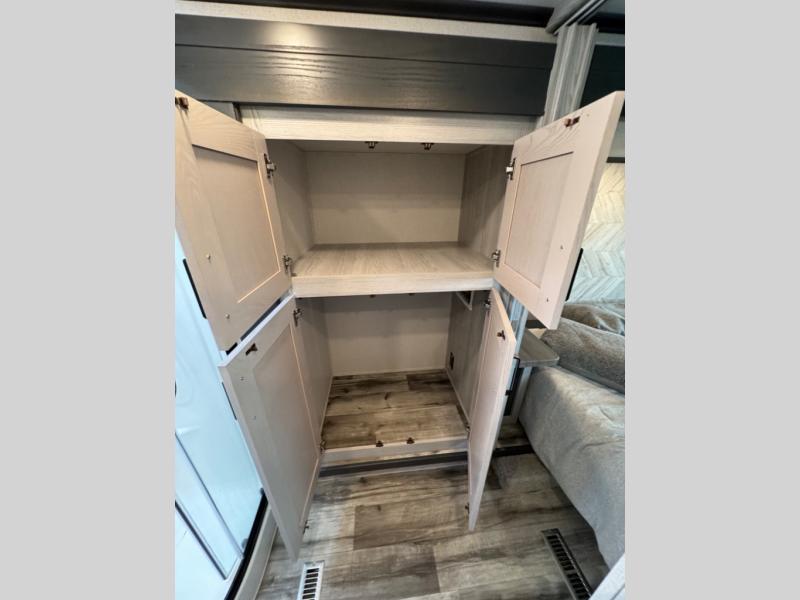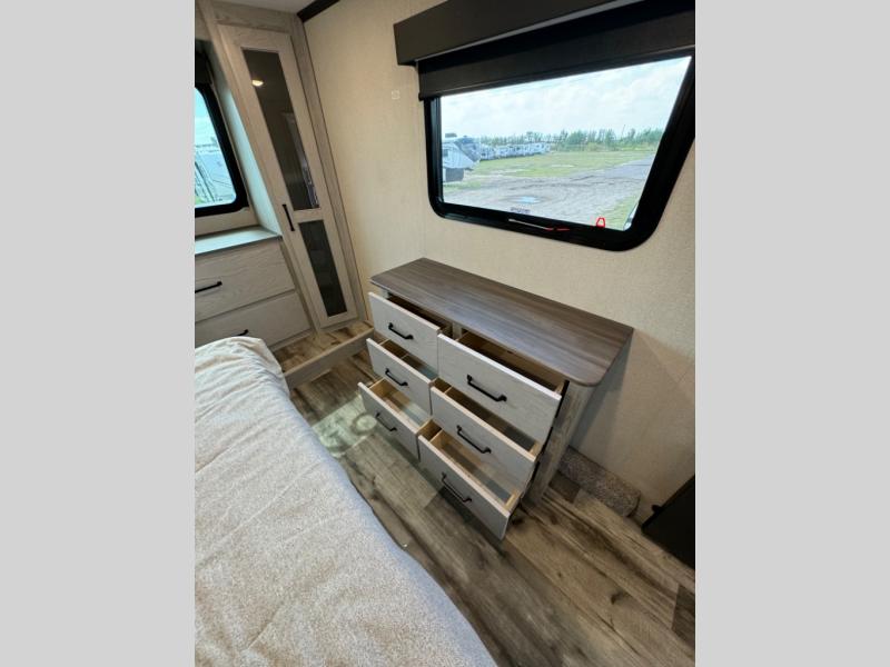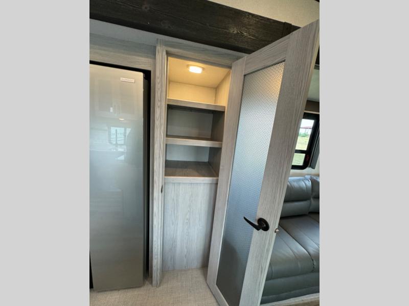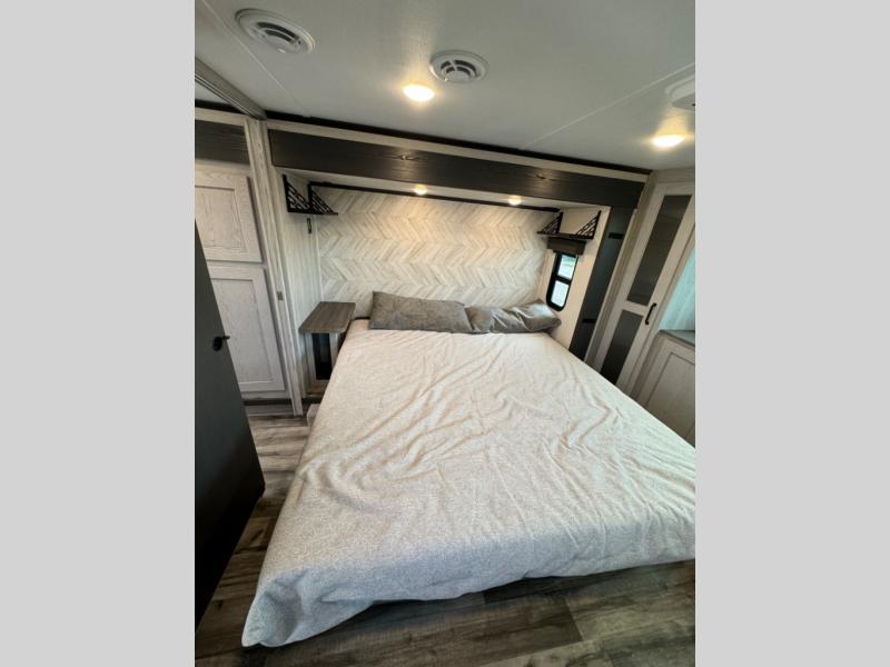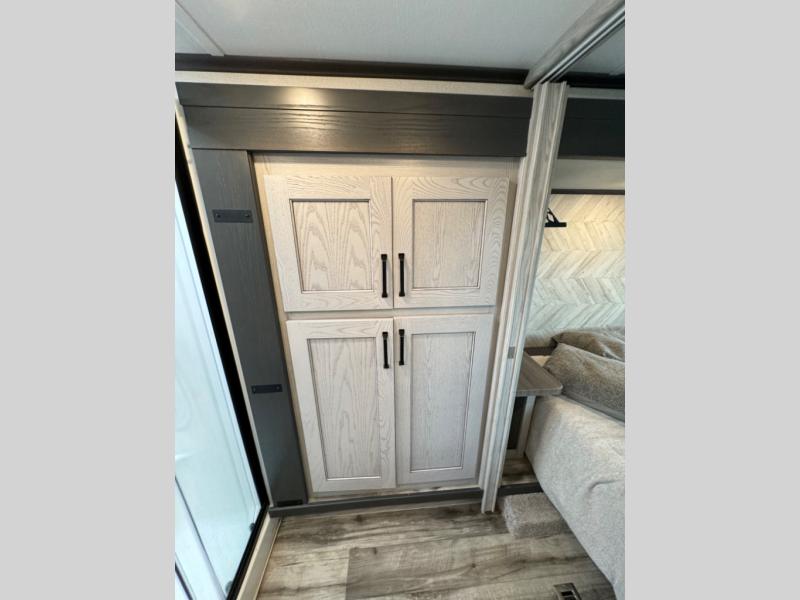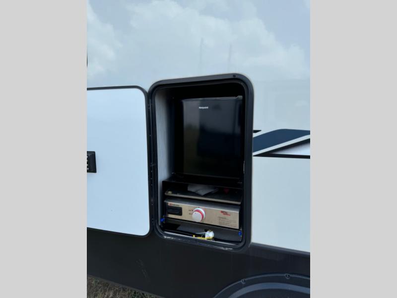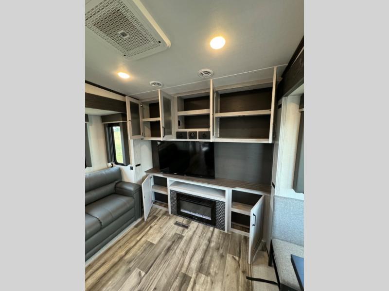 This couples coach will have you excited about traveling to all of your favorite places, and new locations too! The triple slide unit features an open concept living/dining area with dual opposing slides at the very back featuring a hide-a-bed sofa along the curbside, and an eating space opposite with a booth dinette or choose the optional free-standing table and chairs. Power theater seats will be a comfortable place to kick back for a movie, and you will love the all-new entertainment center design featuring a fireplace, Smart TV, and back-lit overhead cabinets. In the evening, head up to your private retreat with a spacious bath including dual entry doors from the hall at the top of the stairs or from within the private bedroom. Get cleaned up in the large radius shower with seat and snuggle up in a king bed slide. The bedroom slide also features a large wardrobe that has been prepped for a washer/dryer if you choose to add the convenience. You will find plenty more storage spaces for your clothing and belongings in the two dressers or dual wardrobes along the full front wall. Another bonus with this unit is the outdoor kitchen which gives you a choice to cook inside or out!