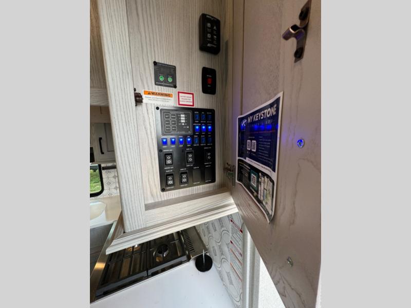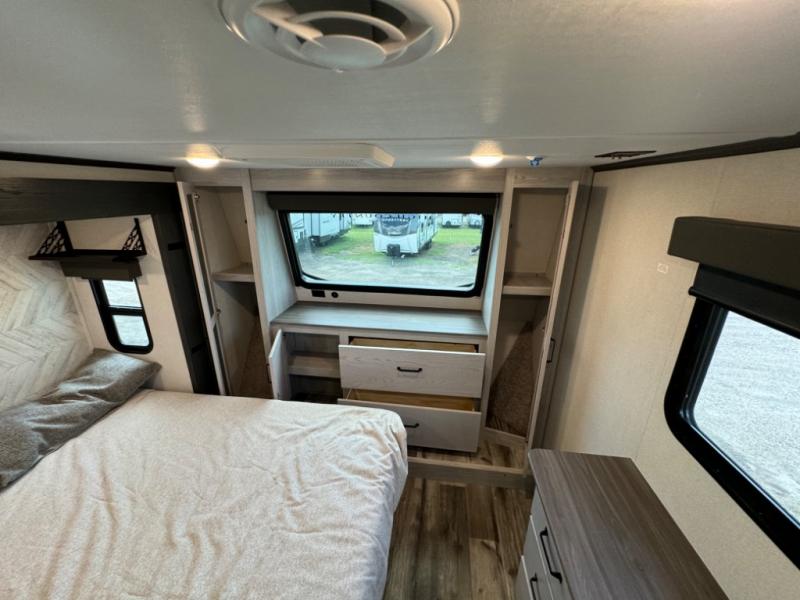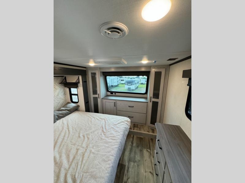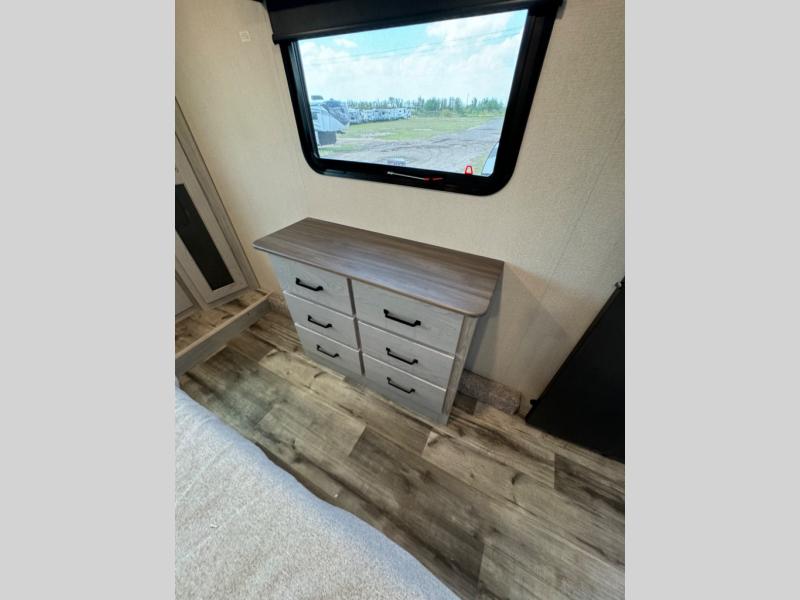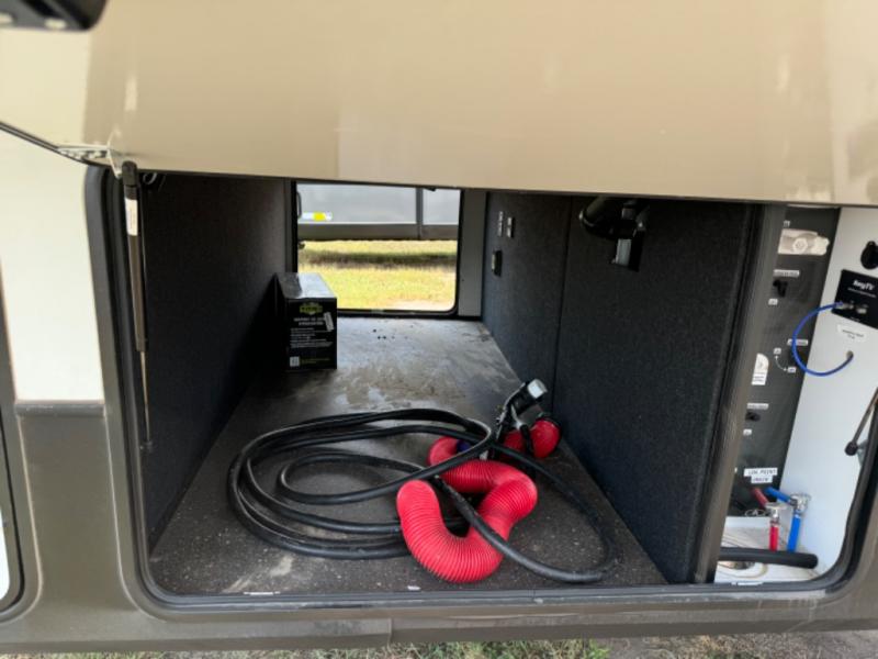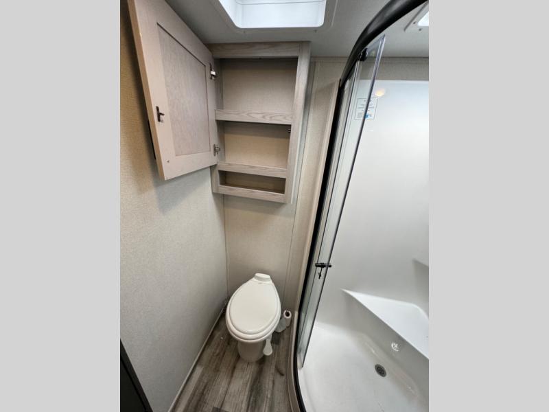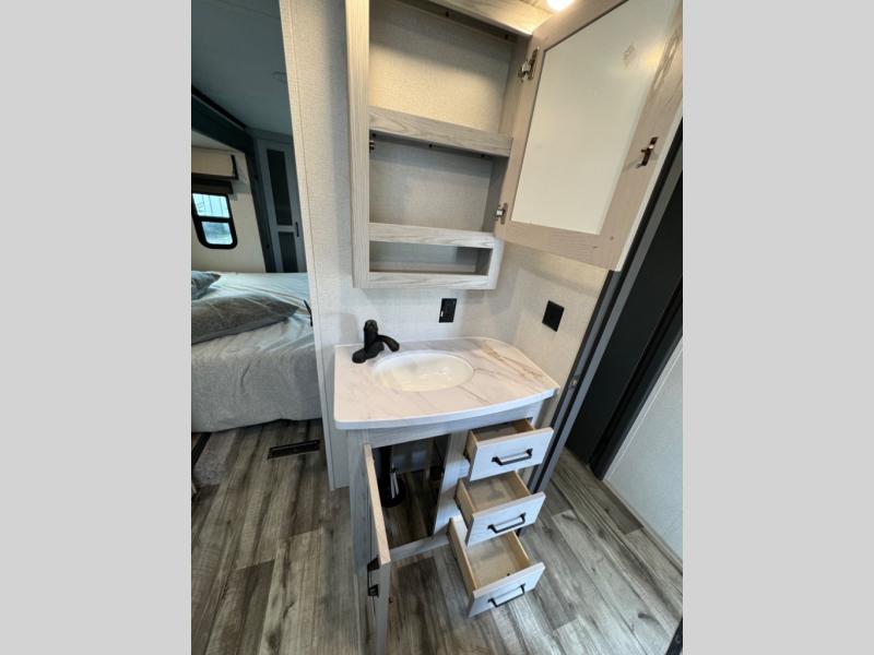 This couples coach will have you excited about traveling to all of your favorite places, and new locations too! The triple slide unit features an open concept living/dining area with dual opposing slides at the very back featuring a hide-a-bed sofa along the curbside, and an eating space opposite with a booth dinette or choose the optional free-standing table and chairs. Power theater seats will be a comfortable place to kick back for a movie, and you will love the all-new entertainment center design featuring a fireplace, Smart TV, and back-lit overhead cabinets. In the evening, head up to your private retreat with a spacious bath including dual entry doors from the hall at the top of the stairs or from within the private bedroom. Get cleaned up in the large radius shower with seat and snuggle up in a king bed slide. The bedroom slide also features a large wardrobe that has been prepped for a washer/dryer if you choose to add the convenience. You will find plenty more storage spaces for your clothing and belongings in the two dressers or dual wardrobes along the full front wall. Another bonus with this unit is the outdoor kitchen which gives you a choice to cook inside or out!