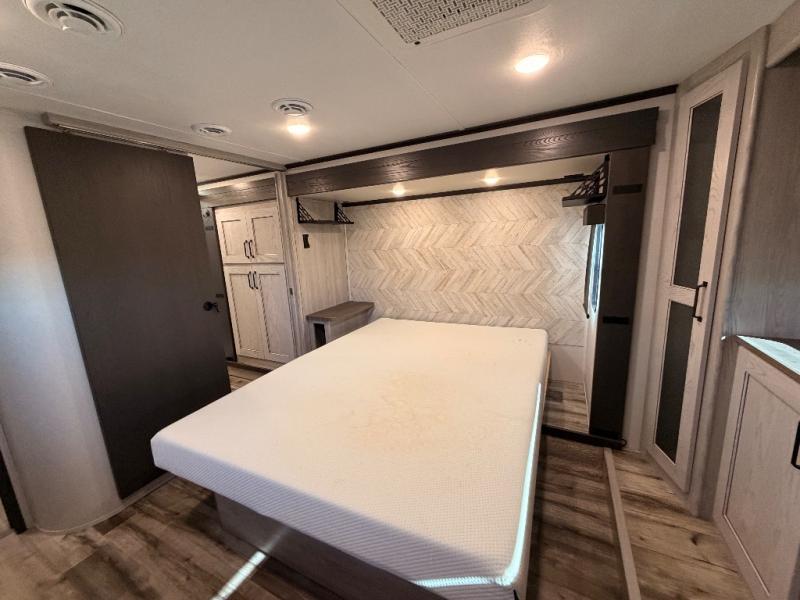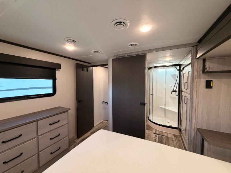 This couples coach will have you excited about traveling to all of your favorite places, and new locations too! The triple slide unit features an open concept living/dining area with dual opposing slides at the very back featuring a hide-a-bed sofa along the curbside, and an eating space opposite with a booth dinette or choose the optional free-standing table and chairs. Power theater seats will be a comfortable place to kick back for a movie, and you will love the all-new entertainment center design featuring a fireplace, Smart TV, and back-lit overhead cabinets. In the evening, head up to your private retreat with a spacious bath including dual entry doors from the hall at the top of the stairs or from within the private bedroom. Get cleaned up in the large radius shower with seat and snuggle up in a king bed slide. The bedroom slide also features a large wardrobe that has been prepped for a washer/dryer if you choose to add the convenience. You will find plenty more storage spaces for your clothing and belongings in the two dressers or dual wardrobes along the full front wall. Another bonus with this unit is the outdoor kitchen which gives you a choice to cook inside or out!