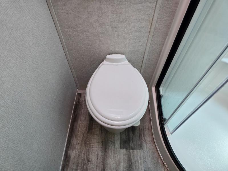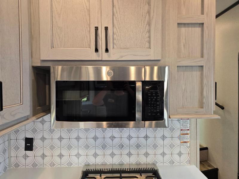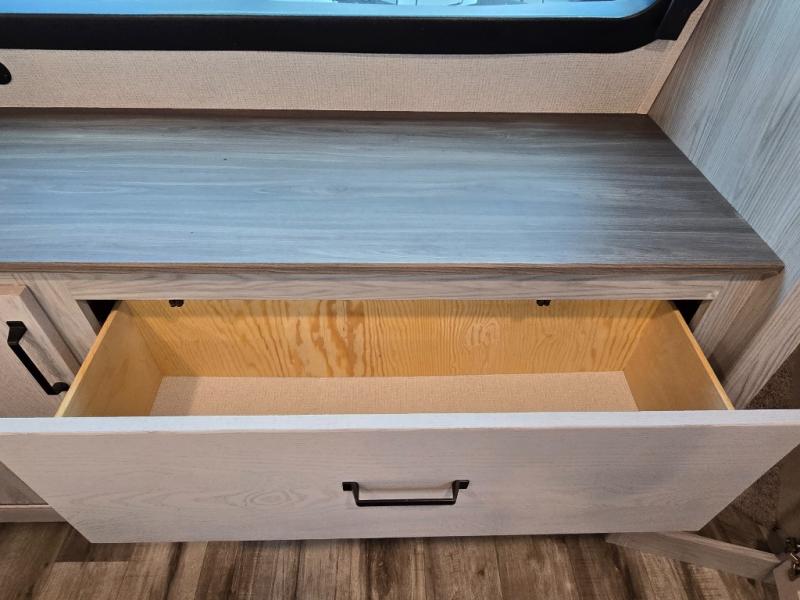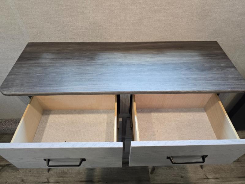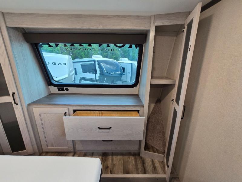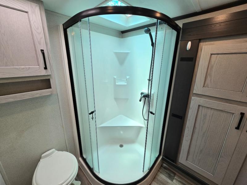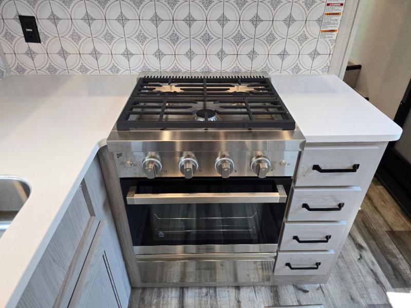This couples coach will have you excited about traveling to all of your favorite places, and new locations too! The triple slide unit features an open concept living/dining area with dual opposing slides at the very back featuring a hide-a-bed sofa along the curbside, and an eating space opposite with a booth dinette or choose the optional free-standing table and chairs. Power theater seats will be a comfortable place to kick back for a movie, and you will love the all-new entertainment center design featuring a fireplace, Smart TV, and back-lit overhead cabinets. In the evening, head up to your private retreat with a spacious bath including dual entry doors from the hall at the top of the stairs or from within the private bedroom. Get cleaned up in the large radius shower with seat and snuggle up in a king bed slide. The bedroom slide also features a large wardrobe that has been prepped for a washer/dryer if you choose to add the convenience. You will find plenty more storage spaces for your clothing and belongings in the two dressers or dual wardrobes along the full front wall. Another bonus with this unit is the outdoor kitchen which gives you a choice to cook inside or out!