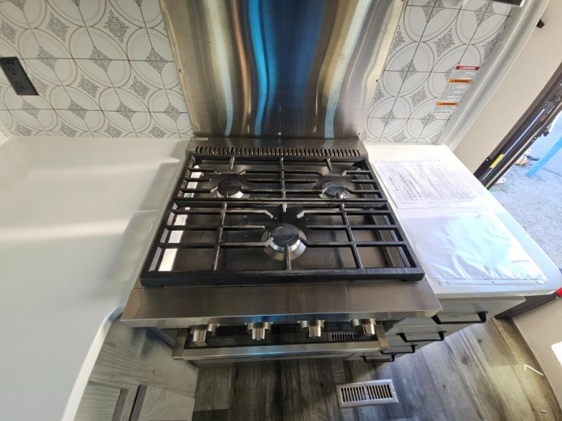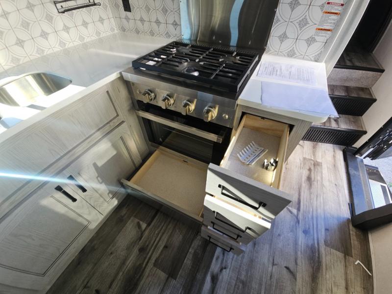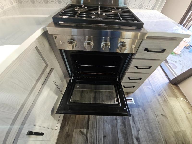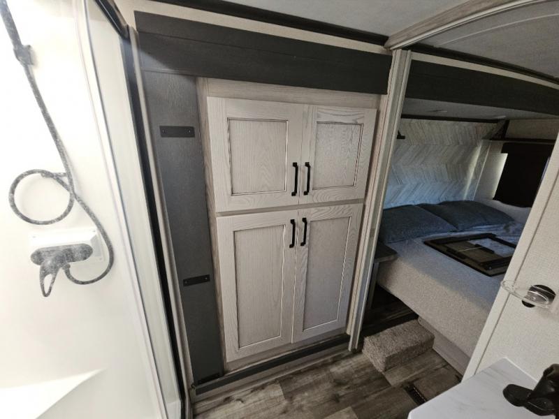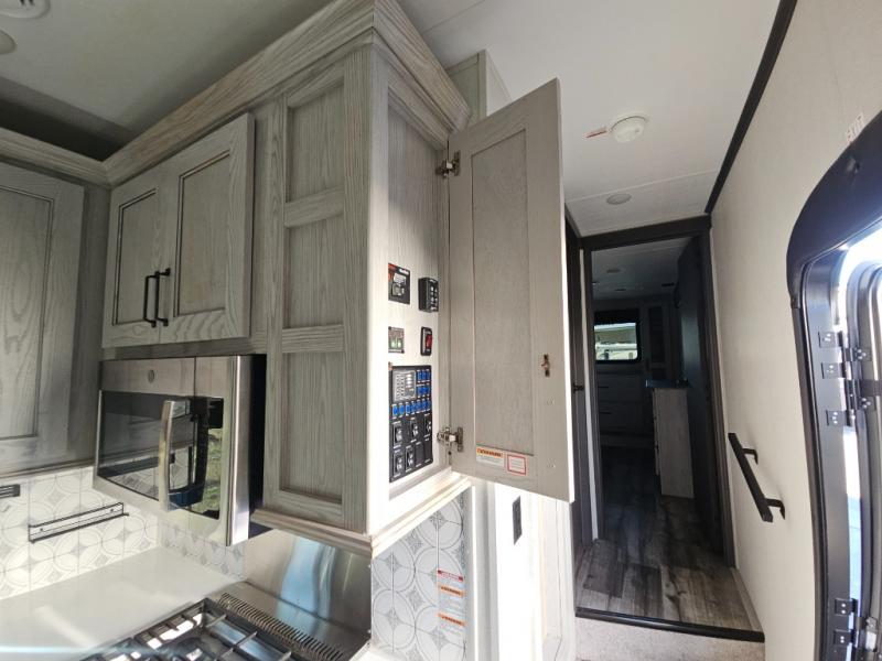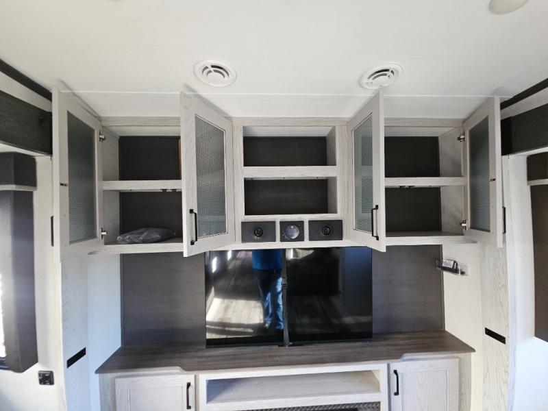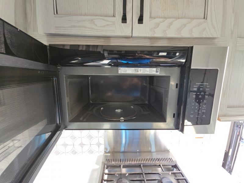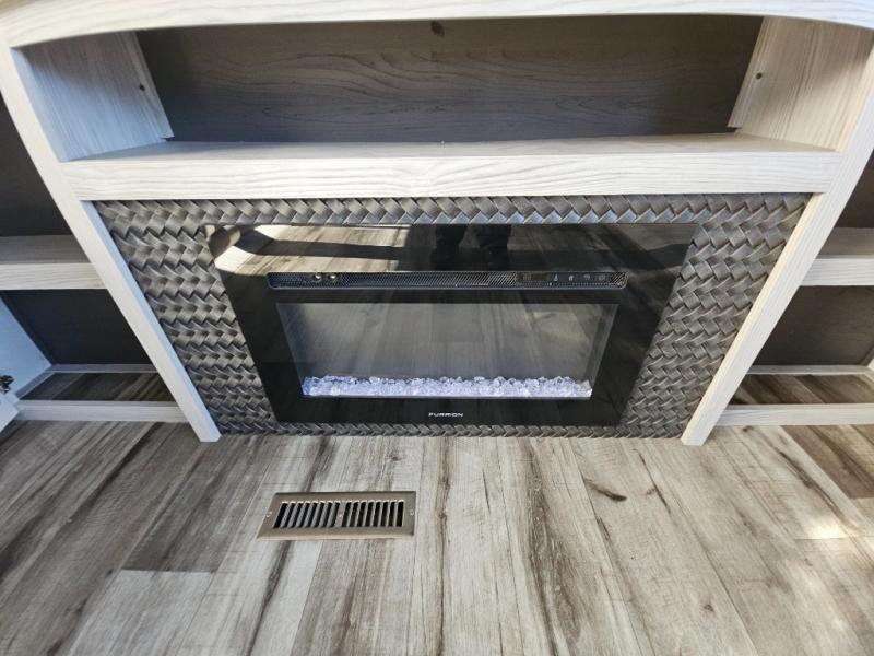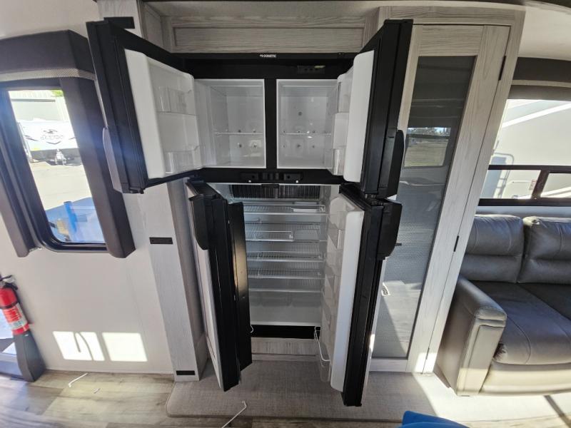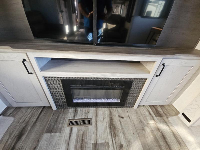 This couples coach will have you excited about traveling to all of your favorite places, and new locations too! The triple slide unit features an open concept living/dining area with dual opposing slides at the very back featuring a hide-a-bed sofa along the curbside, and an eating space opposite with a booth dinette or choose the optional free-standing table and chairs. Power theater seats will be a comfortable place to kick back for a movie, and you will love the all-new entertainment center design featuring a fireplace, Smart TV, and back-lit overhead cabinets. In the evening, head up to your private retreat with a spacious bath including dual entry doors from the hall at the top of the stairs or from within the private bedroom. Get cleaned up in the large radius shower with seat and snuggle up in a king bed slide. The bedroom slide also features a large wardrobe that has been prepped for a washer/dryer if you choose to add the convenience. You will find plenty more storage spaces for your clothing and belongings in the two dressers or dual wardrobes along the full front wall. Another bonus with this unit is the outdoor kitchen which gives you a choice to cook inside or out!