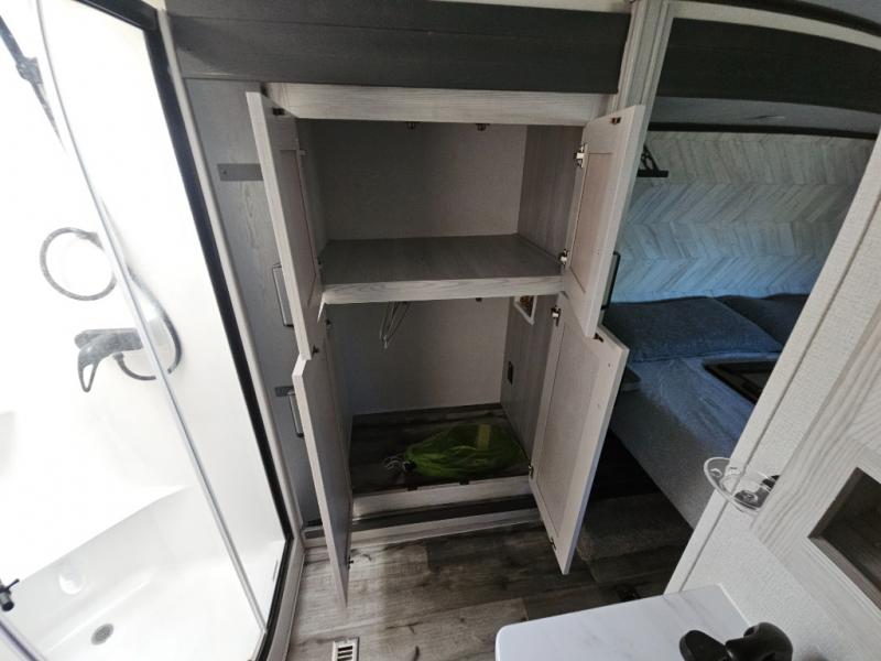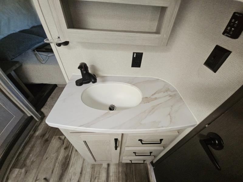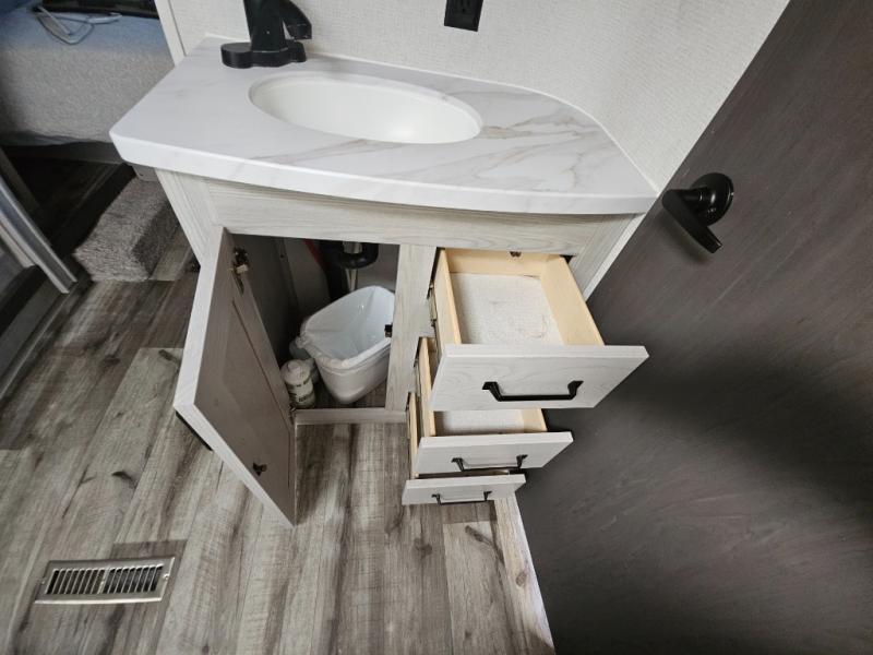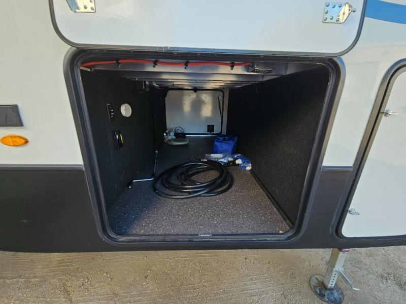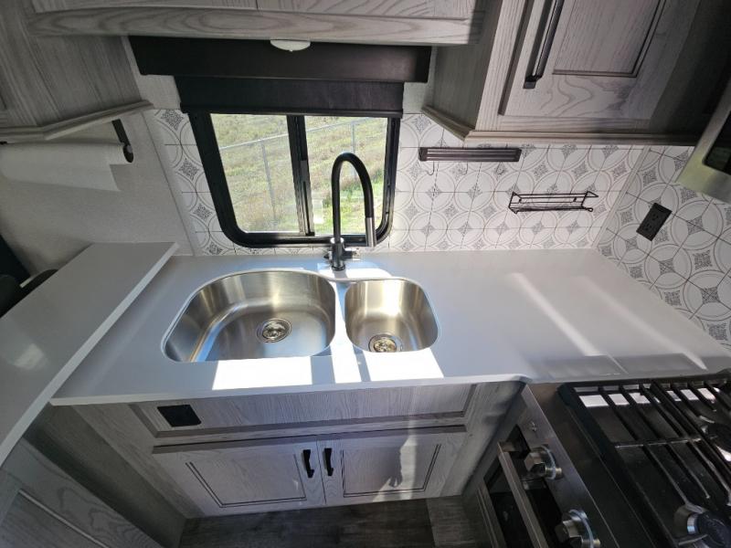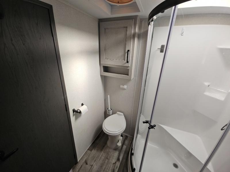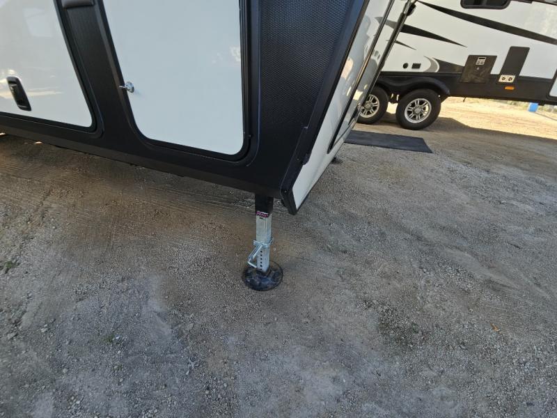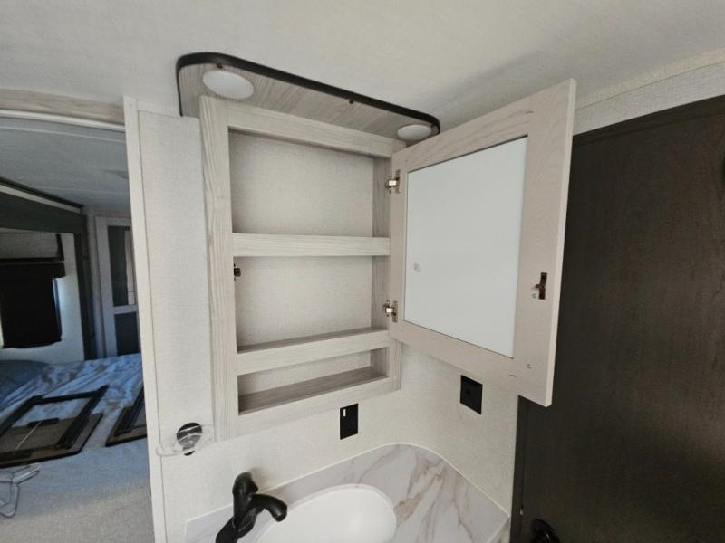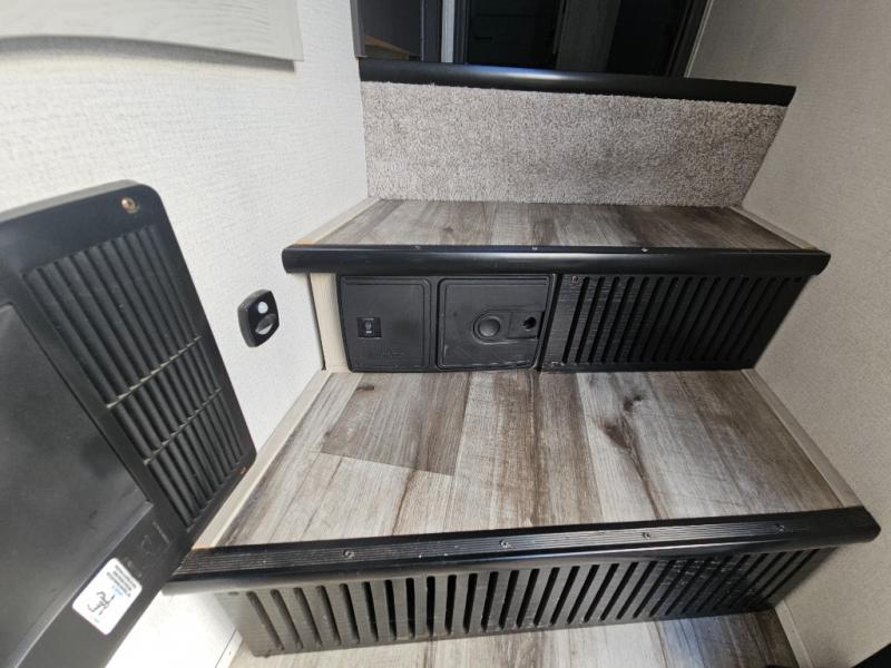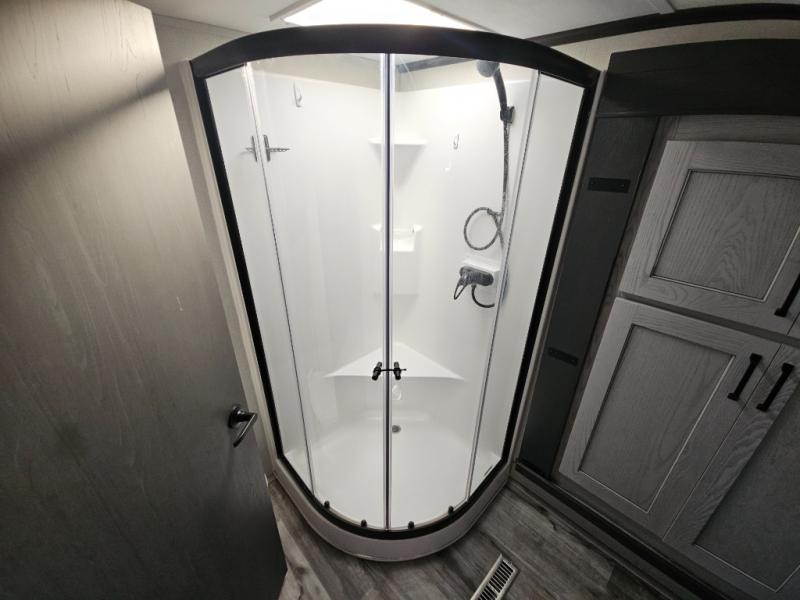 This couples coach will have you excited about traveling to all of your favorite places, and new locations too! The triple slide unit features an open concept living/dining area with dual opposing slides at the very back featuring a hide-a-bed sofa along the curbside, and an eating space opposite with a booth dinette or choose the optional free-standing table and chairs. Power theater seats will be a comfortable place to kick back for a movie, and you will love the all-new entertainment center design featuring a fireplace, Smart TV, and back-lit overhead cabinets. In the evening, head up to your private retreat with a spacious bath including dual entry doors from the hall at the top of the stairs or from within the private bedroom. Get cleaned up in the large radius shower with seat and snuggle up in a king bed slide. The bedroom slide also features a large wardrobe that has been prepped for a washer/dryer if you choose to add the convenience. You will find plenty more storage spaces for your clothing and belongings in the two dressers or dual wardrobes along the full front wall. Another bonus with this unit is the outdoor kitchen which gives you a choice to cook inside or out!