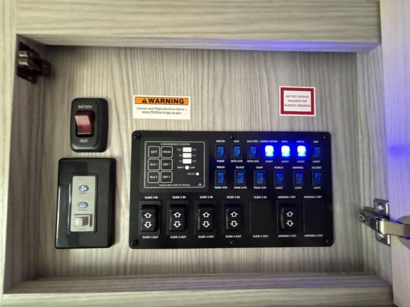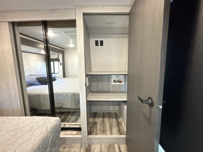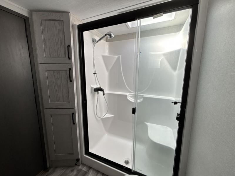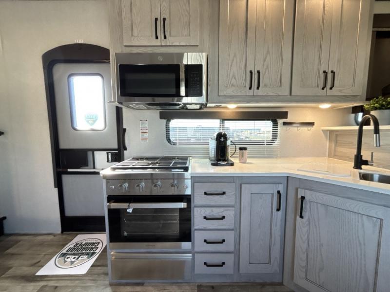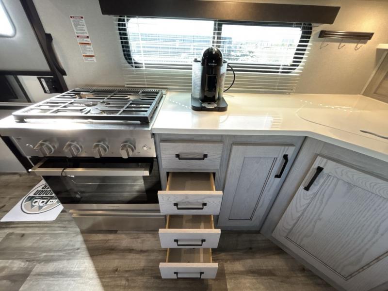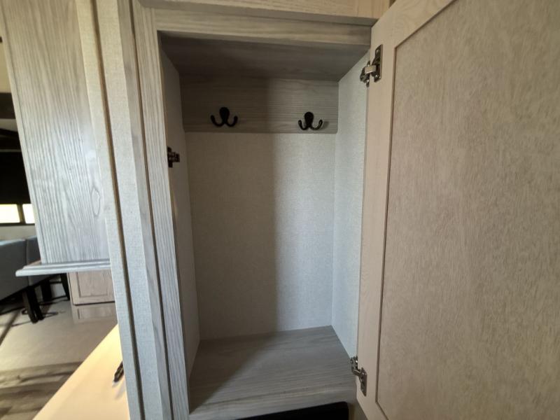 You'll be able to love this Montana High Country fifth wheel for years and years and years! The separated living room in the back feels just like your living room at home with its power theater seating, two hide-a-bed sofas, fireplace, and 50" LCD TV. The kitchen is also very residential with its three-burner range with glass top, residential microwave, residential refrigerator, pantry, and coffee station. When you enter this unit, there is a coat closet for you to place your boots and hats in, and for more clothing storage, just use the under-bed storage up in the private bedroom.