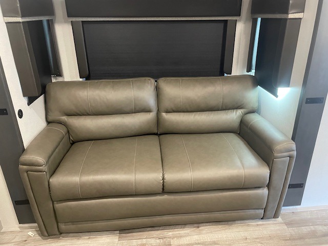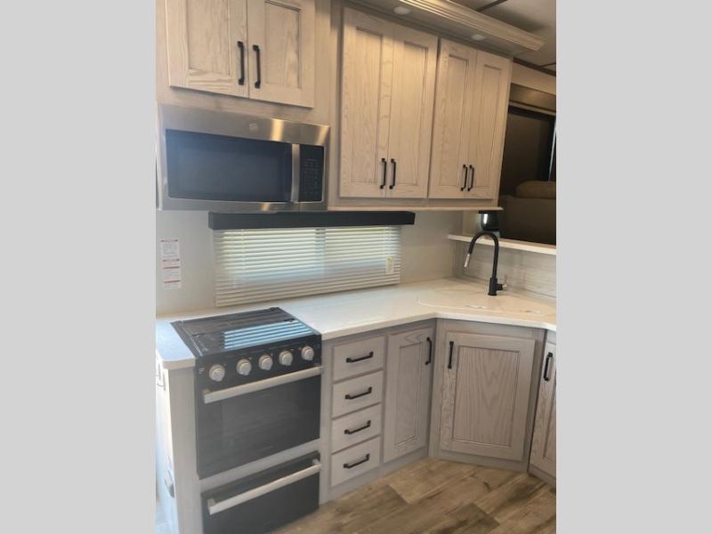You'll be able to love this Montana High Country fifth wheel for years and years and years! The separated living room in the back feels just like your living room at home with its power theater seating, two hide-a-bed sofas, fireplace, and 50" LCD TV. The kitchen is also very residential with its three-burner range with glass top, residential microwave, residential refrigerator, pantry, and coffee station. When you enter this unit, there is a coat closet for you to place your boots and hats in, and for more clothing storage, just use the under-bed storage up in the private bedroom.