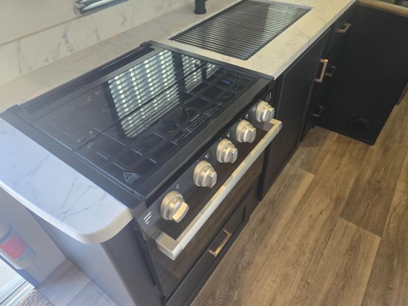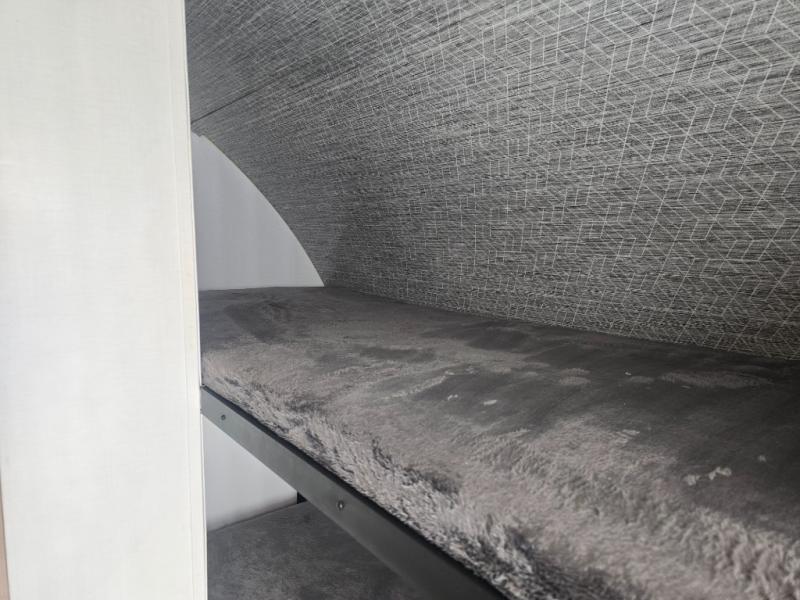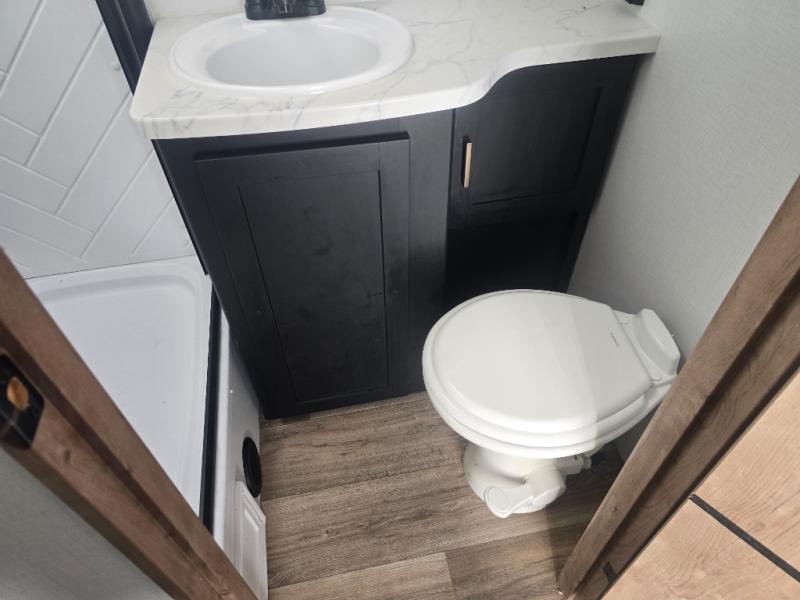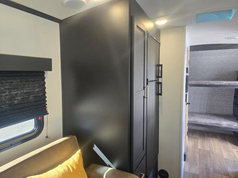 Looking to sleep like a king after hiking, biking or relaxing around the campsite? This trailer provides a rear slide king bed giving you more interior floor space and a comfortable place to sleep each night. Your friends can sleep on the front flip-down bunk beds and/or the sofa sleeper and booth dinette. The cook will have full kitchen amenities to whip up meals including a 10 cu. ft. refrigerator unless you would prefer the 8 cu. ft. option. There is an LCD TV to watch while sitting on the furniture while you take turns getting cleaned up in the full bathroom which also includes linen storage.
