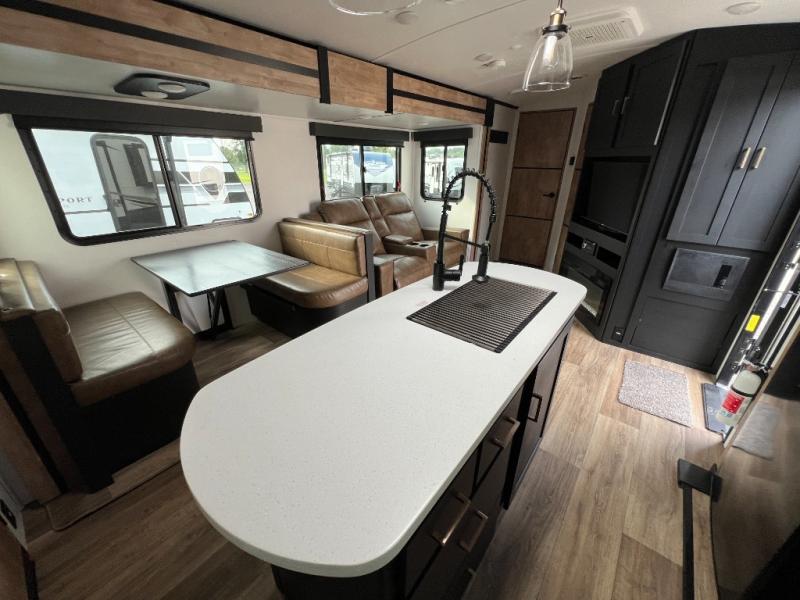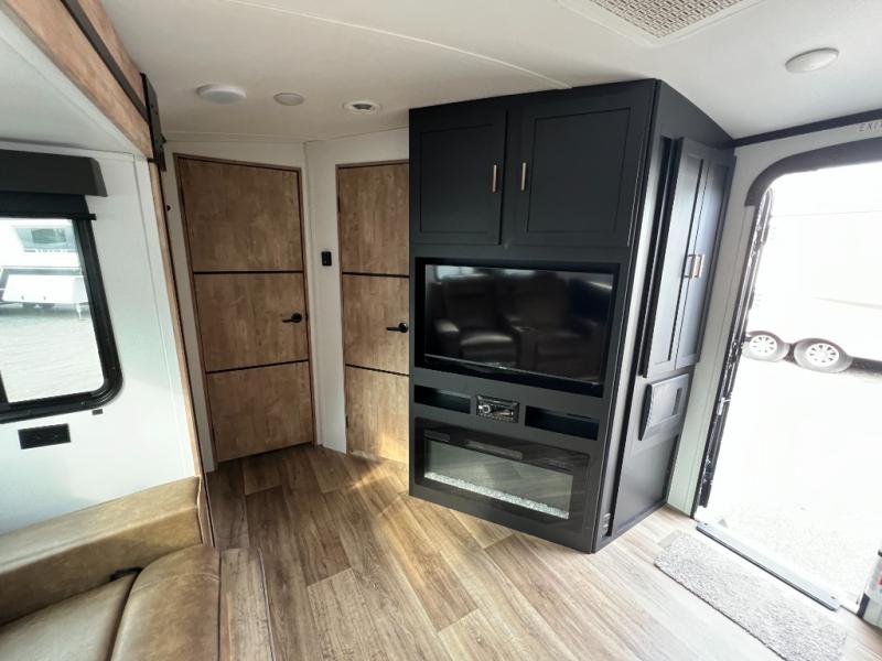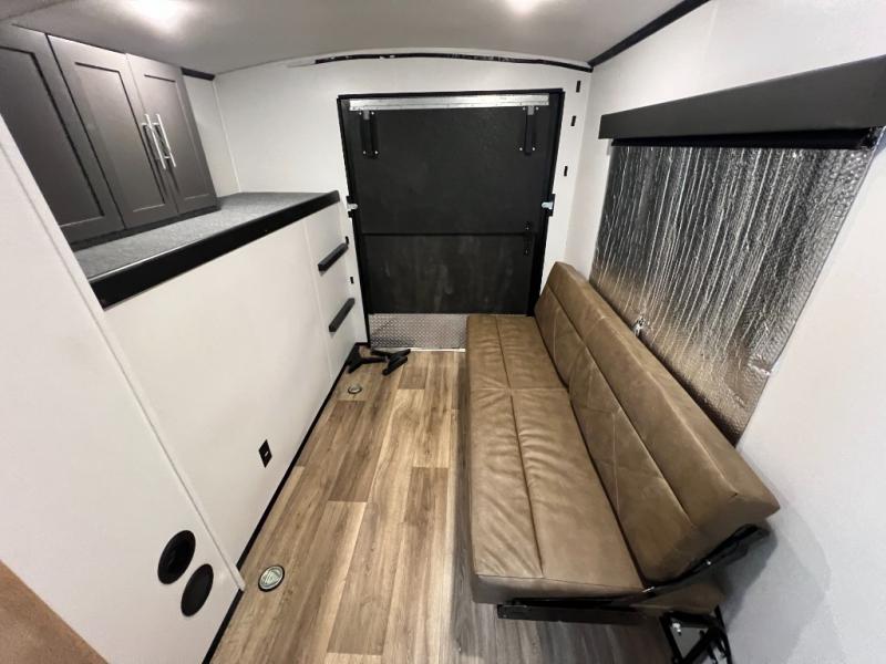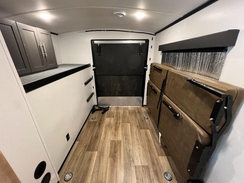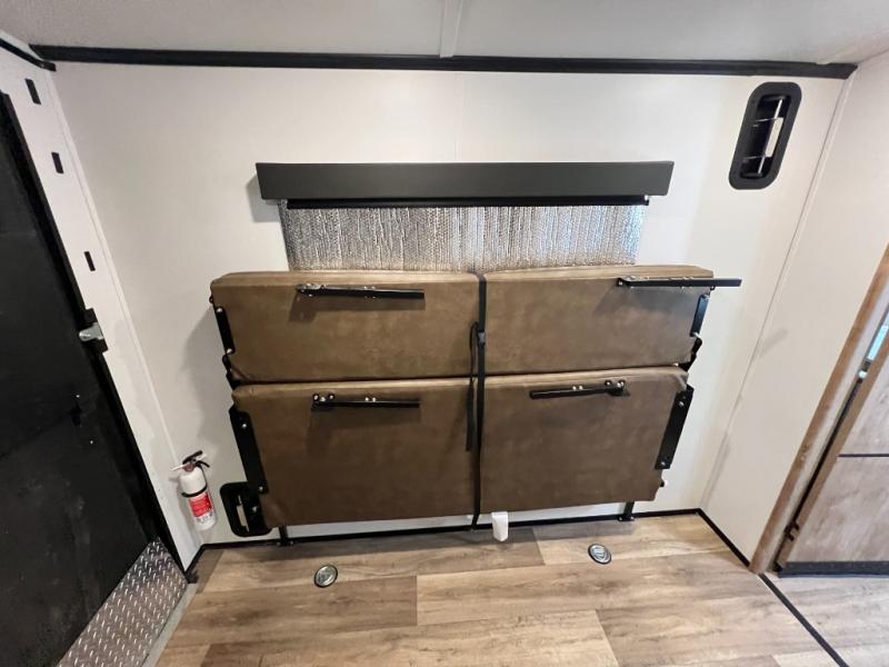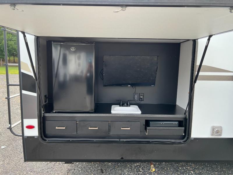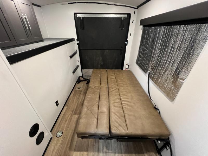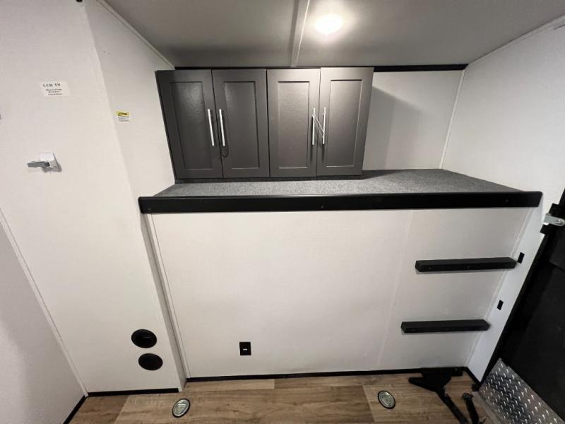 Looking to enjoy some off-road fun with your toys at an RV park that allows you to park your trailer? Then load up the rear 56" ramp door with extension into 8'4" of cargo space that once unloaded, someone can enjoy sleeping on a bunk above an entertainment center and a flip sofa sleeper. The main living and kitchen area offers two slides for more interior space, a kitchen island with skylight above, plus a pantry, a booth dinette and sofa sleeper, and a fireplace with 40" HDTV above for inside entertainment. The cook will have an outside kitchen to whip up some meals while others enjoy the 21' awning. You will find plenty of storage throughout including in the wardrobe slide in the bedroom, and there is a built-in pet kennel for your family's best friend.