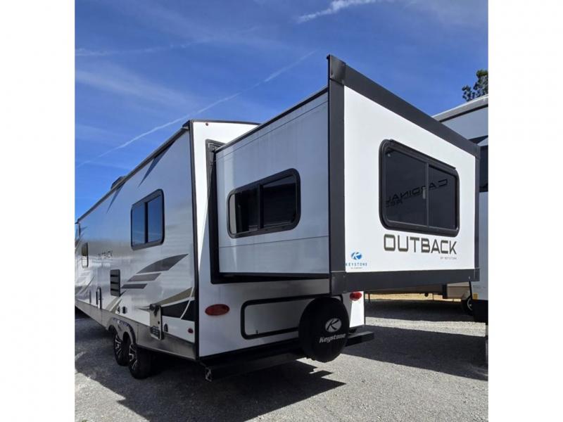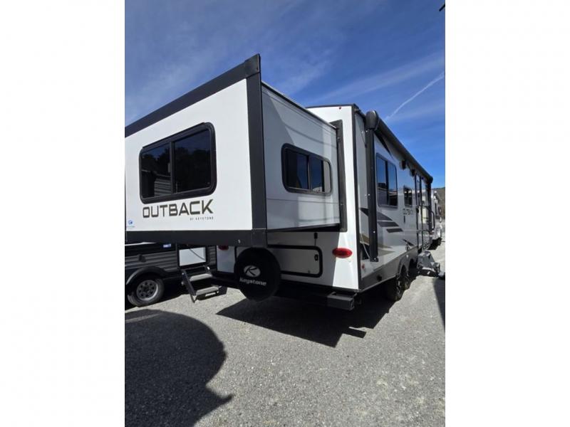 With any Outback Ultra Lite travel trailer or toy hauler by Keystone, you begin with a BAL Norco huck bolted "Z" channel frame, and there is a pinch rolled laminated gel-coated fiberglass exterior, a leaf spring suspension system, large panoramic black framed tinted safety glass windows, plus a power tongue jack and LCI power stabilizing jacks for easy setup. The interior offers pre-drilled and screwed hand-glazed modern cabinetry, extra tall slide height for maximum space, in-floor heating ducts, a Dream dinette with max-store for more storage space, and an On Demand hot water heater to mention a few highlights. Make your lightweight towing decision today, choose a comfortable and stylish Outback Ultra Lite today!