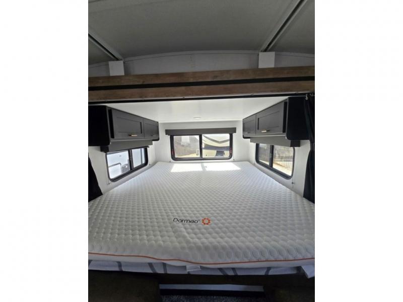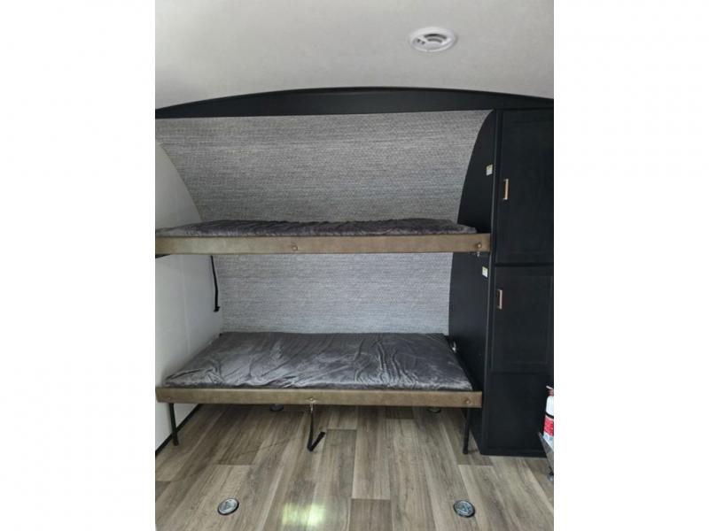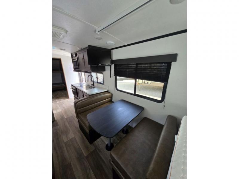 Easily load up your kayak, bicycles or dirt bikes into the front garage using the 56" side ramp door with extension to enjoy a weekend with your toys and friends! This room becomes a bunkhouse thanks to the two bunks and wardrobe along the front wall. There is a full bathroom to get cleaned up in after a ride or paddle, full kitchen amenities to stay fed including a 10 cu. ft. refrigerator and a pantry, plus a rear slide out king bed for more floor space inside as you sleep comfortably. Someone can also sleep on the booth dinette and sofa sleeper after easily being setup for nighttime.
