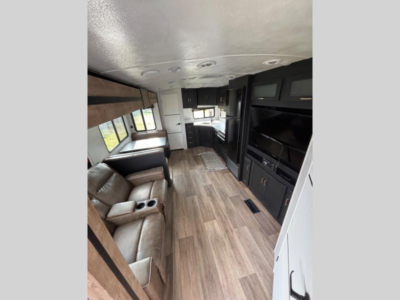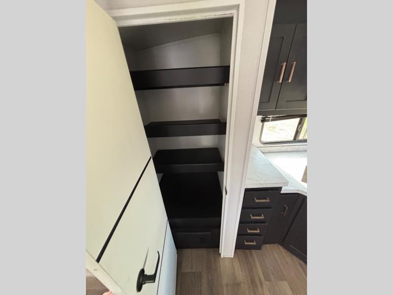A couple or a family will love this trailer's middle living area with a furniture slide out that includes a sofa sleeper and a booth dinette to relax on, dine at and even sleep on while watching the 50" TV. The rear of this trailer includes the kitchen which also is along one side of the trailer giving the cook a spacious area to make meals and clean up afterwards. The large pantry and 10 cu. ft. refrigerator will surely get utilized often, and the pull-out spice rack will come in handy. There is a double entry bathroom across from the entry which is convenient, plus the front bedroom has easy access. There is a queen bed with built-in pet kennel, a laundry chute, dual wardrobes and a door to close for privacy. There are options to choose from as well such as theater seating, an 8 cu. ft. refrigerator, and/or adding SolarFlex.