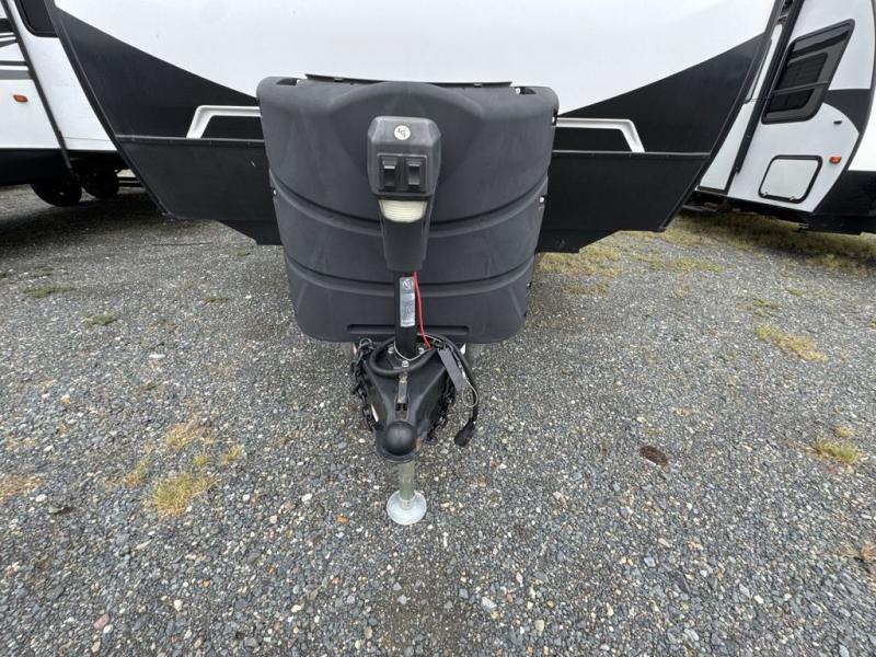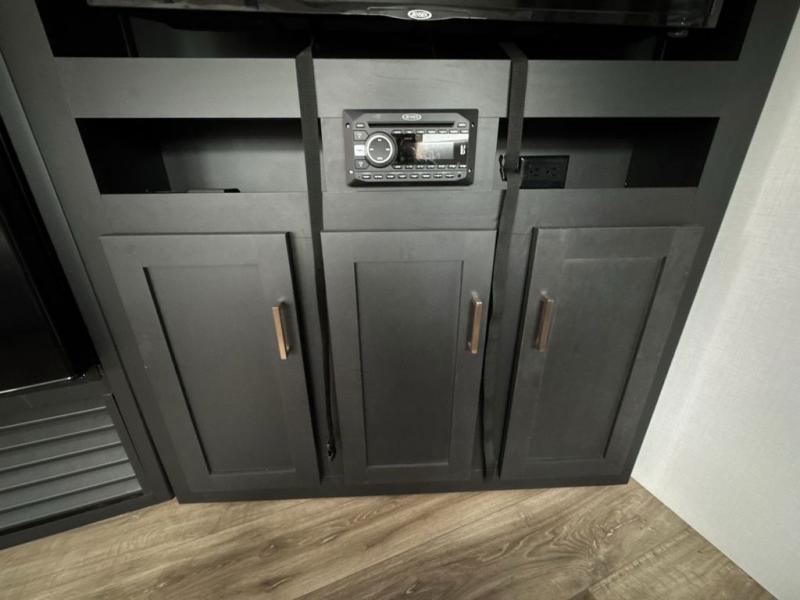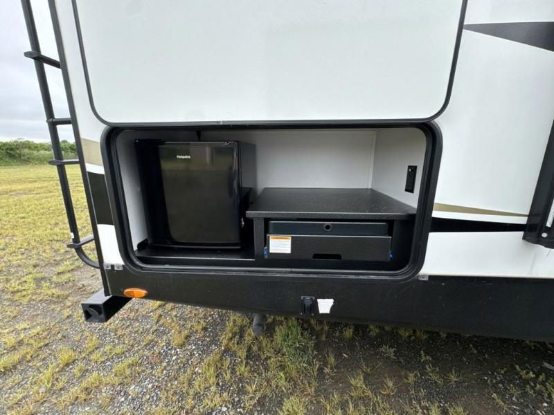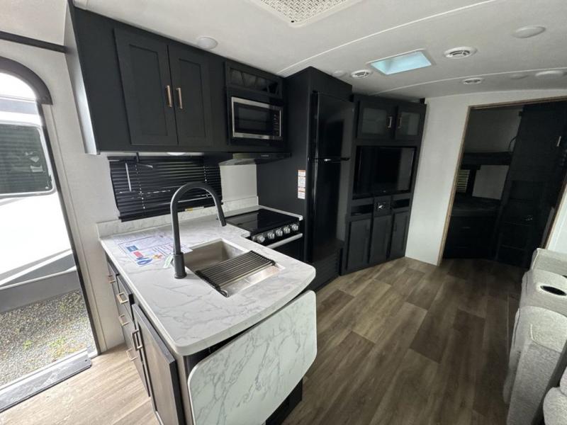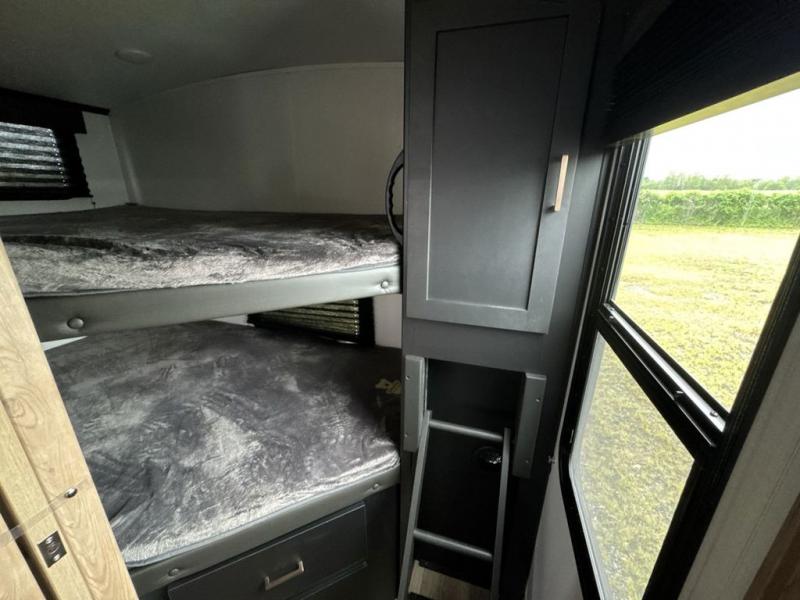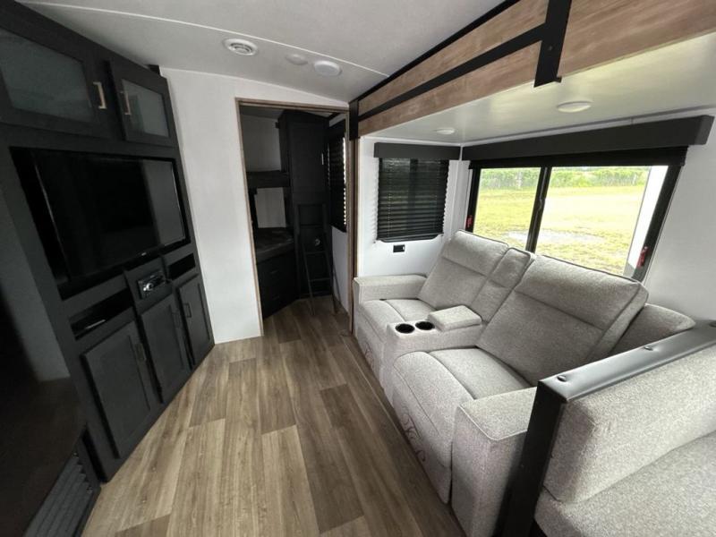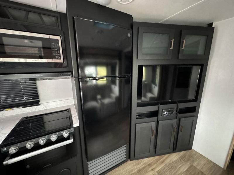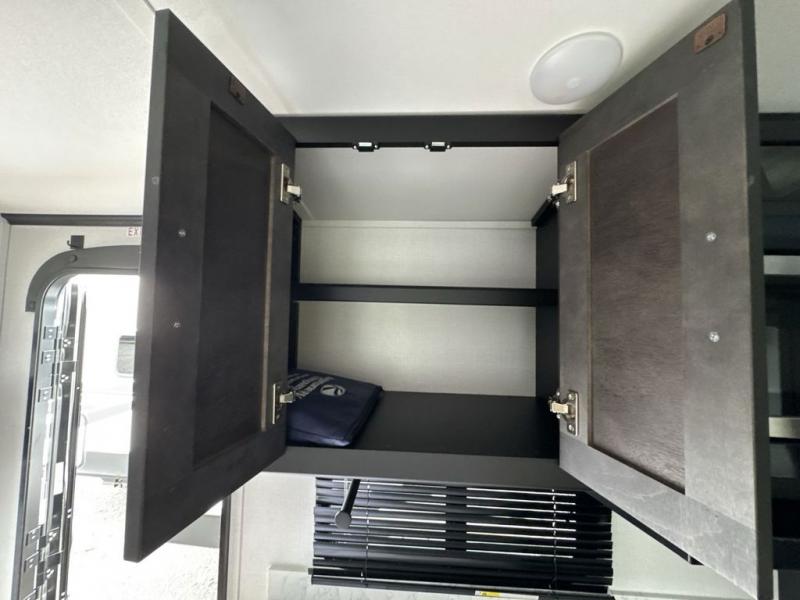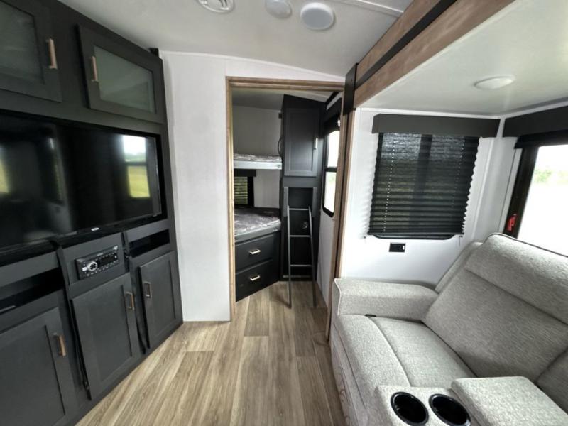 Get out and explore, hike, and camp in comfort! This trailer offers a private bunkhouse with double-size bunks and a wardrobe, a private front bedroom with a walk-around queen bed with a built-in pet kennel for your family's best friend, a laundry chute to keep everything tidy, and dual wardrobes for your clothing. You can access the walk-through bathroom from the bedroom and the main living and kitchen area through barn slider doors. Your guests can sleep on the sofa sleeper and booth dinette slide out while watching the 40" TV with entertainment center after grabbing some snacks from the hidden pantry. There are full kitchen amenities inside, plus there is an outside kitchen to use, a 21' awning offers protection from the elements, and a pass-through storage to carry your larger gear like fishing poles, an outdoor table, and camping chairs.