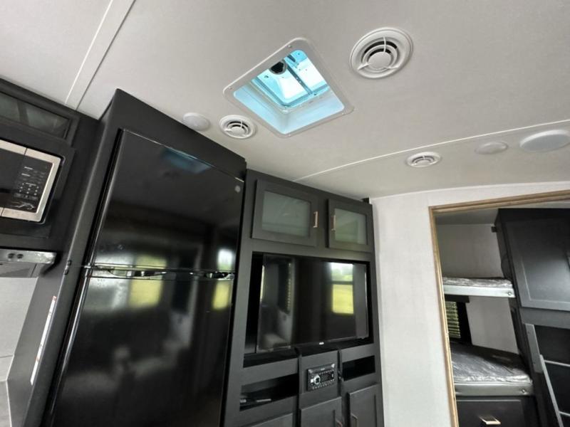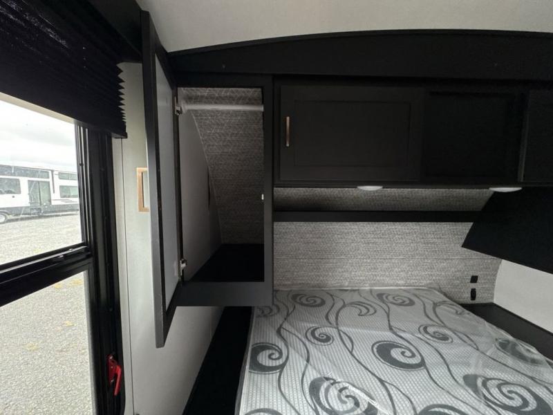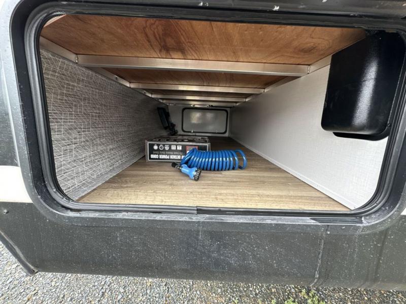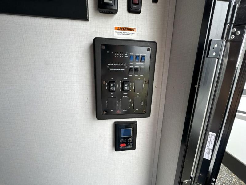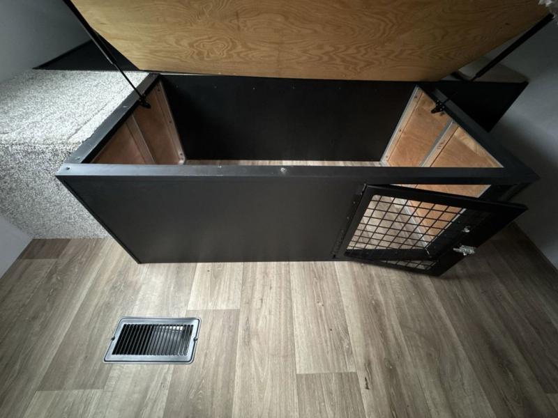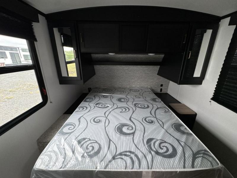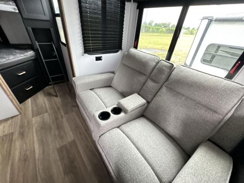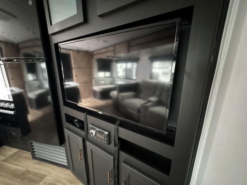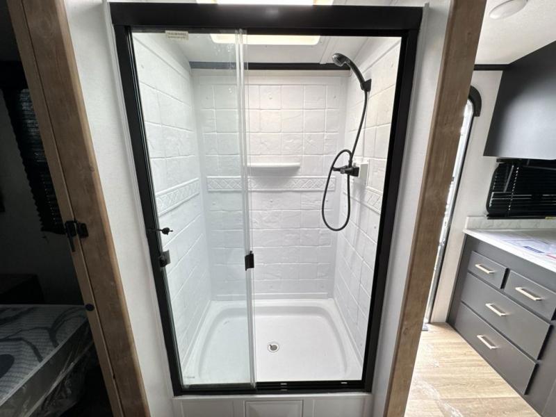 Get out and explore, hike, and camp in comfort! This trailer offers a private bunkhouse with double-size bunks and a wardrobe, a private front bedroom with a walk-around queen bed with a built-in pet kennel for your family's best friend, a laundry chute to keep everything tidy, and dual wardrobes for your clothing. You can access the walk-through bathroom from the bedroom and the main living and kitchen area through barn slider doors. Your guests can sleep on the sofa sleeper and booth dinette slide out while watching the 40" TV with entertainment center after grabbing some snacks from the hidden pantry. There are full kitchen amenities inside, plus there is an outside kitchen to use, a 21' awning offers protection from the elements, and a pass-through storage to carry your larger gear like fishing poles, an outdoor table, and camping chairs.