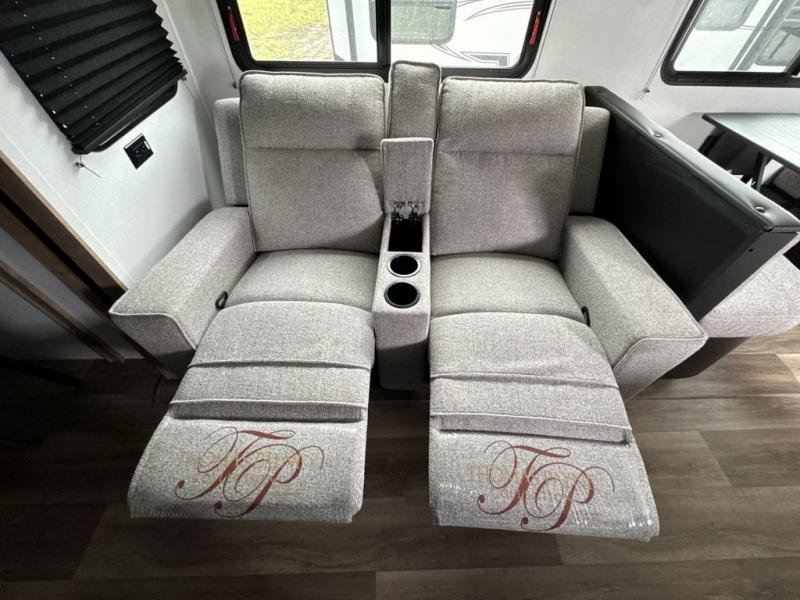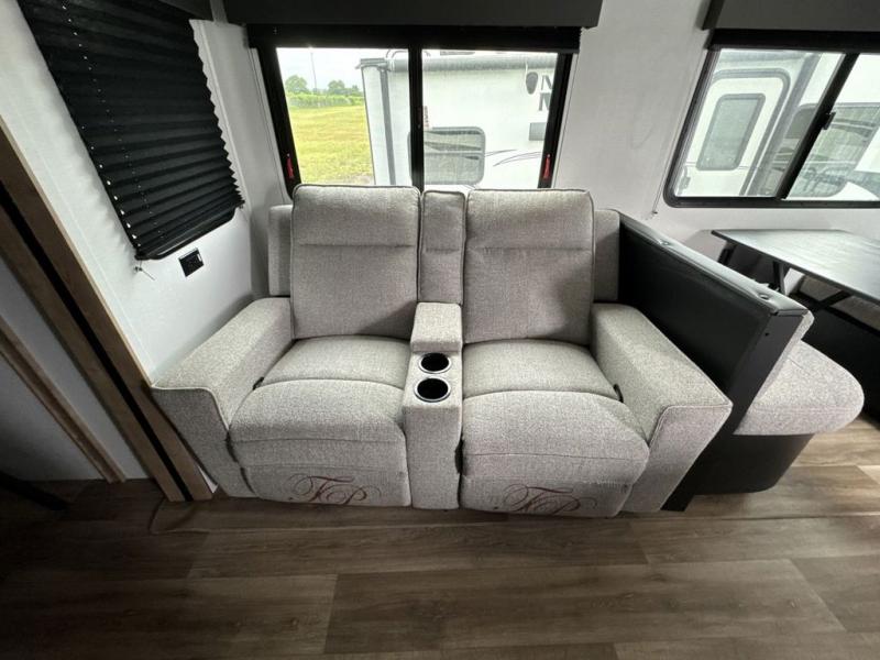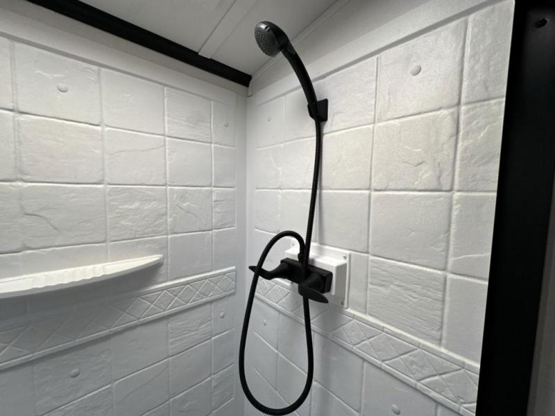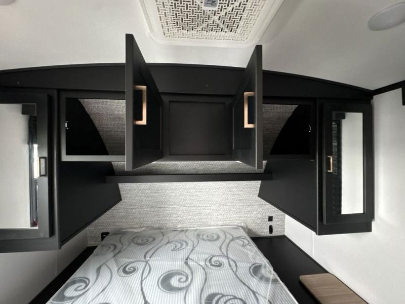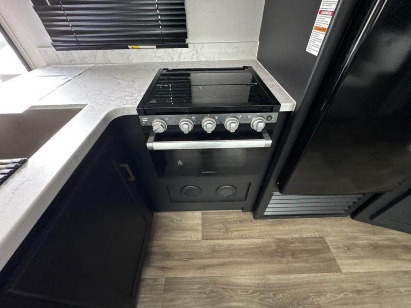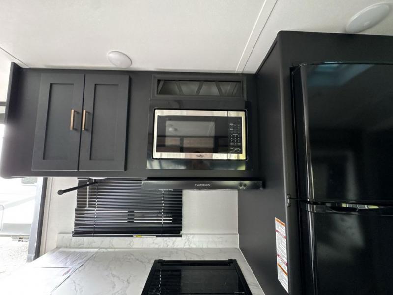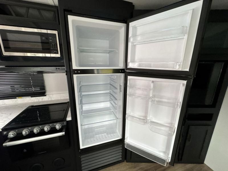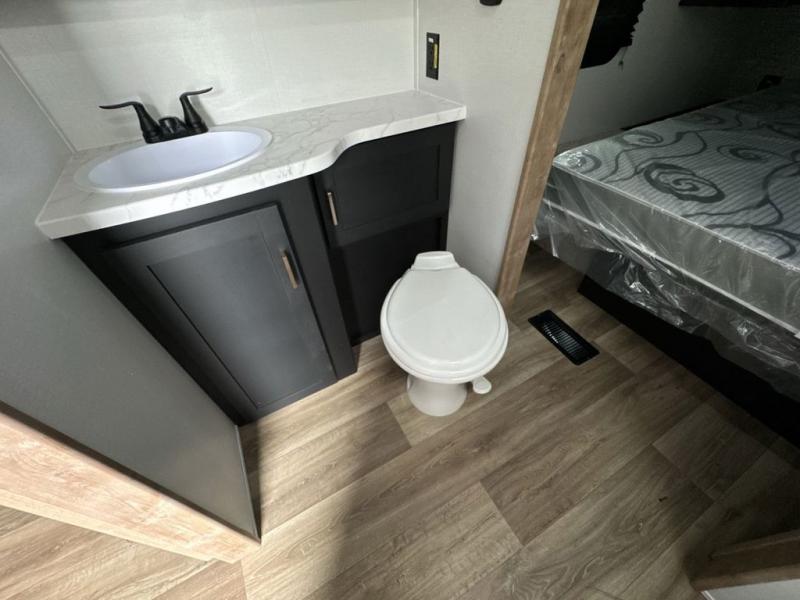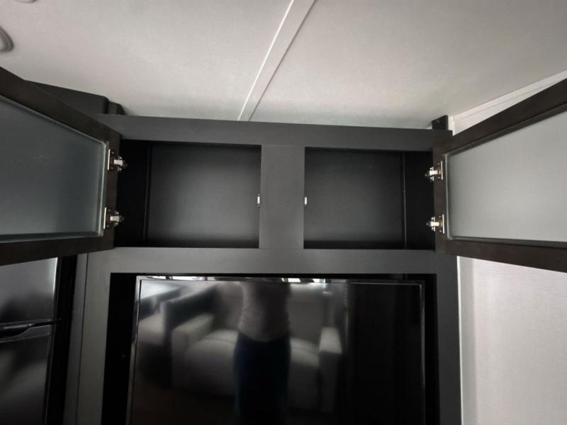 Get out and explore, hike, and camp in comfort! This trailer offers a private bunkhouse with double-size bunks and a wardrobe, a private front bedroom with a walk-around queen bed with a built-in pet kennel for your family's best friend, a laundry chute to keep everything tidy, and dual wardrobes for your clothing. You can access the walk-through bathroom from the bedroom and the main living and kitchen area through barn slider doors. Your guests can sleep on the sofa sleeper and booth dinette slide out while watching the 40" TV with entertainment center after grabbing some snacks from the hidden pantry. There are full kitchen amenities inside, plus there is an outside kitchen to use, a 21' awning offers protection from the elements, and a pass-through storage to carry your larger gear like fishing poles, an outdoor table, and camping chairs.