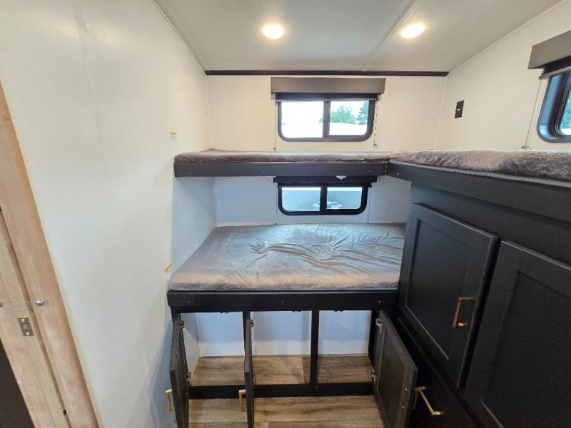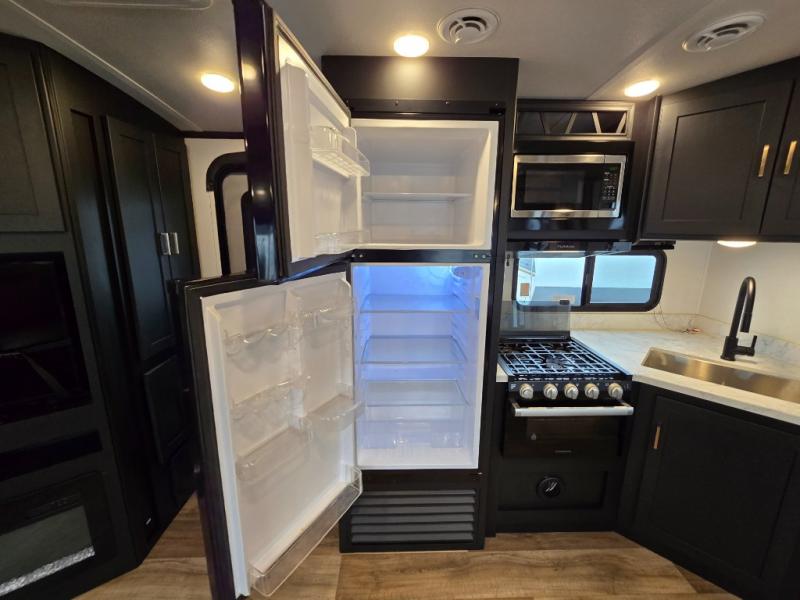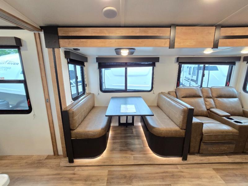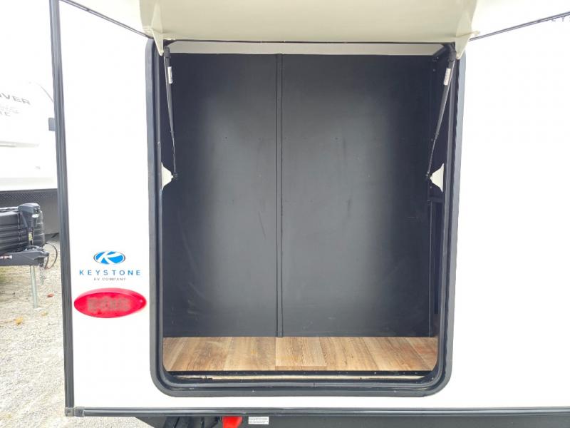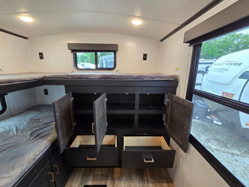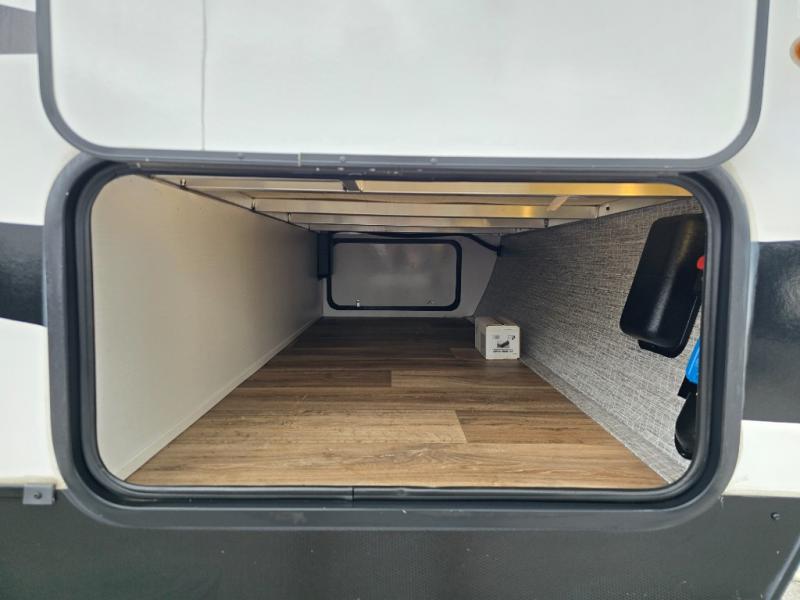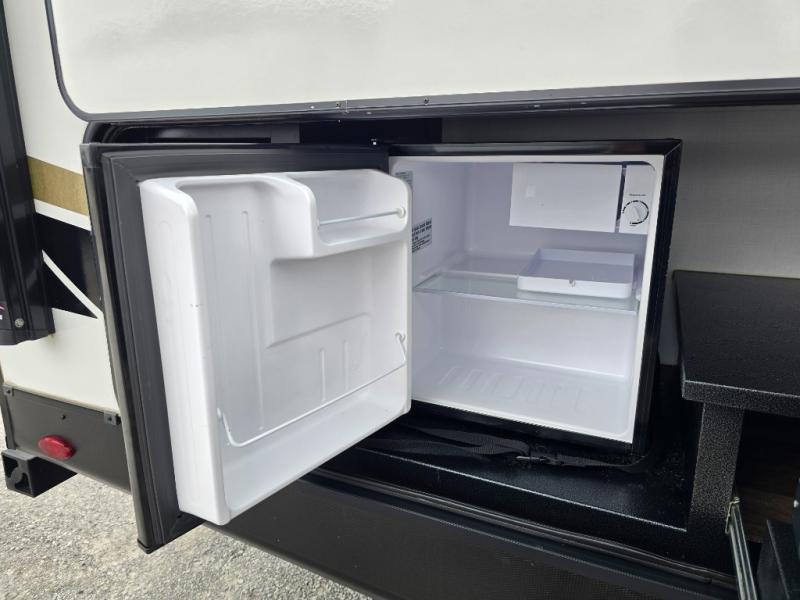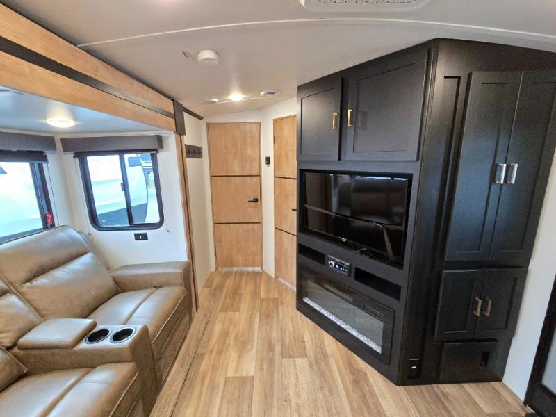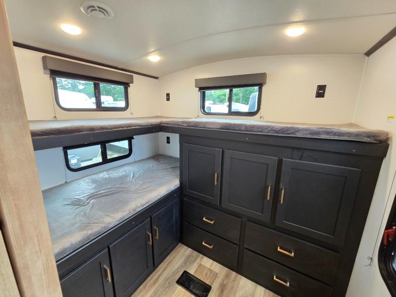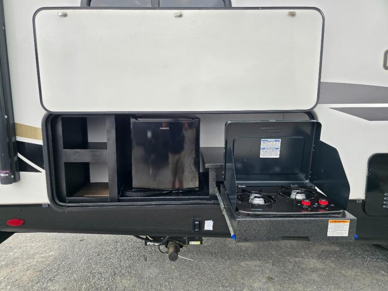 Loaded with features, you are sure to enjoy each and every camping trip in this trailer with your family and friends every chance you get! You can load up the pass-through storage with the larger camping gear like camp chairs, folding tables, charcoal and even fishing poles. The 21' awning offers an outdoor living area with some protection, the outside kitchen gives the cook choices when feeding everyone, and the LCI Solid Step entry allows a safe entrance and exit. There is a private rear bunkhouse with triple bunk beds, a sliding door for privacy and a window for views. The main living and kitchen area is spacious with a slide out booth dinette and sofa sleeper or choose the theater seating option. Everyone can gather to watch the 40" TV and enjoy the fireplace. You will also find a double entry bathroom, and a private front bedroom to sleep like a queen with your pet.