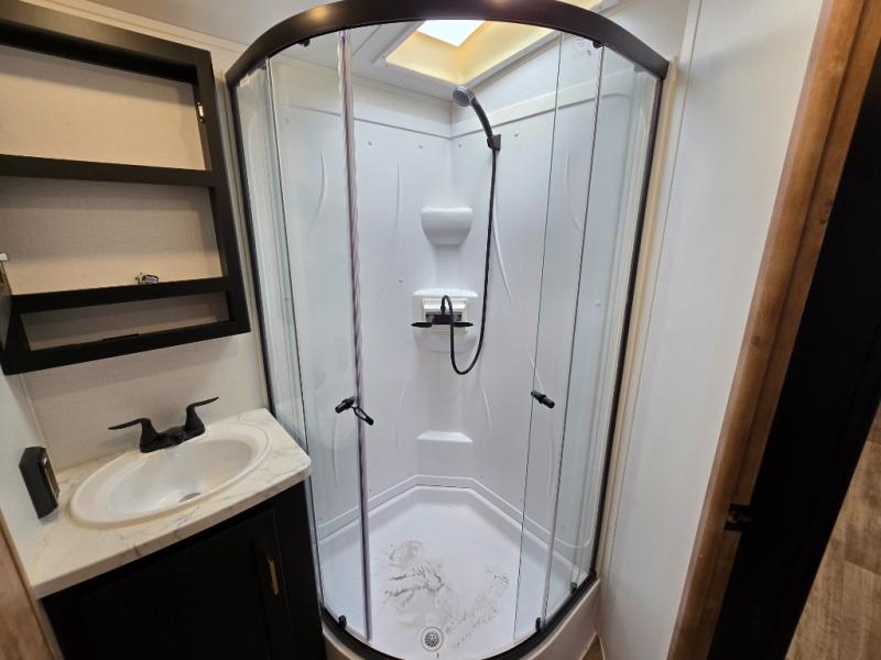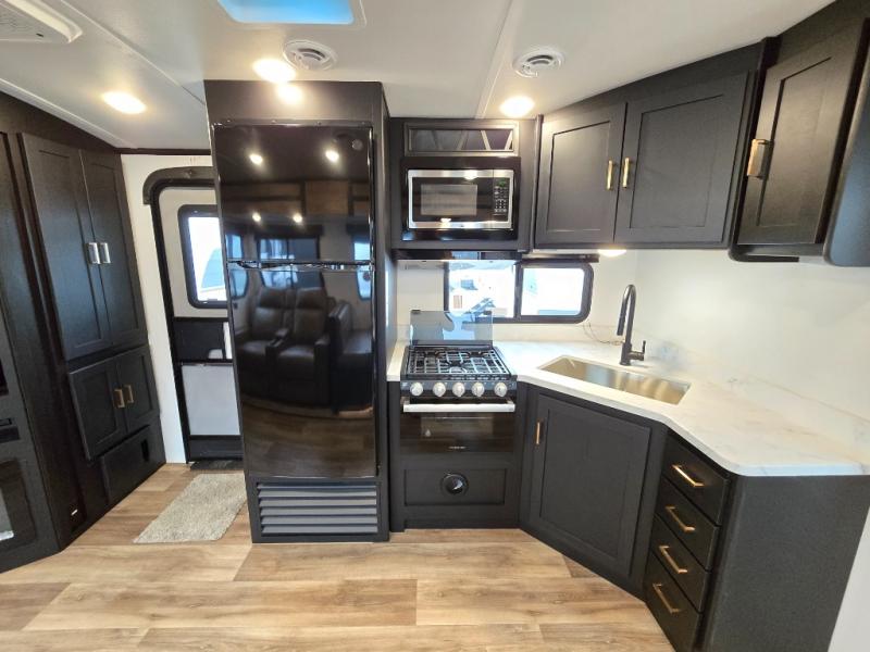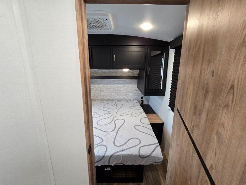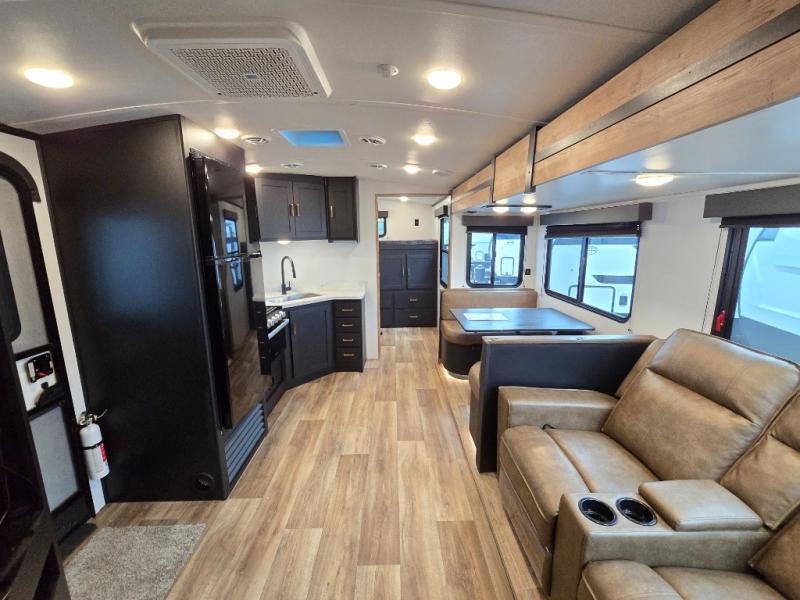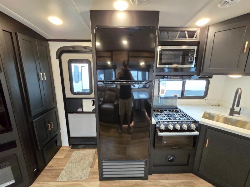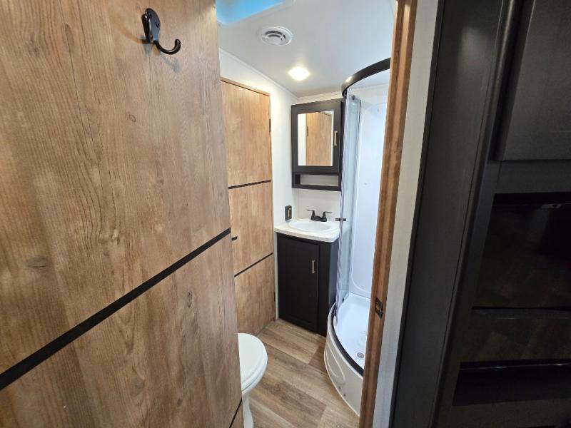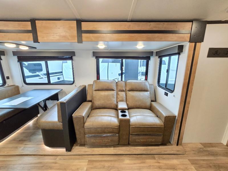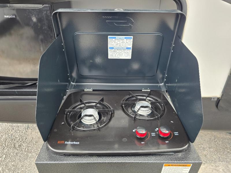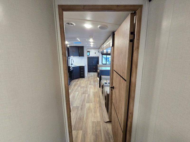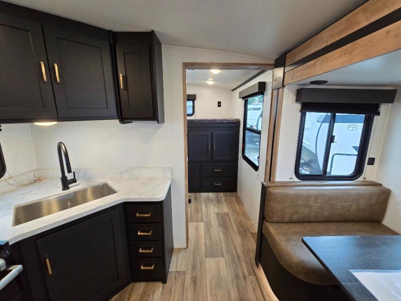 Loaded with features, you are sure to enjoy each and every camping trip in this trailer with your family and friends every chance you get! You can load up the pass-through storage with the larger camping gear like camp chairs, folding tables, charcoal and even fishing poles. The 21' awning offers an outdoor living area with some protection, the outside kitchen gives the cook choices when feeding everyone, and the LCI Solid Step entry allows a safe entrance and exit. There is a private rear bunkhouse with triple bunk beds, a sliding door for privacy and a window for views. The main living and kitchen area is spacious with a slide out booth dinette and sofa sleeper or choose the theater seating option. Everyone can gather to watch the 40" TV and enjoy the fireplace. You will also find a double entry bathroom, and a private front bedroom to sleep like a queen with your pet.