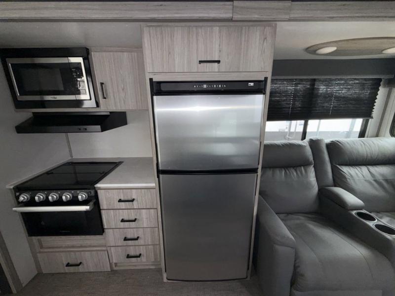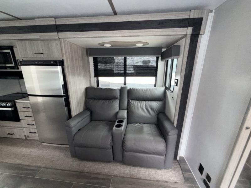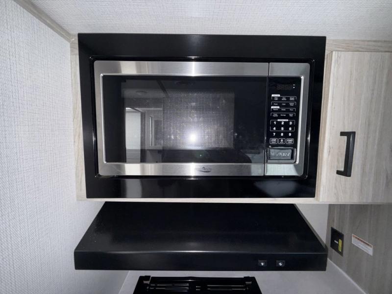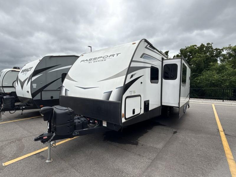 You can take many different kinds of trips with this Passport SL travel trailer! Once you get to the campsite and set up the 19' awning, you can remove your travel gear from the exterior pass-through storage to create your own little retreat. On the interior, the front private bedroom provides you with a queen-size bed, nightstands, and bedside wardrobes so that you can easily get changed every morning and night. The large slide out in the main living area will add to the amount of living space on the interior without adding to the overall width of the trailer. As the night comes to a close, you can heat up a bag of popcorn in the microwave before sitting down in the tri-fold sofa sleeper which could be switched out for the optional theater seating.