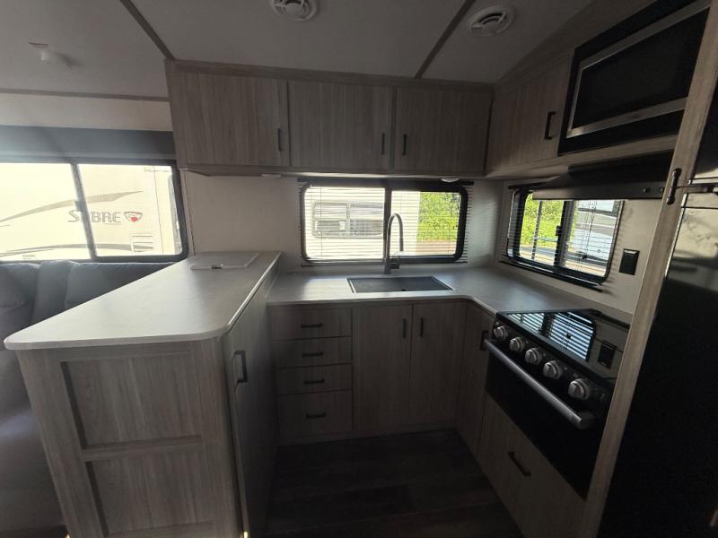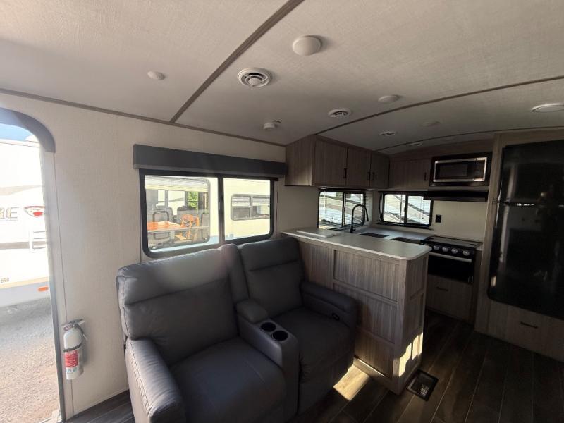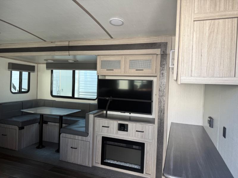 This travel trailer is decked out in comforts! The rear kitchen has everything you need to prepare your best home cooked meals including a raised countertop with trash can storage. Enjoy your meals at the U-shaped dinette or switch it out for the optional free standing dinette. Relax in the theater seats or optional tri-fold sofa sleeper across from the entertainment center with storage, a TV, and a fireplace for a cozy evening indoors. Get a good night's rest on the queen bed in the front private bedroom and keep your clothes looking their best with the closet and wardrobes on either side of the bed. You even have an outside kitchen to grill some juicy burgers on the pull-out cooktop while watching the others play a game of cornhole!