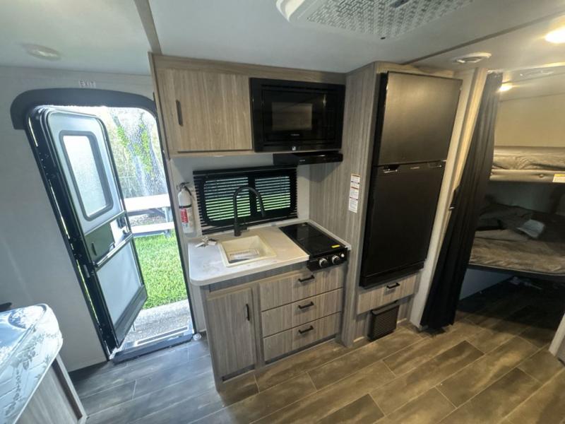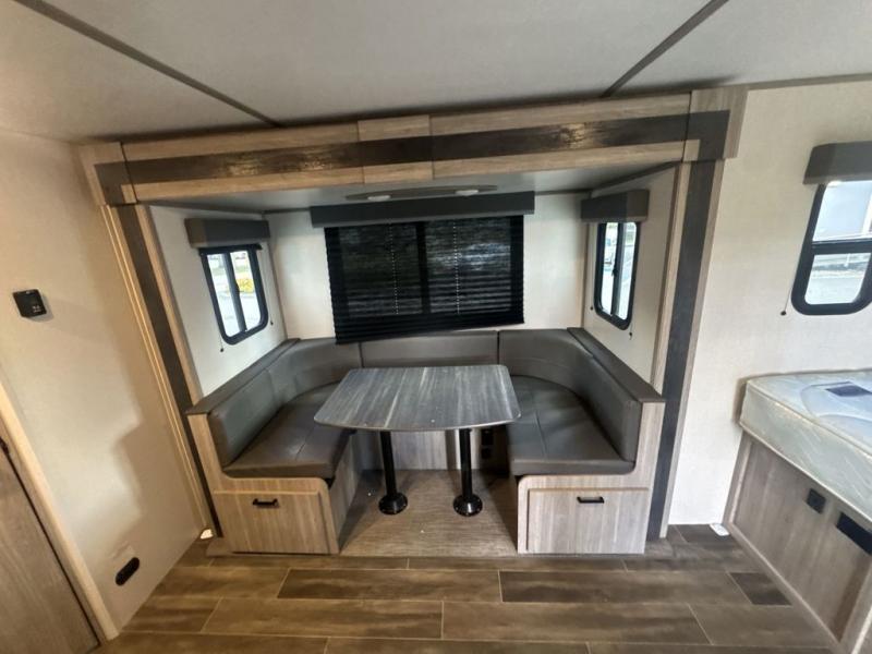 The perfect bunk model for a family with children or those that like to camp with friends. This unit can easily sleep eight with a set of 52" x 74" double bed bunks, a 60" x 80" queen bed, plus the u-shaped dinette can be transformed at night for two more! This unit also gives you the option of cooking inside or out with the exterior kitchen featuring a refrigerator and pull-out griddle. Imagine whipping up breakfast with pancakes outside while everyone enjoys a little outdoor time beforehand. Dine indoors at the u-shaped dinette or picnic outside instead. You will also appreciate the indoor kitchen amenities featuring a two burner cooktop, refrigerator, and sink. And, the convenient rear corner bath including a 24" x 36" shower with skylight overhead, a toilet and sink, will eliminate late night trips with a flashlight to the public bathroom at the campground.