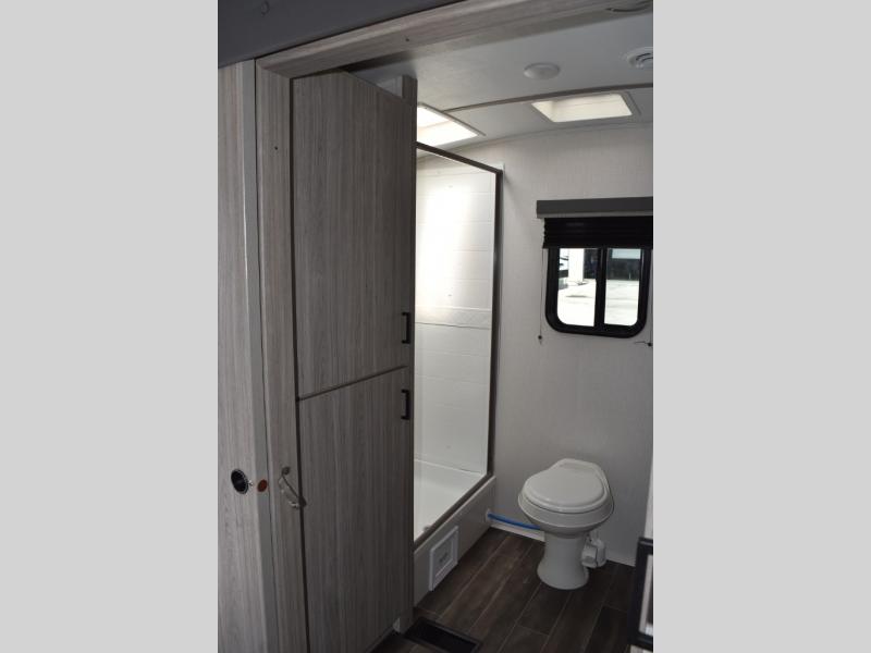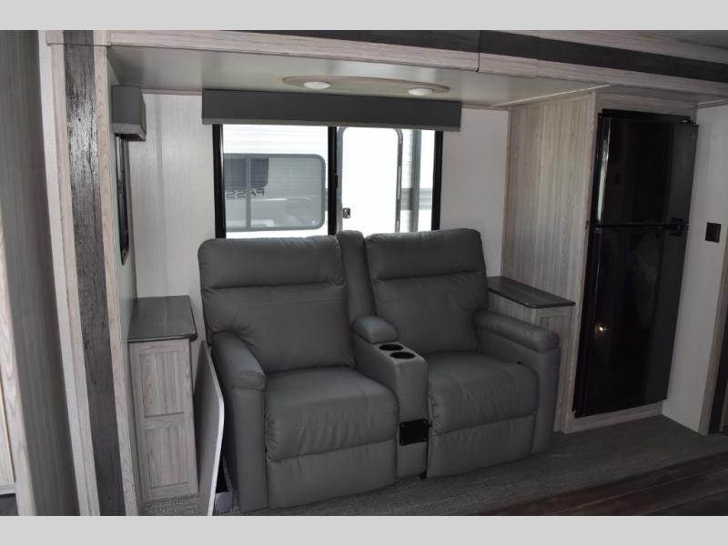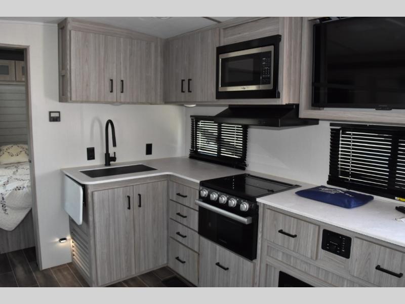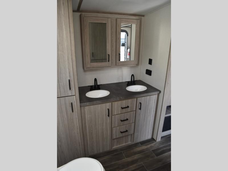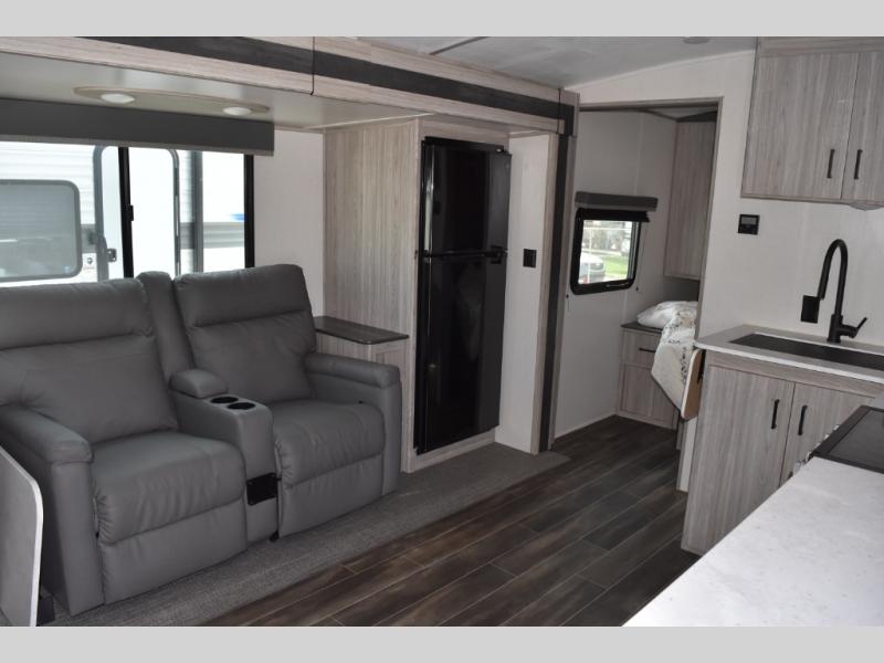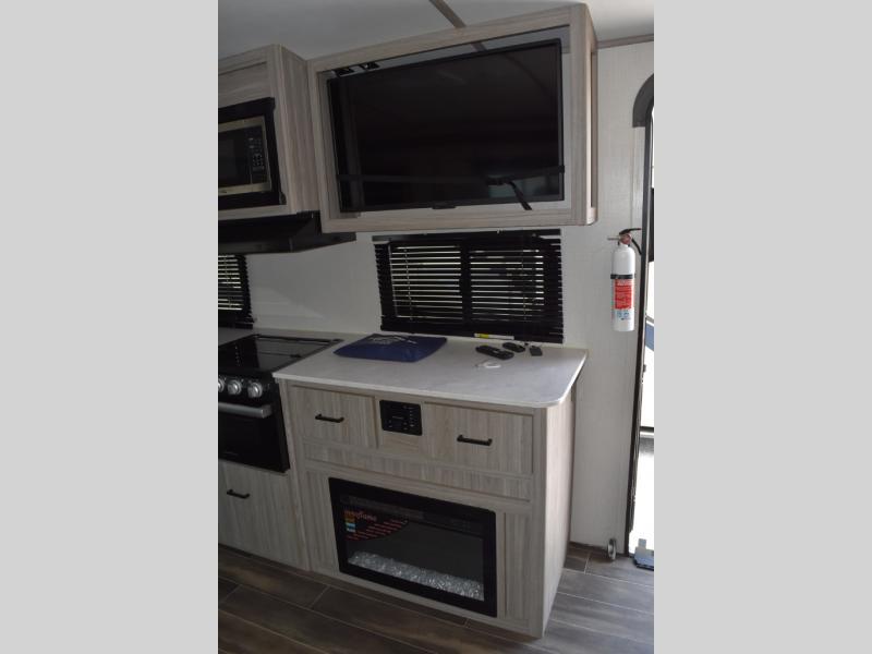 You won't even feel like you're camping in the woods with this travel trailer! It features a front private bedroom with a queen bed to lay your head on at night and wardrobes/nightstands on either side of it for your items. Prepare your best home cooked meals with the three burner cooktop and flip-up countertop, then enjoy them at the U-shaped dinette with the refrigerator right next to it so you don't have to go far for a drink refill. The dinette is also across from the entertainment center with a fireplace for a cozy evening indoors, plus you can switch out the dinette for an optional theater dinette. The full rear bathroom has a dual sink vanity for two to get ready at once and an area prepped to add an optional washer and dryer for clean clothes the whole trip!