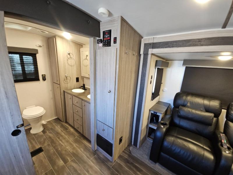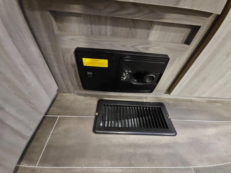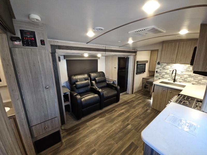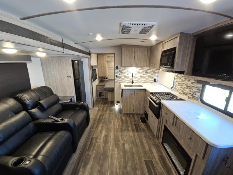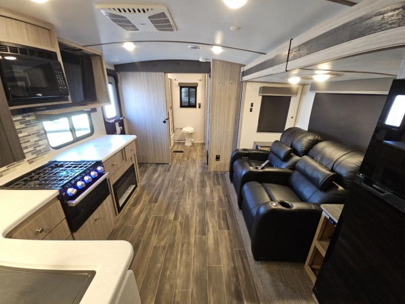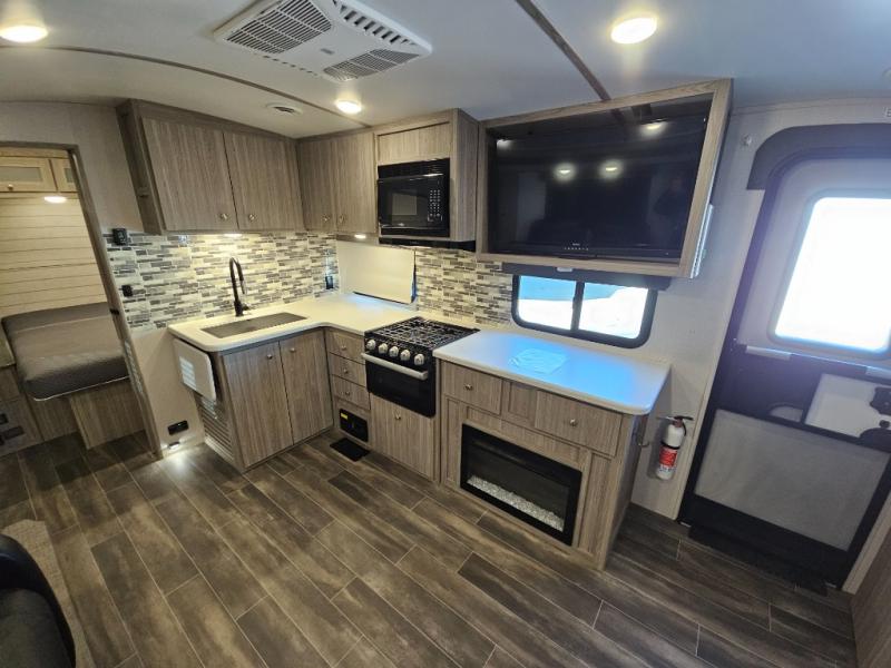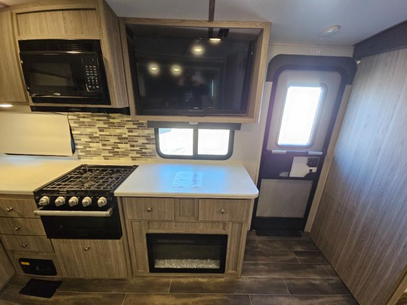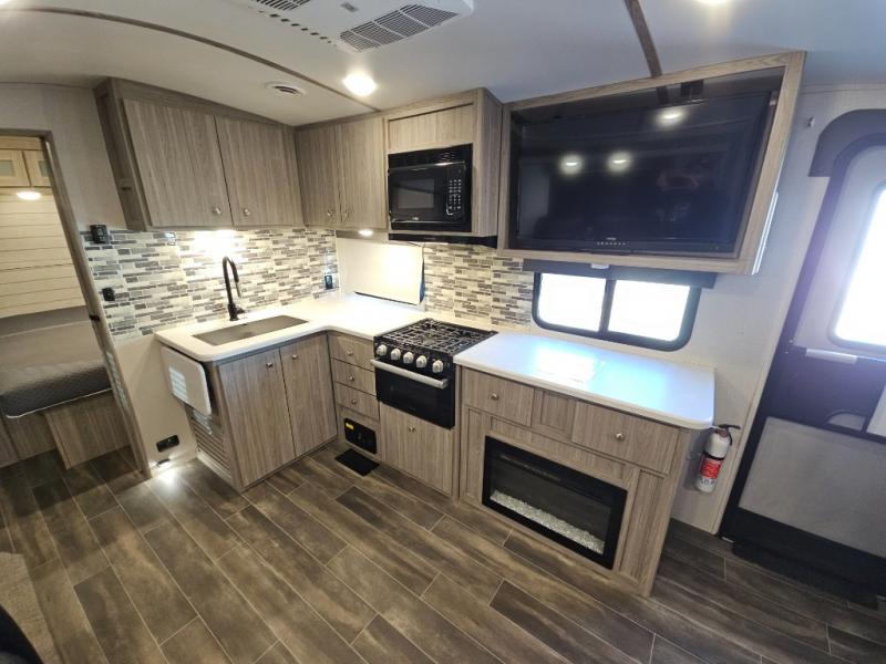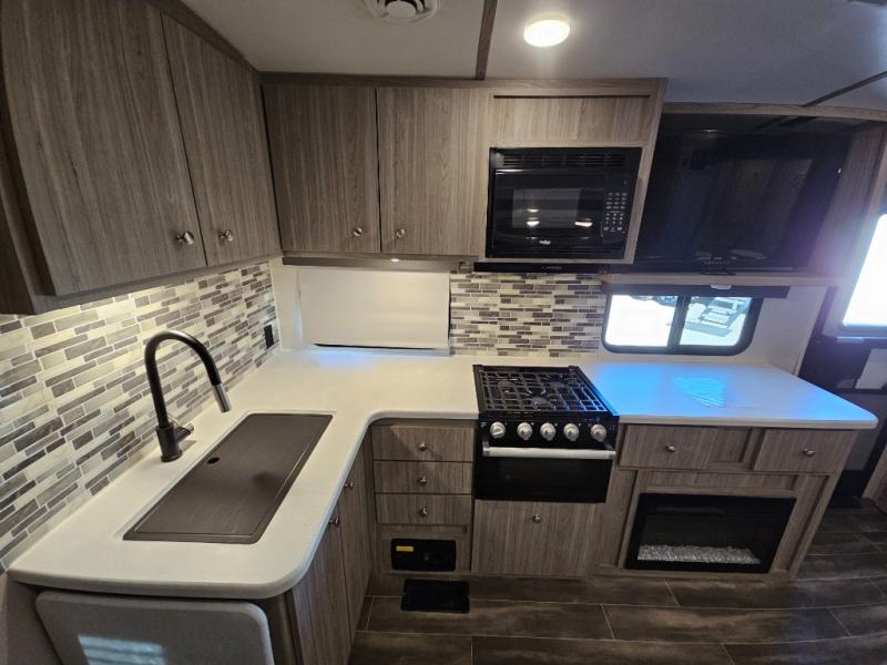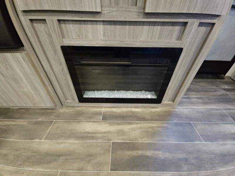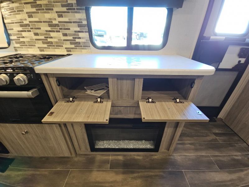 You won't even feel like you're camping in the woods with this travel trailer! It features a front private bedroom with a queen bed to lay your head on at night and wardrobes/nightstands on either side of it for your items. Prepare your best home cooked meals with the three burner cooktop and flip-up countertop then enjoy them at the U-shaped dinette with the refrigerator right next to it so you don't have to go far for a drink refill. The dinette is also across from the entertainment center with a fireplace for a cozy evening indoors, plus you can switch out the dinette for an optional theater dinette. The full rear bathroom has a dual sink vanity for two to get ready at once and an area prepped to add an optional washer and dryer for clean clothes the whole trip!
