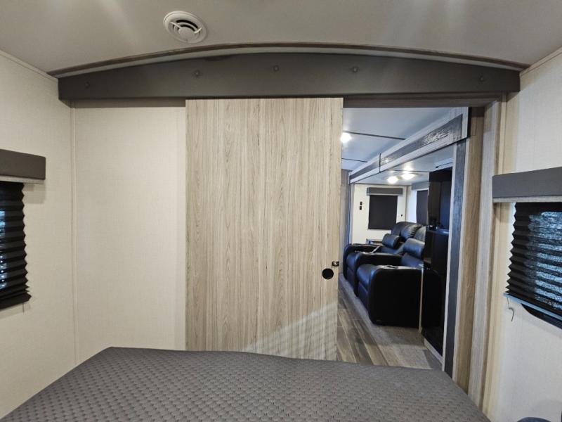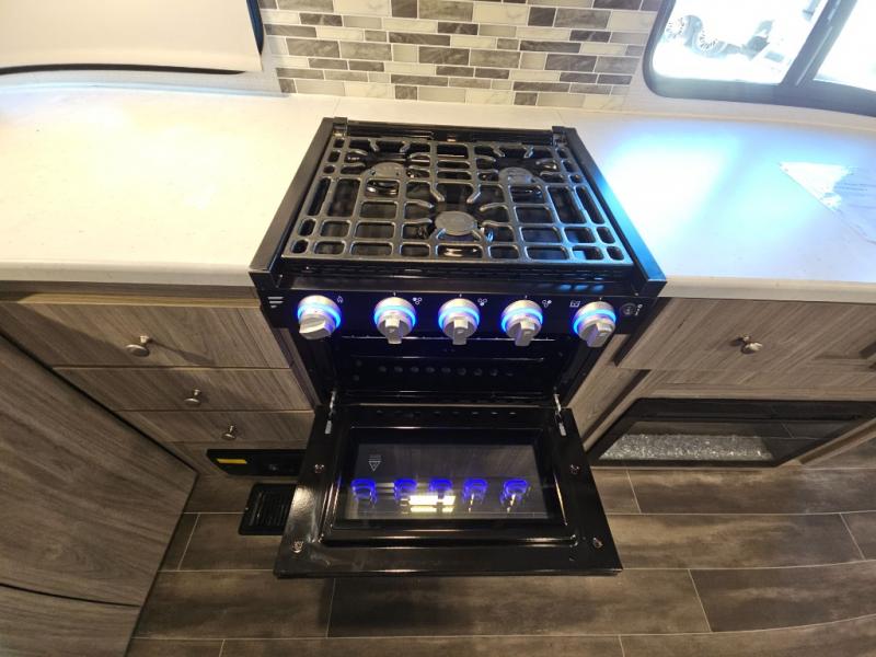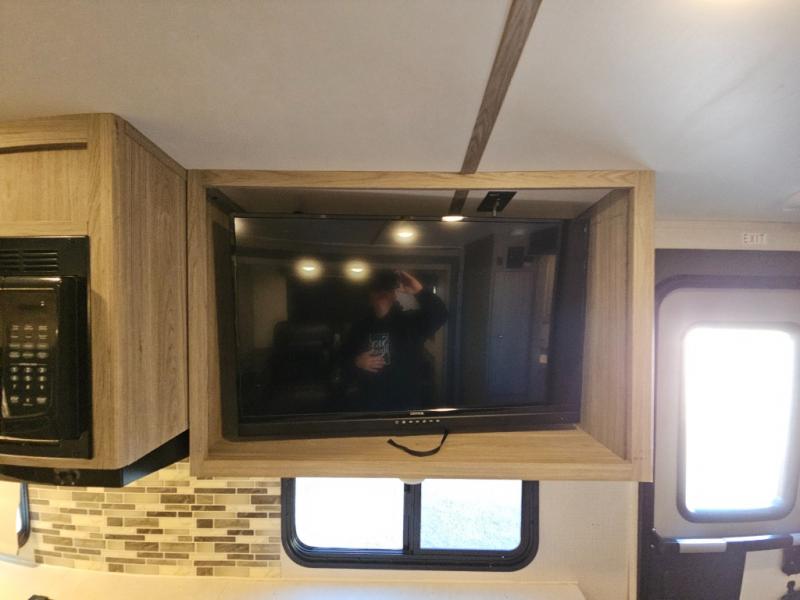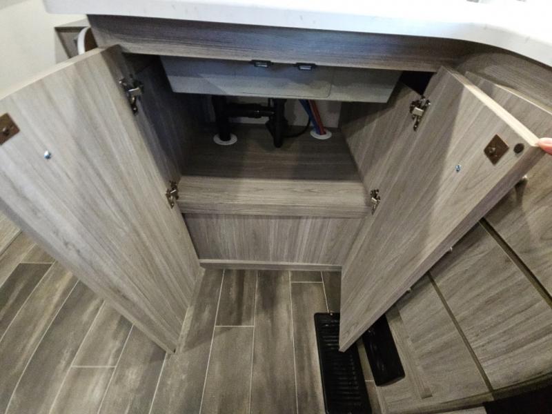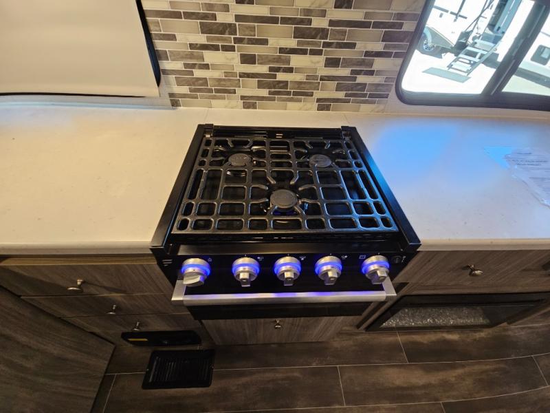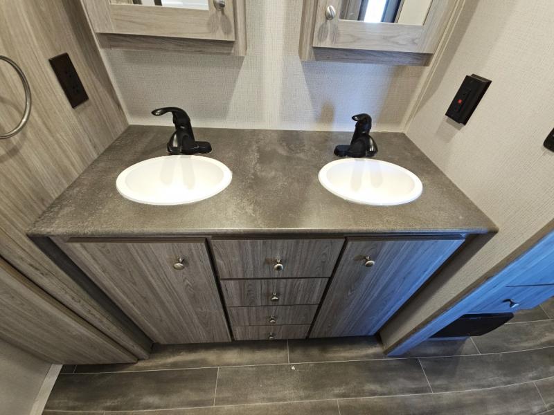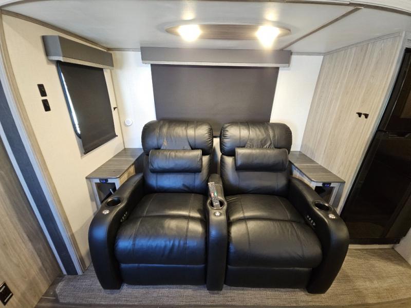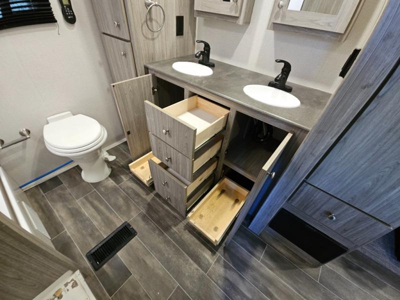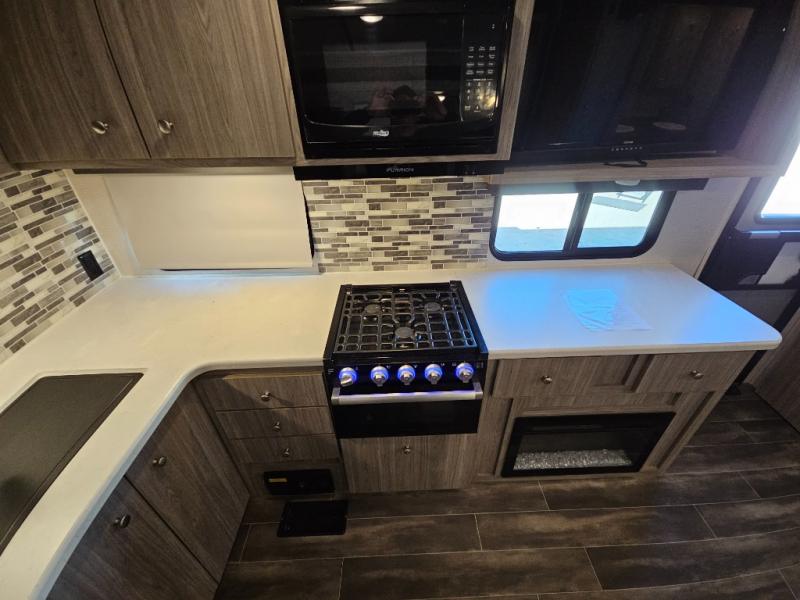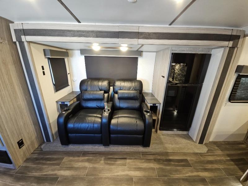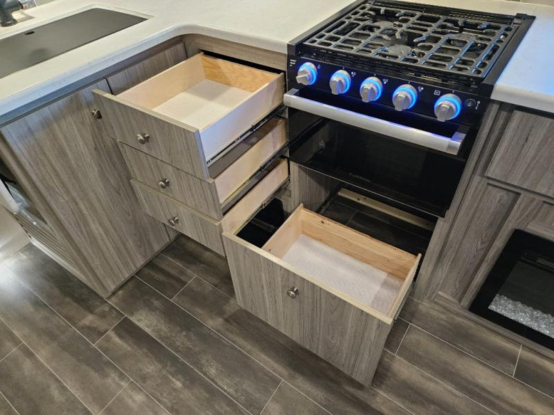 You won't even feel like you're camping in the woods with this travel trailer! It features a front private bedroom with a queen bed to lay your head on at night and wardrobes/nightstands on either side of it for your items. Prepare your best home cooked meals with the three burner cooktop and flip-up countertop then enjoy them at the U-shaped dinette with the refrigerator right next to it so you don't have to go far for a drink refill. The dinette is also across from the entertainment center with a fireplace for a cozy evening indoors, plus you can switch out the dinette for an optional theater dinette. The full rear bathroom has a dual sink vanity for two to get ready at once and an area prepped to add an optional washer and dryer for clean clothes the whole trip!