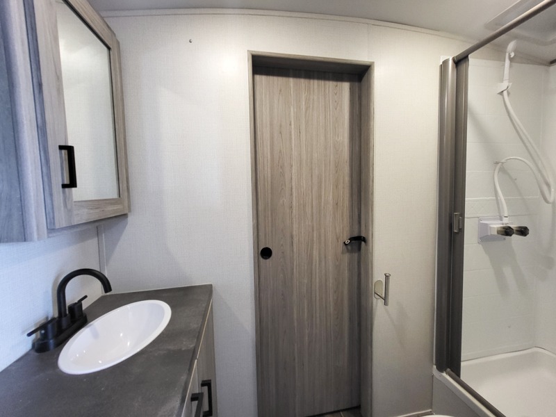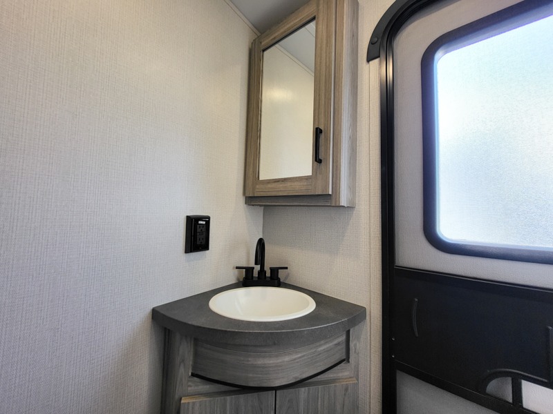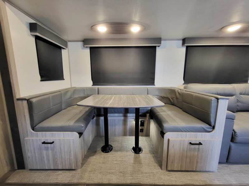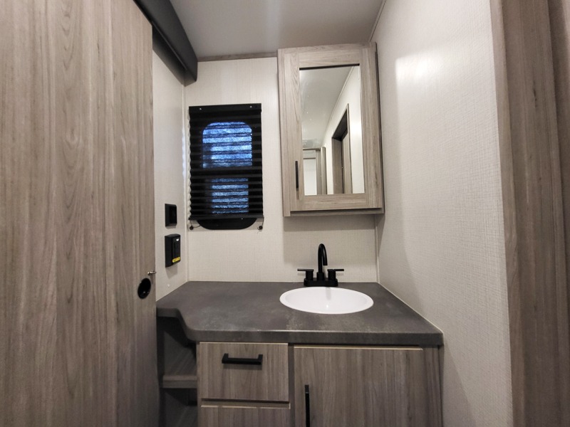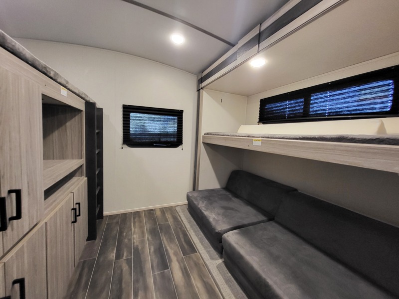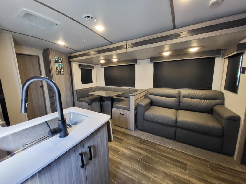 It's a clean decision to choose this travel trailer with a bath and a half! The half bathroom even has one of the dual entry doors to the unit for a quick bathroom break while playing outside. Inside the rear private bunkhouse is a 38" x 74" bunk across from a slide with a 28" x 74" top bunk above two k-cubes. The chef can prepare their best meals with the three burner cooktop and flip-up countertop indoors and outdoors with the outside kitchen that has a pull-out cooktop and refrigerator. Enjoy your meals at the U-shaped dinette and relax on the tri-fold sleeper. You could even swap them out for the optional pivot furniture for versatile living with the ability to flip back and forth between a dinette or sofa option. The walk-in pantry is big enough to store everyone's snacks and the walk-through bathroom is easy to access especially for those staying in the front private bedroom!