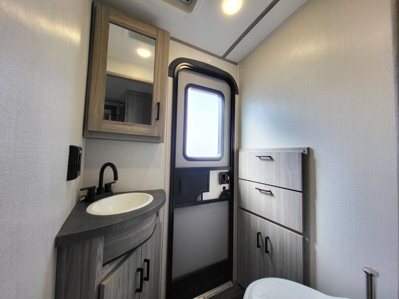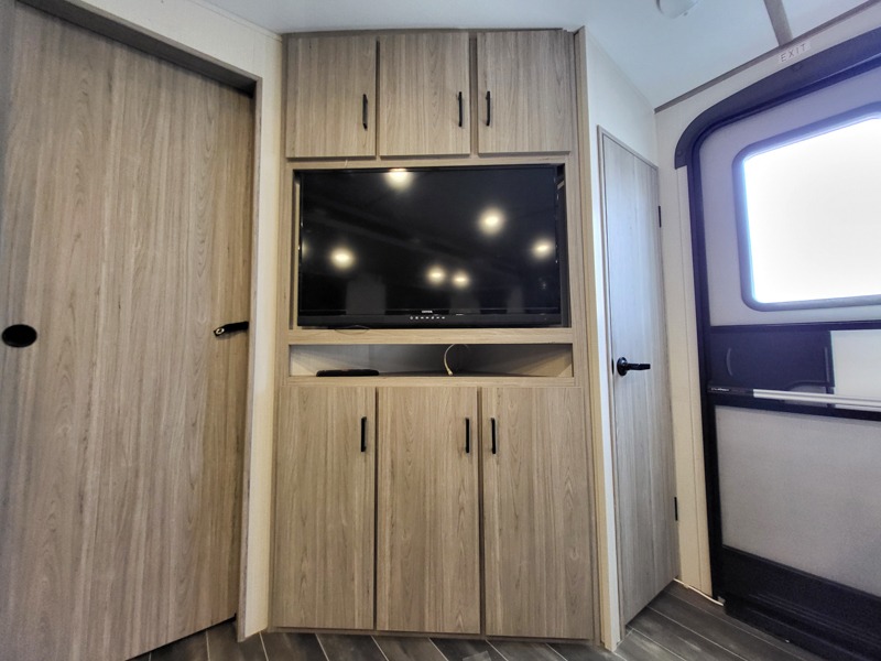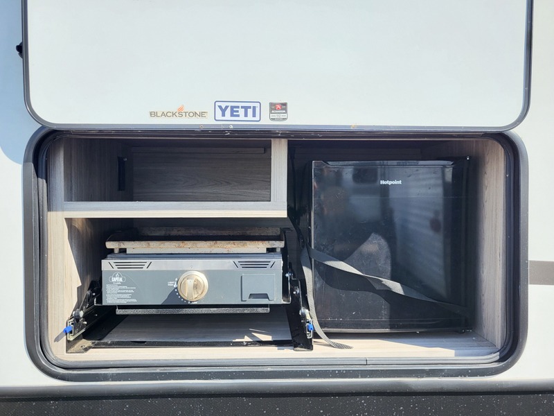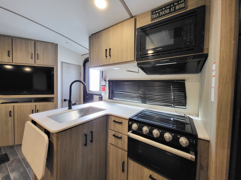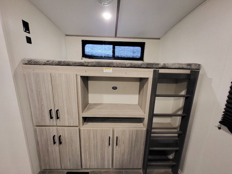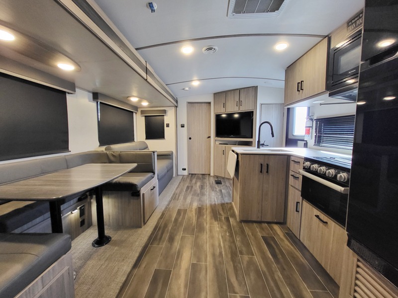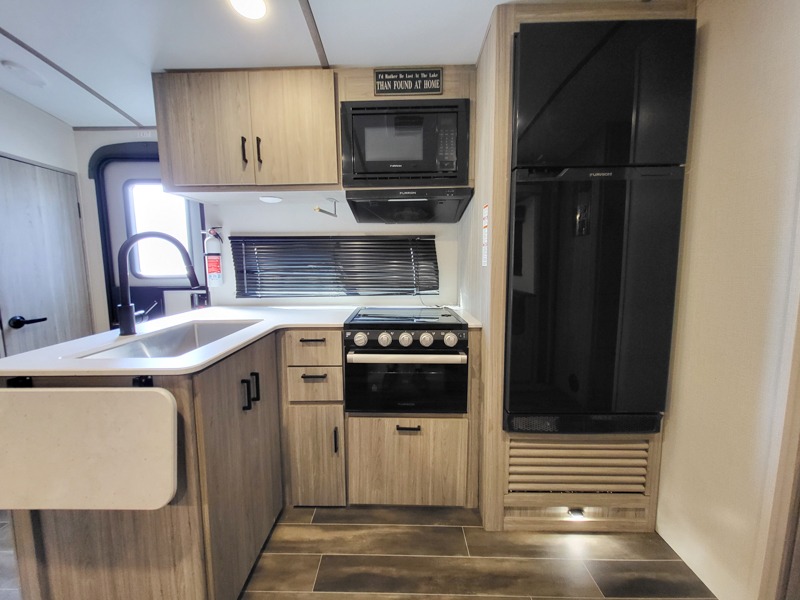 It's a clean decision to choose this travel trailer with a bath and a half! The half bathroom even has one of the dual entry doors to the unit for a quick bathroom break while playing outside. Inside the rear private bunkhouse is a 38" x 74" bunk across from a slide with a 28" x 74" top bunk above two k-cubes. The chef can prepare their best meals with the three burner cooktop and flip-up countertop indoors and outdoors with the outside kitchen that has a pull-out cooktop and refrigerator. Enjoy your meals at the U-shaped dinette and relax on the tri-fold sleeper. You could even swap them out for the optional pivot furniture for versatile living with the ability to flip back and forth between a dinette or sofa option. The walk-in pantry is big enough to store everyone's snacks and the walk-through bathroom is easy to access especially for those staying in the front private bedroom!