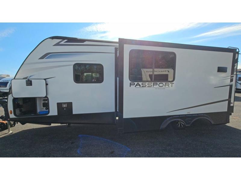 You can take many different kinds of trips with this Passport SL travel trailer! Once you get to the campsite and set up the 19' awning, you can remove your travel gear from the exterior pass-through storage to create your own little retreat. On the interior, the front private bedroom provides you with a queen-size bed, nightstands, and bedside wardrobes so that you can easily get changed every morning and night. The large slide out in the main living area will add to the amount of living space on the interior without adding to the overall width of the trailer. As the night comes to a close, you can heat up a bag of popcorn in the microwave before sitting down in the tri-fold sofa sleeper which could be switched out for the optional theater seating.