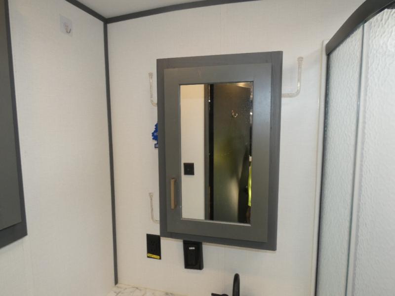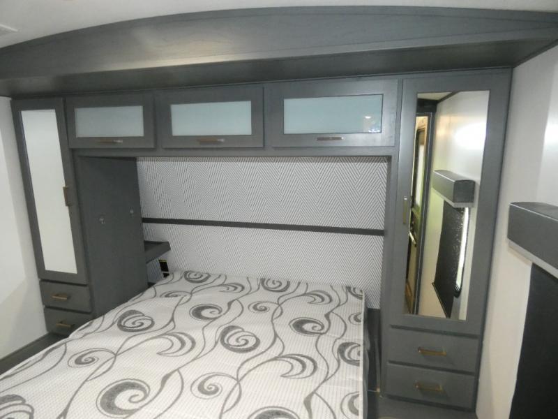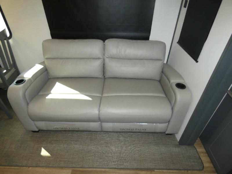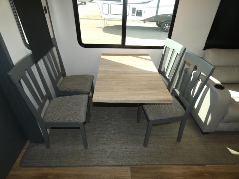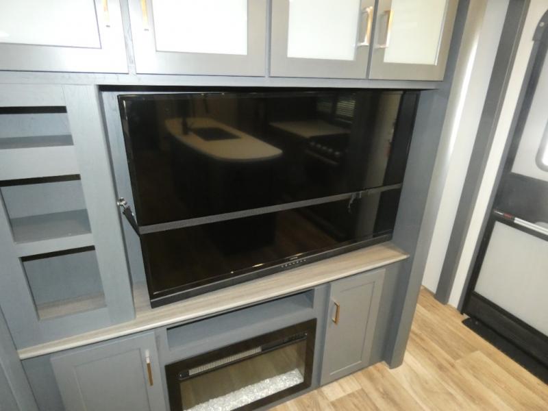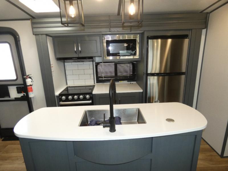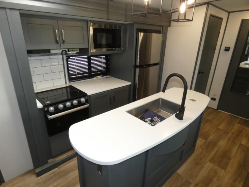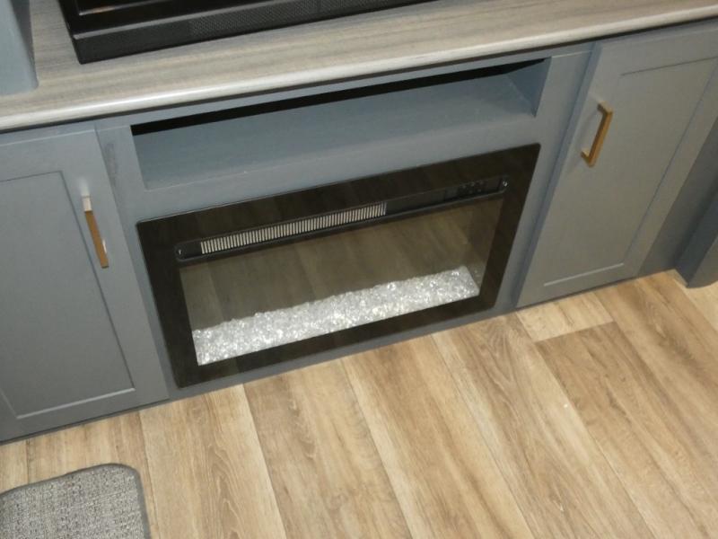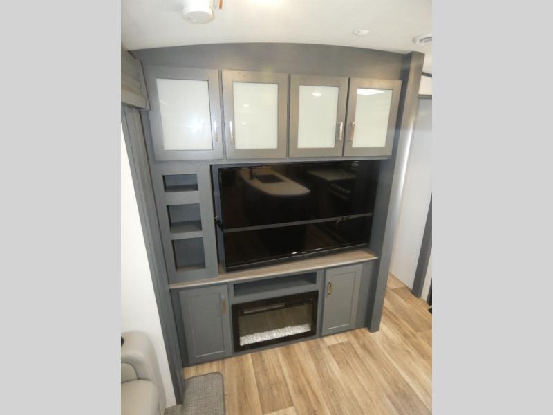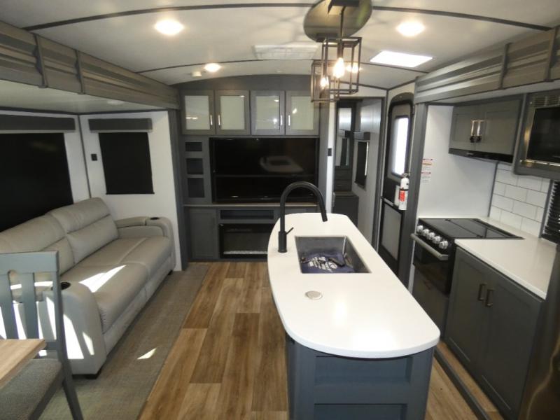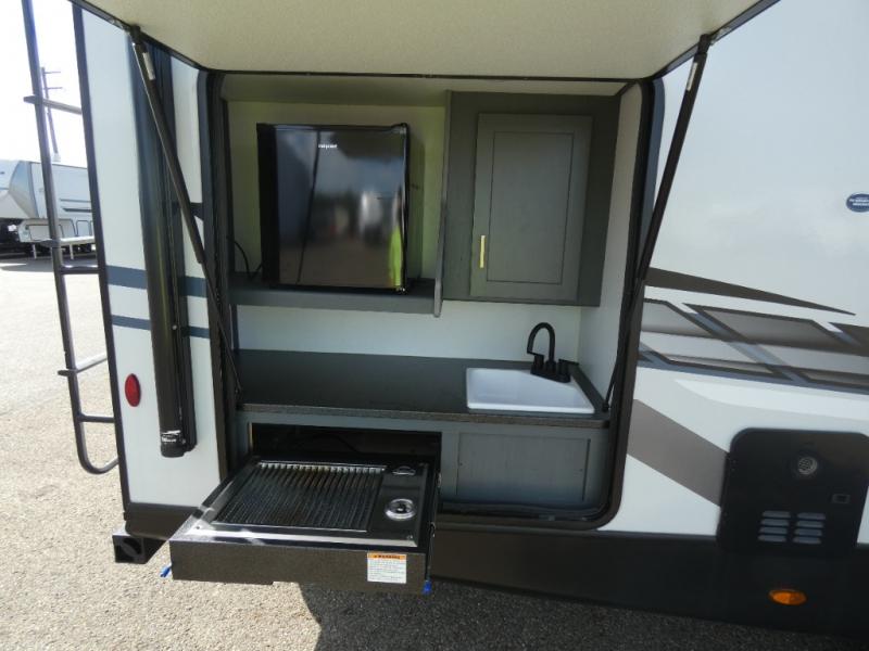 This travel trailer will be your home away from home! It features a front private bedroom with a queen bed that has wardrobes on either side and a laundry chute that leads directly to the exterior pass-through storage area. Take an afternoon nap on the 68" tri-fold sofa or enjoy a fire in the electric fireplace and watch a movie with the LCD TV at the entertainment center. Grab a snack from one of the two pantries and play some card games at the dream dinette. The kitchen island will make meal prepping easier and you can even cook dinner while breathing in some fresh air while you cook at the outside kitchen. There is also a full rear bathroom with a radius shower to rinse the sand out of your hair!