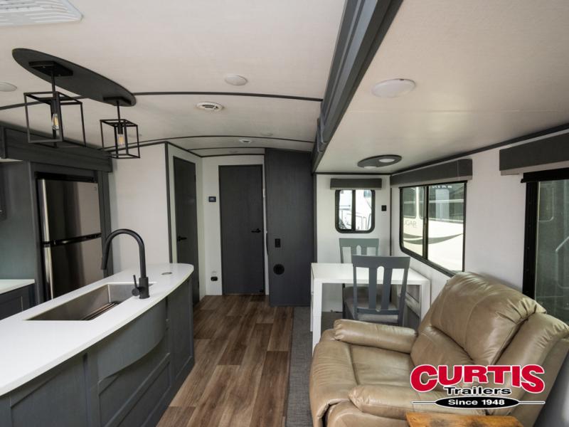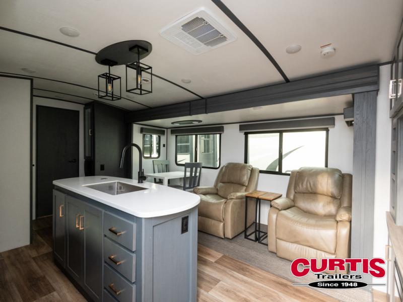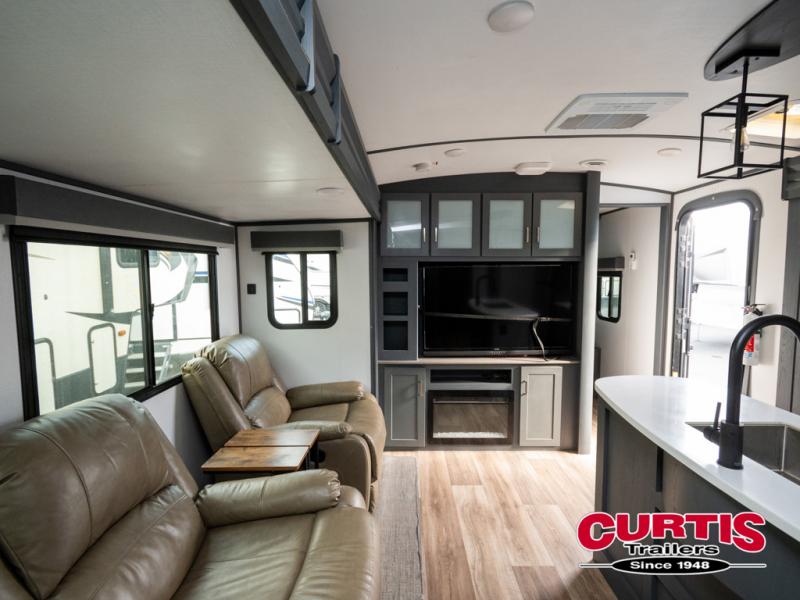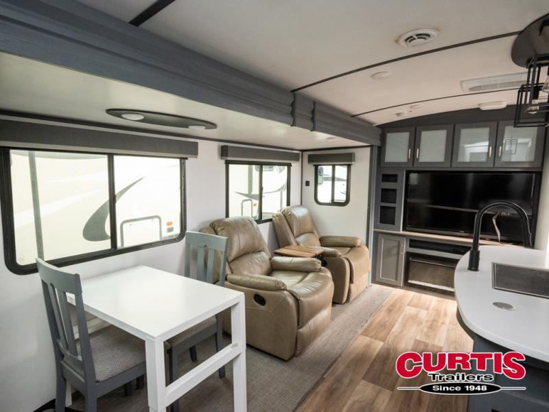 This travel trailer will be your home away from home! It features a front private bedroom with a queen bed that has wardrobes on either side and a laundry chute that leads directly to the exterior pass-through storage area. Take an afternoon nap on the 68" tri-fold sofa or enjoy a fire in the electric fireplace and watch a movie with the LCD TV at the entertainment center. Grab a snack from one of the two pantries and play some card games at the dream dinette. The kitchen island will make meal prepping easier and you can even cook dinner while breathing in some fresh air while you cook at the outside kitchen. There is also a full rear bathroom with a radius shower to rinse the sand out of your hair!