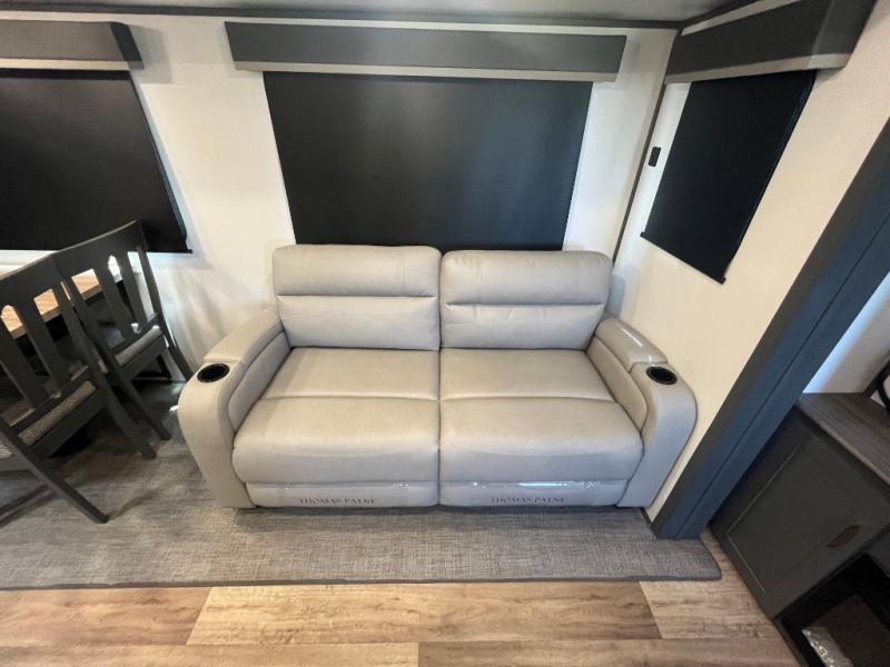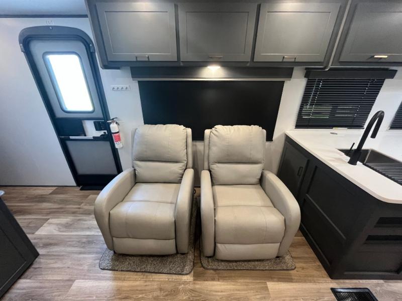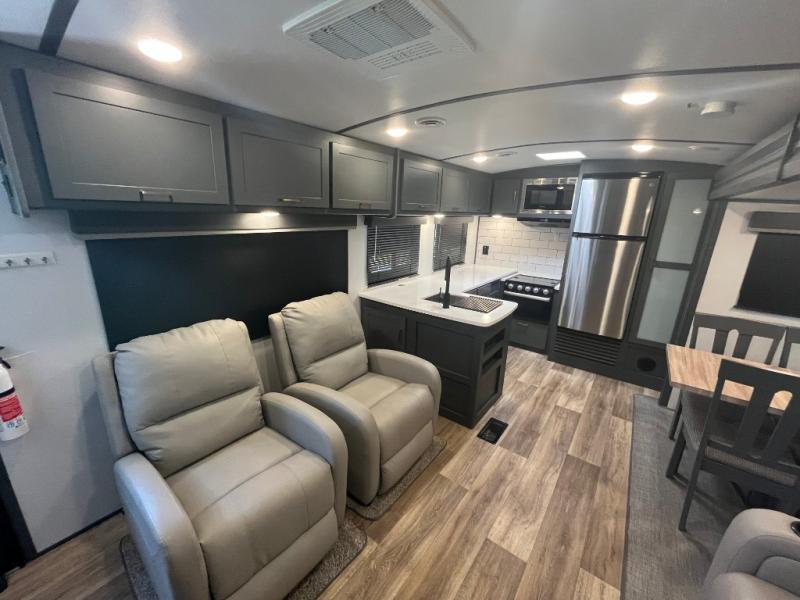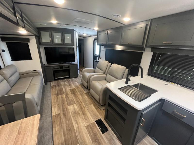Camp in luxury with this travel trailer! The rear kitchen has plenty of countertop space for you to prepare your meals, a three burner Furrion gas range to fry up some bacon, and a 10 cu. ft. refrigerator to keep your perishables fresh. There is even an outside kitchen with a two burner cooktop, a mini refrigerator, a sink, and an overhead cabinet all protected by the 21' electric awning. Enjoy your meals at the dream dinette and relax in either one of the two recliners or on the 68" tri-fold sofa while your stomach settles. The entertainment center has an electric fireplace and a LCD TV for you to watch your favorite movies. When you're ready to wind down your night, take a relaxing shower in the 36" shower and then lay down on the queen bed in the front private bedroom!