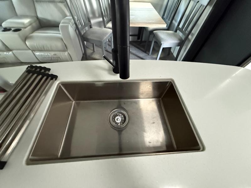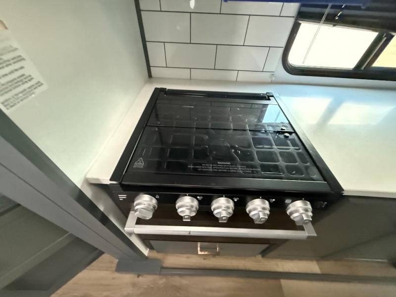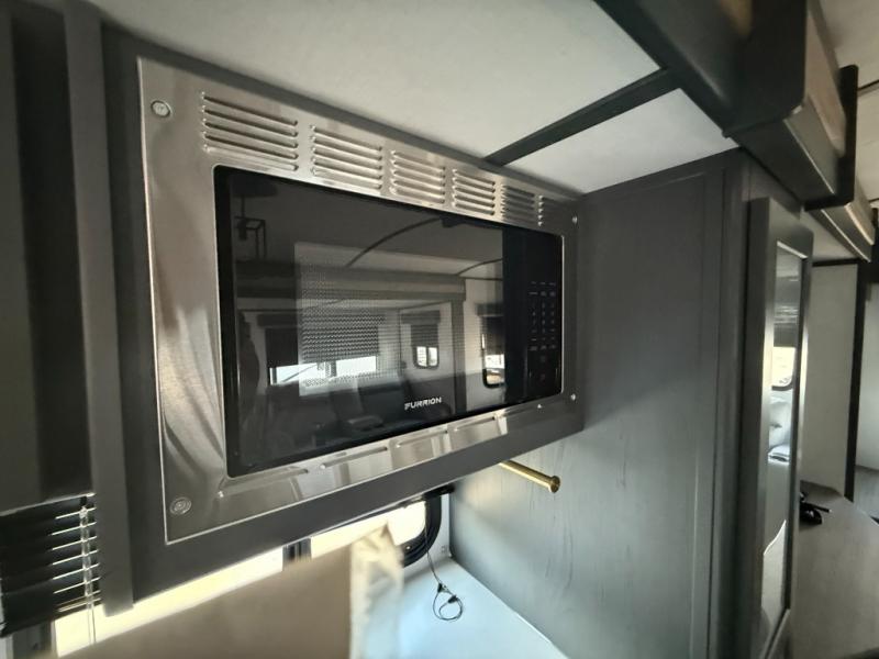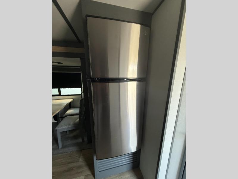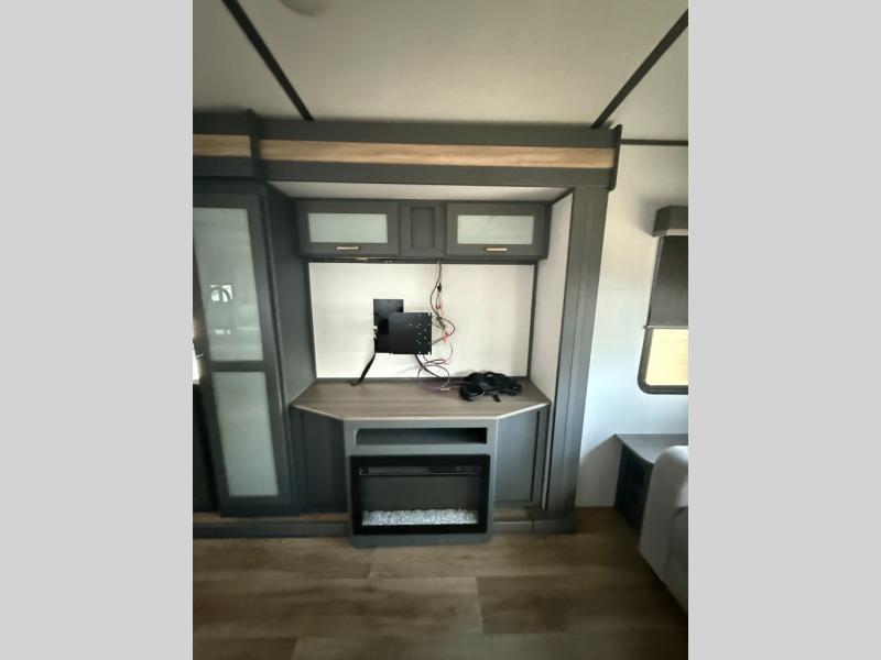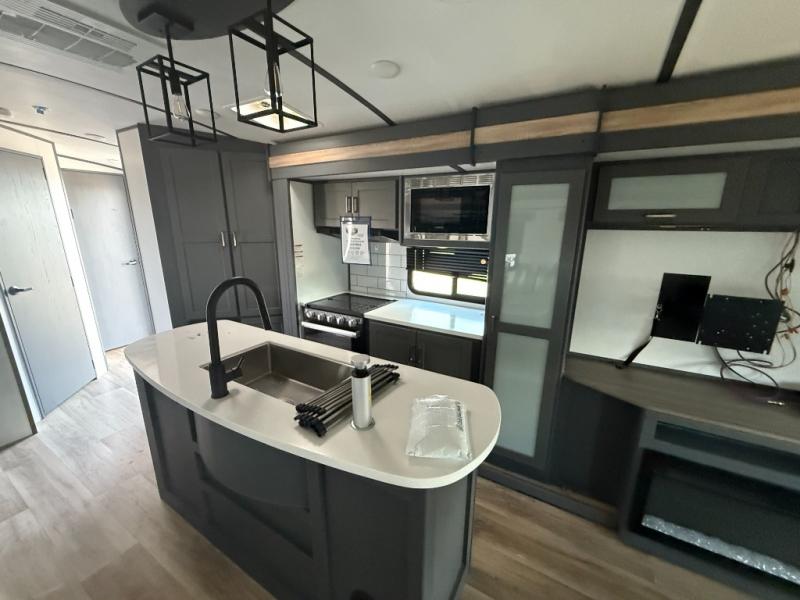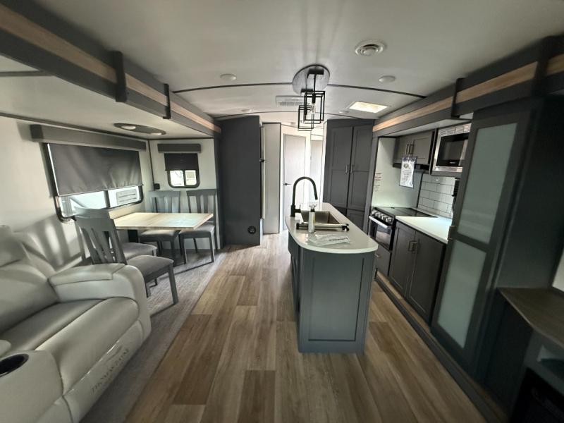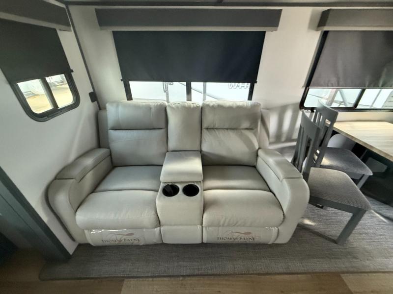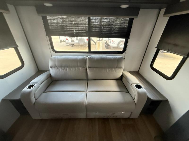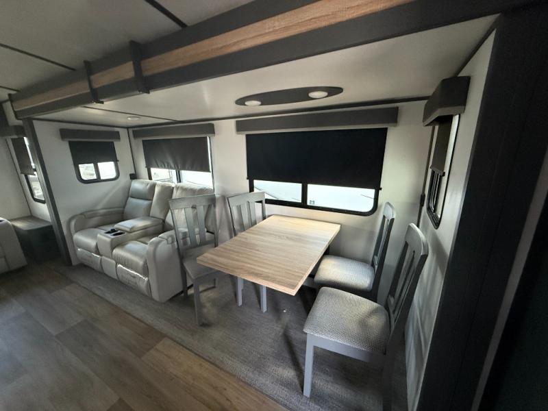 Tow this lightweight travel trailer to your favorite campground! The rear living area has a 68" tri-fold sofa with overhead cabinets and luxury cinema recliners across from the entertainment center with a fireplace and LED TV. Prepare your best home cooked meals with the kitchen island, the three burner Furrion gas range, and the two pantries. The dream dinette is not only great for eating meals and playing card games, but also for transforming into an extra sleeping space. The dual entry bathroom is easy for everyone to access, especially those staying in the front private bedroom. With an outdoor entertainment center, you can watch the big game while breathing in some fresh air and staying protected by the 21' electric awning!