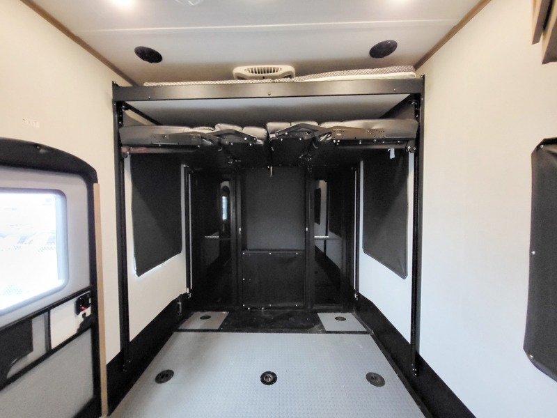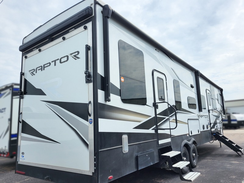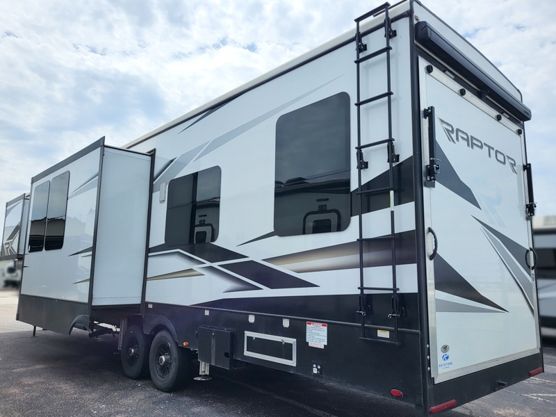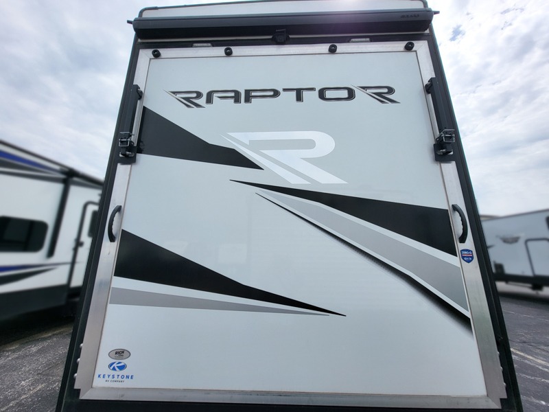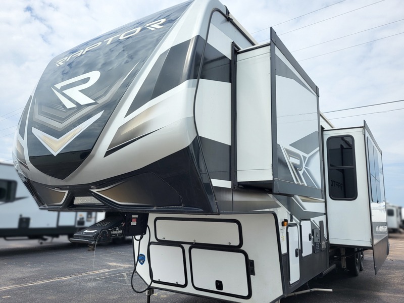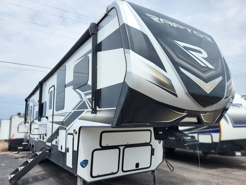Experience a breath of fresh air with one of these Keystone RV Raptor fifth wheel toy haulers! Their rugged construction consists of a walkable one-piece Alpha Super Flex TPO roof with aluminum flashing, G-rated tires, Dyna Span floor decking, and 5,000 lb. frame-welded tie downs to keep your toys in place as you travel. With an on-demand water heater, you can have an endless amount of hot water when you need it. Some unexpected conveniences you will appreciate include an Omni-Chill A/C system to keep you cool on those hot summer days, a Furrion backup camera and HitchVision to prevent damages, and a Generation 3 iN-Command smart automation system with Global Connect to make life easier. Soft-close hardwood cabinetry makes for a quiet closure to enjoy undetected late night snacking, and the MORryde zero-gravity ramp door makes it easy to load and unload your toys. Come find the right one for you today!