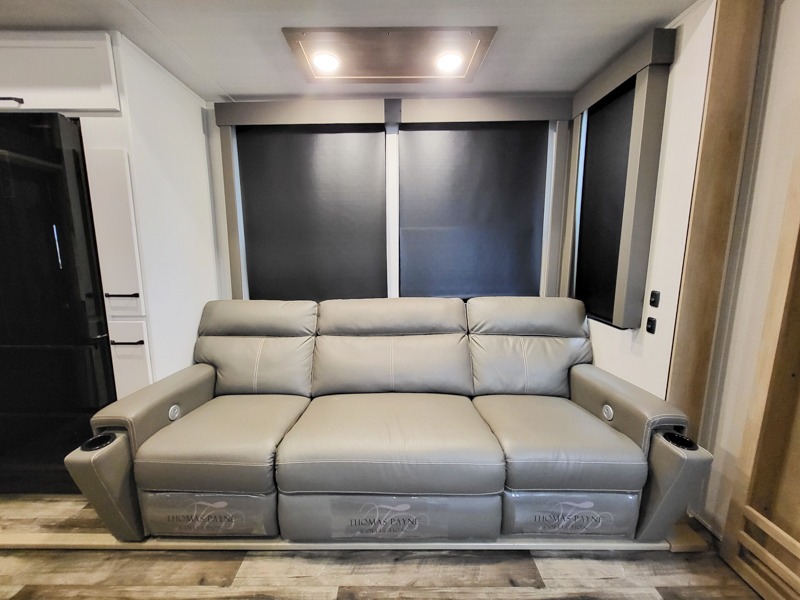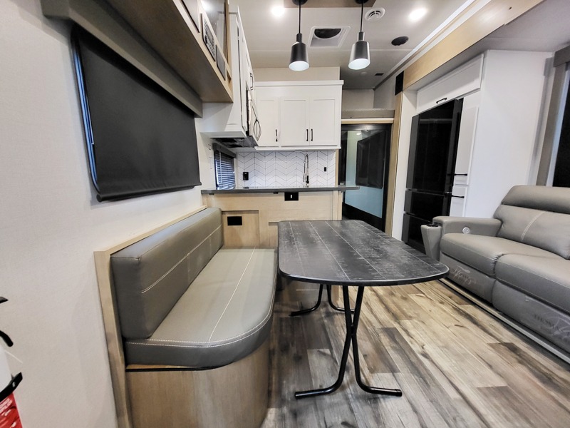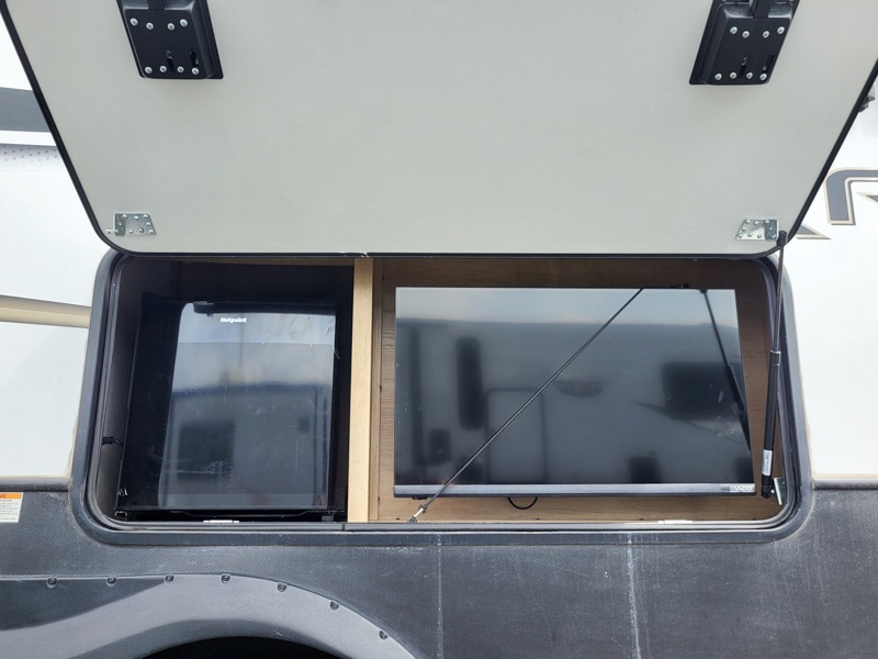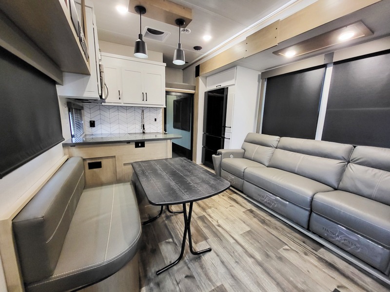 You won't want to camp any other way once you step inside this toy hauler! It features a front private bedroom with a residential queen bed that can be switched for an optional Raptor king bed. There are also wireless phone chargers on either side of the bed, a wardrobe slide, and an entrance into the dual entry bathroom. Prepare your best home cooked meals with the U-shaped kitchen then enjoy them at either the dinette with one sided booth seating or the dual opposing sofas with a table in between in the 13' garage area. The garage also has an electric bed above the sofas and a loft with a twin bed above an area prepped to add an optional washer and dryer. Exit the garage with one of the dual entry doors to the unit and then grab a cold drink from the outside mini fridge and watch the big game on the exterior TV while staying protected by the two 18' electric awnings!