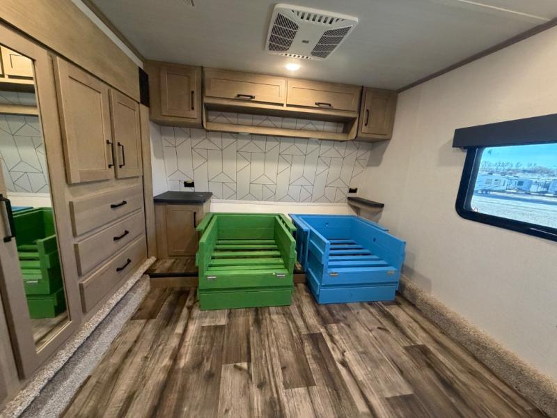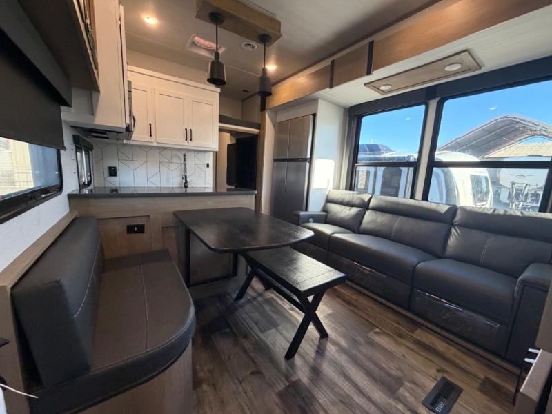 You won't want to camp any other way once you step inside this toy hauler! It features a front private bedroom with a residential queen bed that can be switched for an optional Raptor king bed. There are also wireless phone chargers on either side of the bed, a wardrobe slide, and an entrance into the dual entry bathroom. Prepare your best home cooked meals with the U-shaped kitchen then enjoy them at either the dinette with one sided booth seating or the dual opposing sofas with a table in between in the 13' garage area. The garage also has an electric bed above the sofas and a loft with a twin bed above an area prepped to add an optional washer and dryer. Exit the garage with one of the dual entry doors to the unit and then grab a cold drink from the outside mini fridge and watch the big game on the exterior TV while staying protected by the two 18' electric awnings!