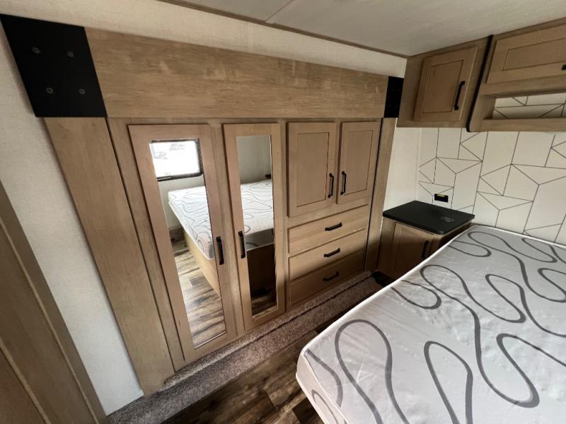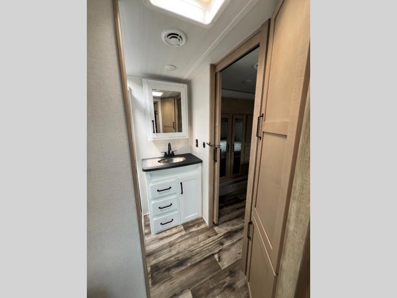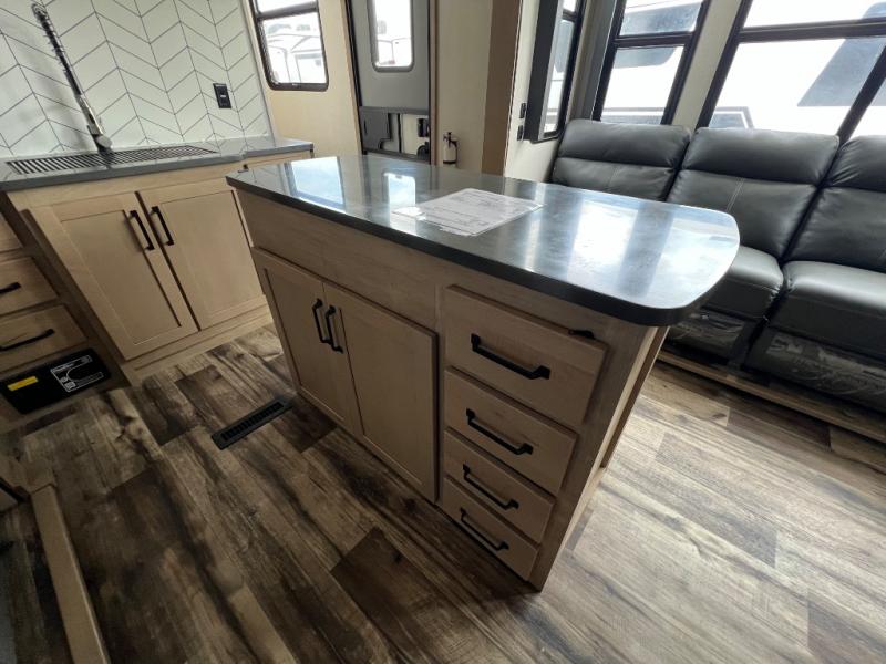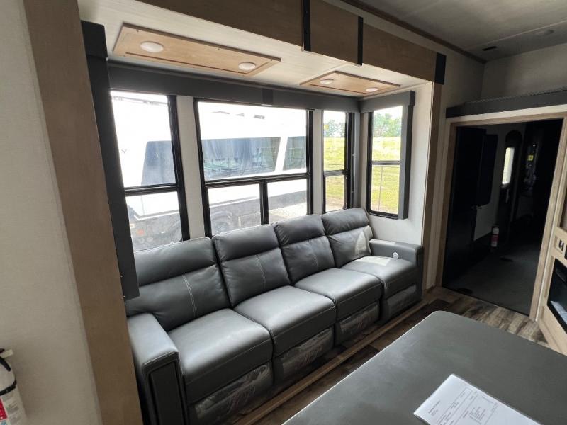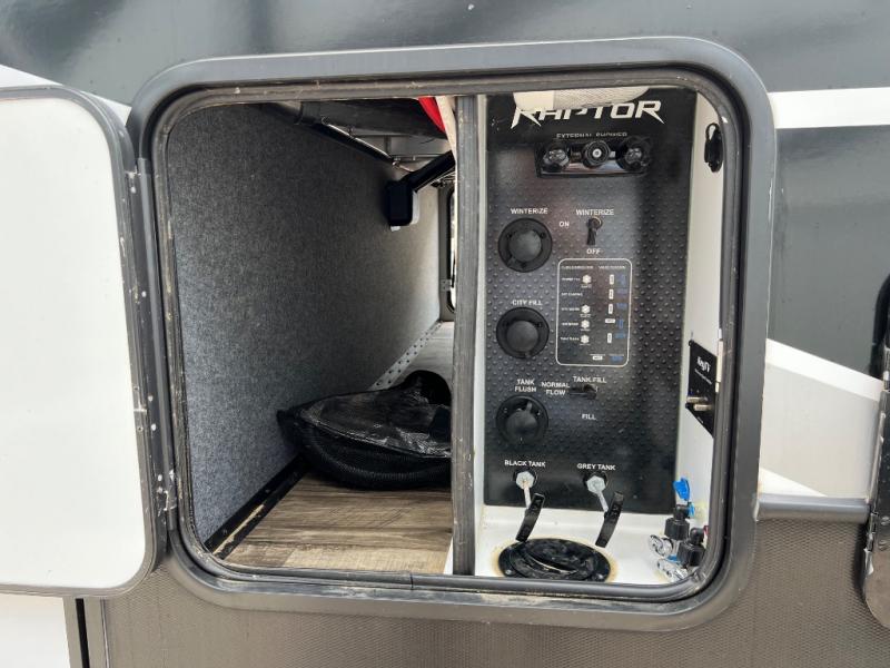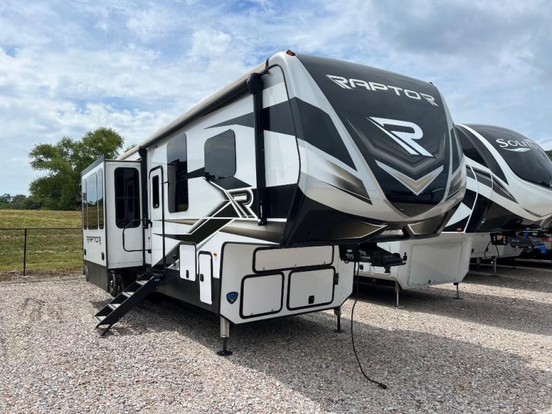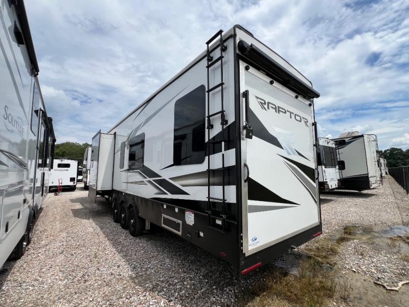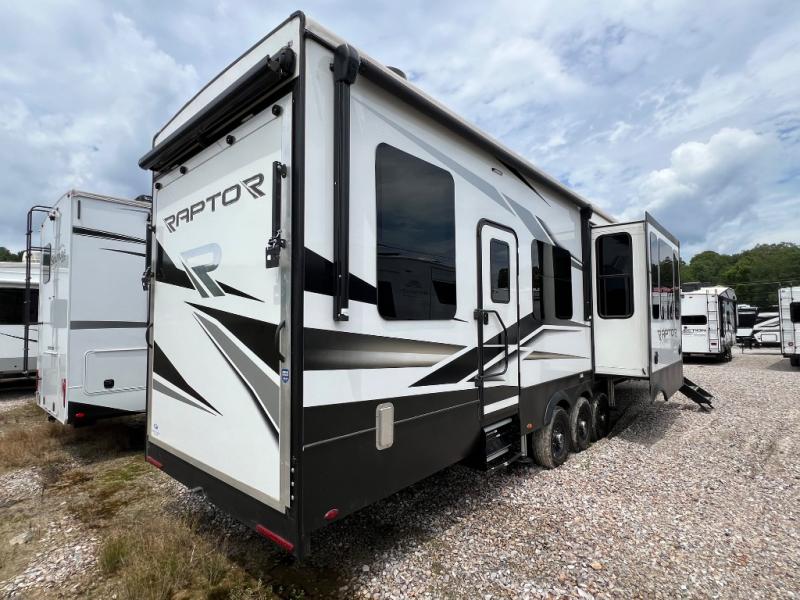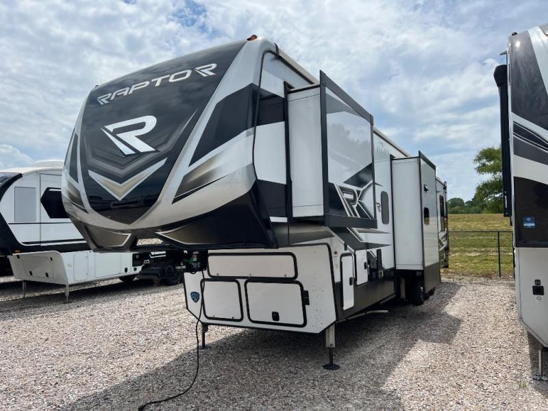 Experience a breath of fresh air with one of these Keystone RV Raptor fifth wheel toy haulers! Their rugged construction consists of a walkable one-piece Alpha Super Flex TPO roof with aluminum flashing, G-rated tires, Dyna Span floor decking, and 5,000 lb. frame-welded tie downs to keep your toys in place as you travel. With an on-demand water heater, you can have an endless amount of hot water when you need it. Some unexpected conveniences you will appreciate include an Omni-Chill A/C system to keep you cool on those hot summer days, a Furrion backup camera and HitchVision to prevent damages, and a Generation 3 iN-Command smart automation system with Global Connect to make life easier. Soft-close hardwood cabinetry makes for a quiet closure to enjoy undetected late night snacking, and the MORryde zero-gravity ramp door makes it easy to load and unload your toys. Come find the right one for you today!