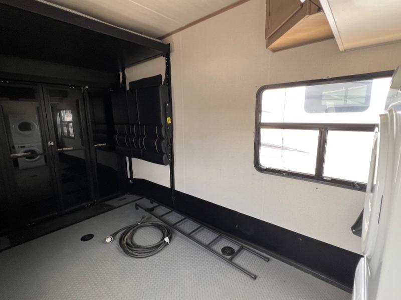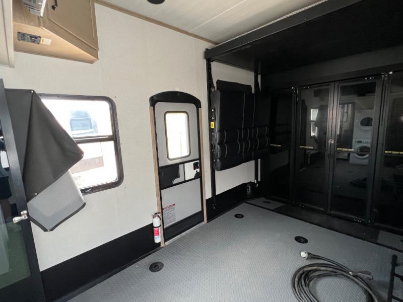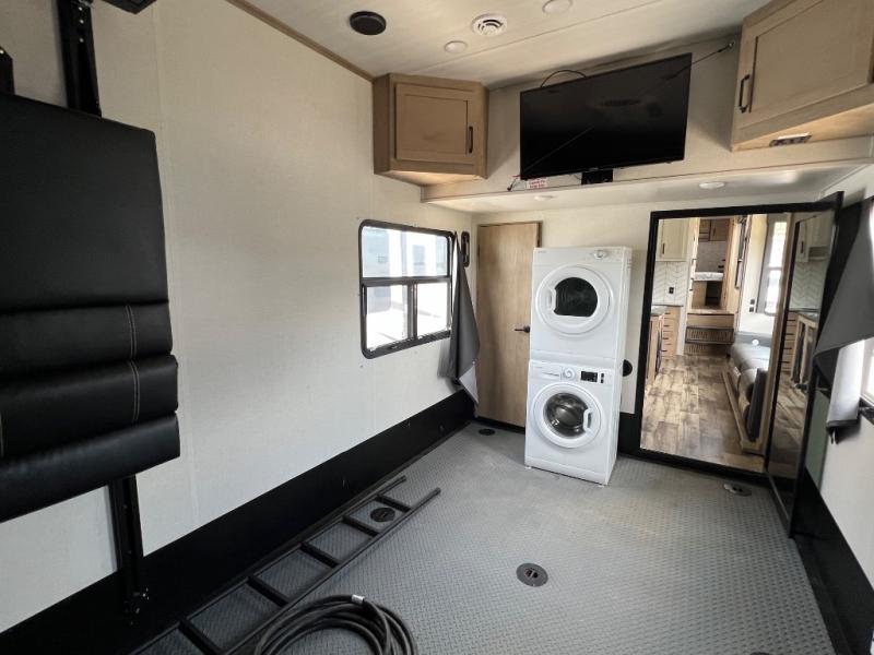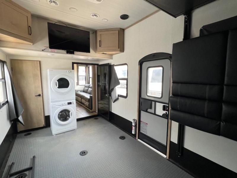 You will have everything you need for a comfortable camping trip and then some with this toy hauler! Load your toys into the 15' garage area with the zero gravity ramp door and secure them with the 5,000 lb. frame welded tie-downs. The garage also has an electric bed above dual opposing sofas with a table in between, a loft with a twin bed, a half bathroom, and an area prepped to add an optional washer and dryer. Create your best meals with the three burner cooktop and enjoy the company of others sitting at the kitchen island with two flip-up bar stools while you prepare it. Relax in true comfort on the 4-seat recliner across from the entertainment center with a fireplace. When you're ready to wind down your nights, take a hot shower in the dual entry bathroom then head directly into the front private bedroom which has a residential queen bed with wireless phone chargers on either side and a wardrobe slide to store your clothes!